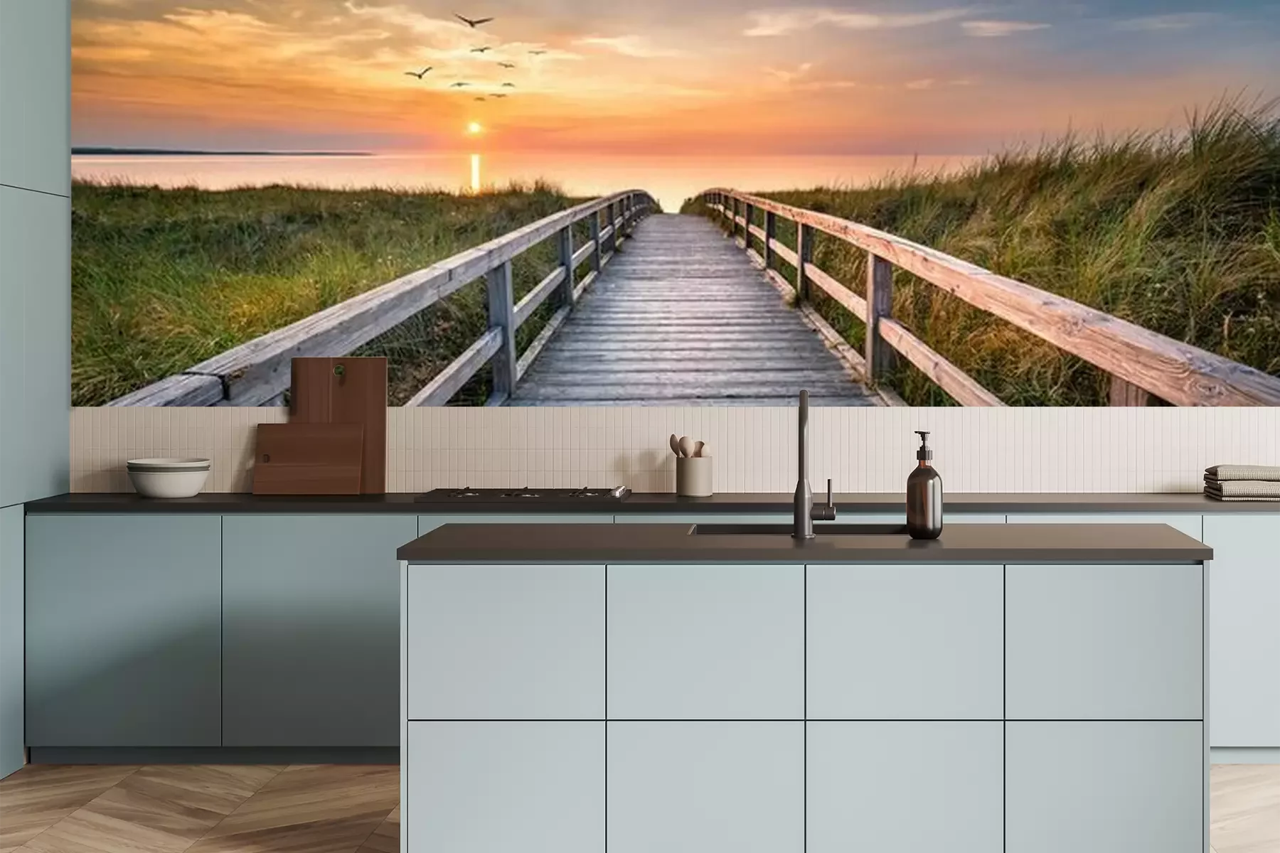 Het materiaal Premium is een glad vinyl op vlies, dat bestand is tegen uitrekken en vervorming. Het is dampdoorlatend – de muren kunnen vrij ademen – waardoor het geschikt is voor gebruik in de keuken en badkamer. Bij vervuiling kan het materiaal worden afgenomen met een vochtige doek. De maximale breedte van één baan bedraagt 95 of 105 cm, afhankelijk van de beschikbaarheid. Montage vindt plaats met de rand-aan-rand methode, wat een esthetisch resultaat zonder zichtbare naden oplevert. Omdat de lijm rechtstreeks op de muur wordt aangebracht, verloopt de installatie van het fotobehang snel en eenvoudig.