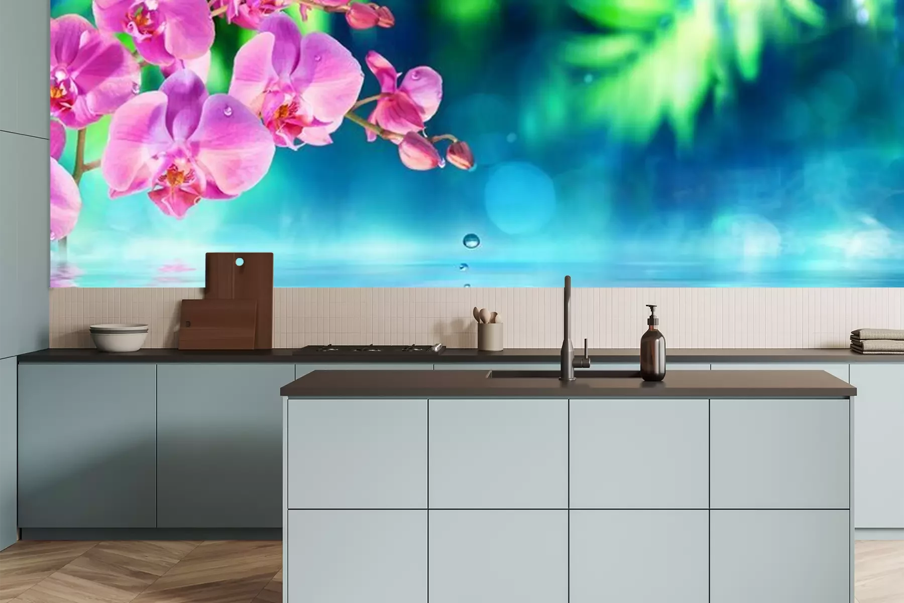 Het materiaal Premium is een glad vinyl op vlies, dat bestand is tegen uitrekken en vervorming. Het is dampdoorlatend – de muren kunnen vrij ademen – waardoor het geschikt is voor gebruik in de keuken en badkamer. Bij vervuiling kan het materiaal worden afgenomen met een vochtige doek. De maximale breedte van één baan bedraagt 95 of 105 cm, afhankelijk van de beschikbaarheid. Montage vindt plaats met de rand-aan-rand methode, wat een esthetisch resultaat zonder zichtbare naden oplevert. Omdat de lijm rechtstreeks op de muur wordt aangebracht, verloopt de installatie van het fotobehang snel en eenvoudig.