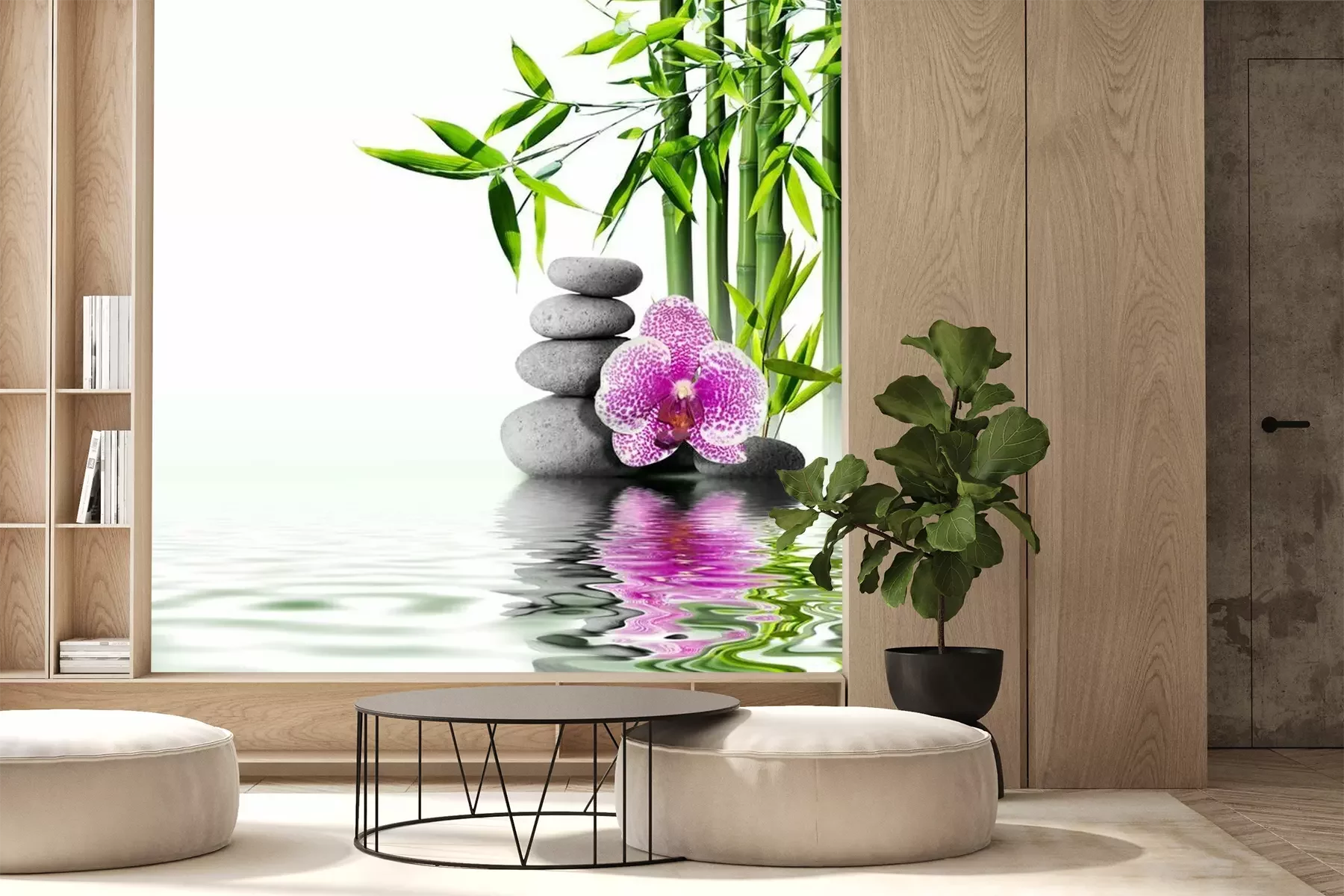 Paarse orchidee en bamboe op waterFotobehang