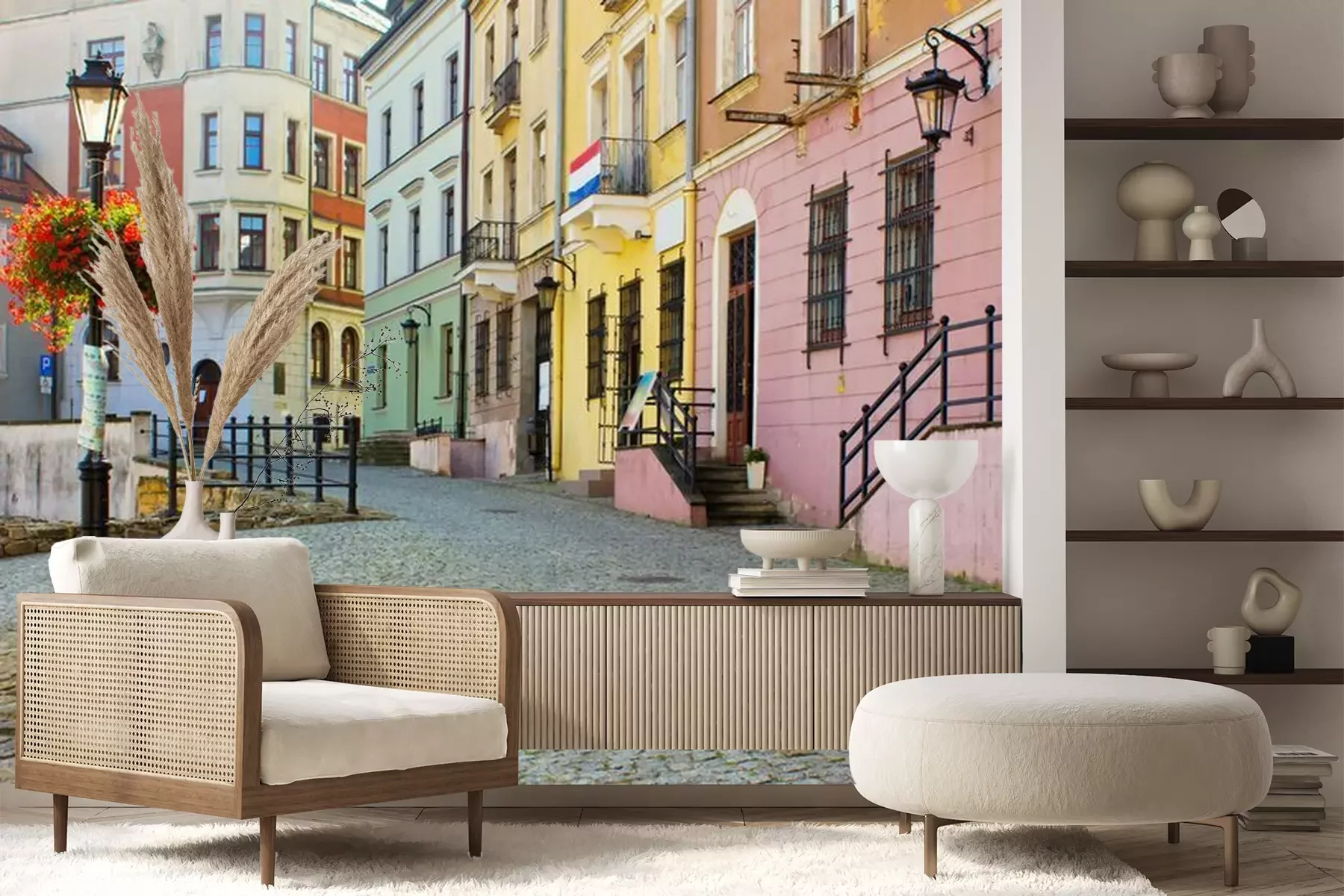 Het materiaal Premium+ is een gestructureerd vinyl op vlies met een gewicht van 255 g/m², dat kleine oneffenheden in de muur effectief camoufleert. De subtiele structuur van fijn zand geeft het oppervlak een exclusieve uitstraling, terwijl de halfmatte afwerking de diepte van de kleuren benadrukt. Het materiaal is dampdoorlatend, waardoor het ook in de keuken en badkamer kan worden gebruikt. De maximale breedte van één baan bedraagt 100 cm – bij grotere afmetingen wordt het fotobehang in meerdere gelijke banen verdeeld. De lijm wordt direct op de muur aangebracht en het behang wordt rand-aan-rand geplakt, wat zorgt voor een esthetisch resultaat zonder zichtbare naden. Het oppervlak kan gemakkelijk worden schoongemaakt door het voorzichtig af te nemen met een vochtige doek.