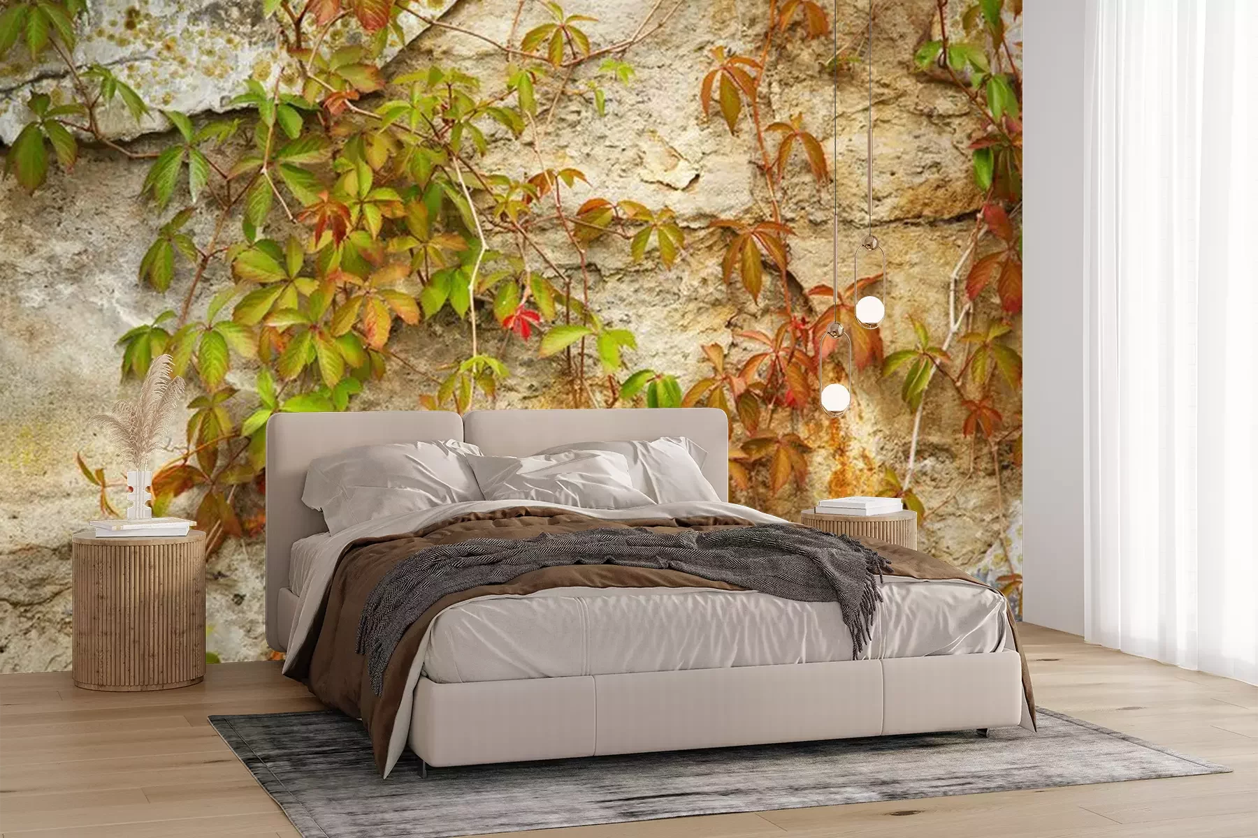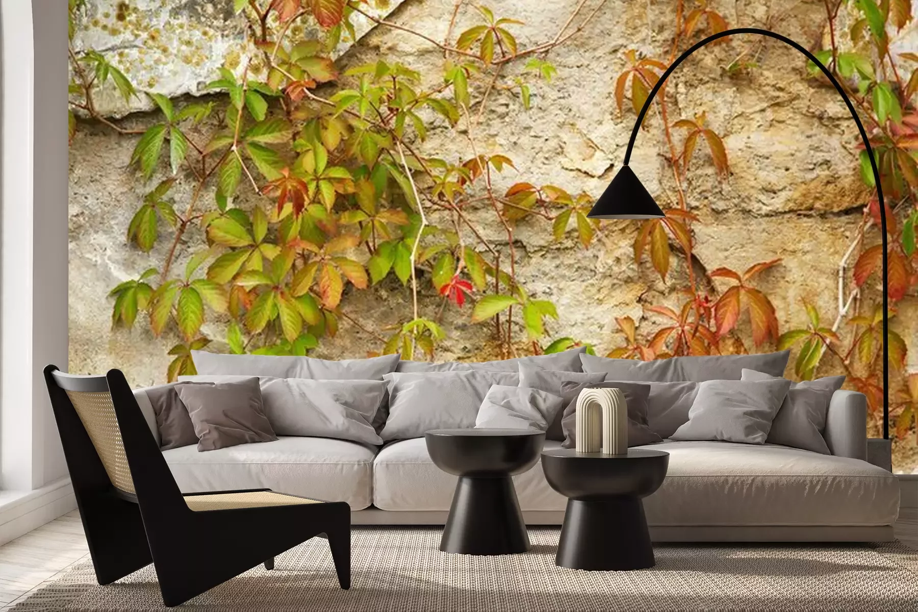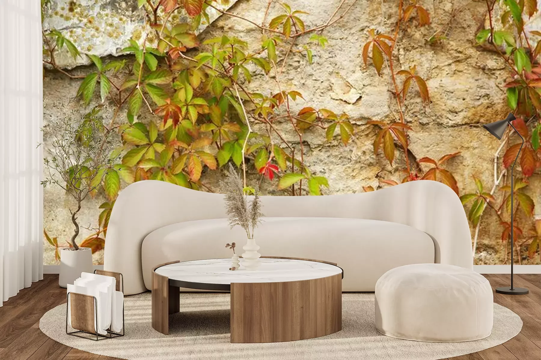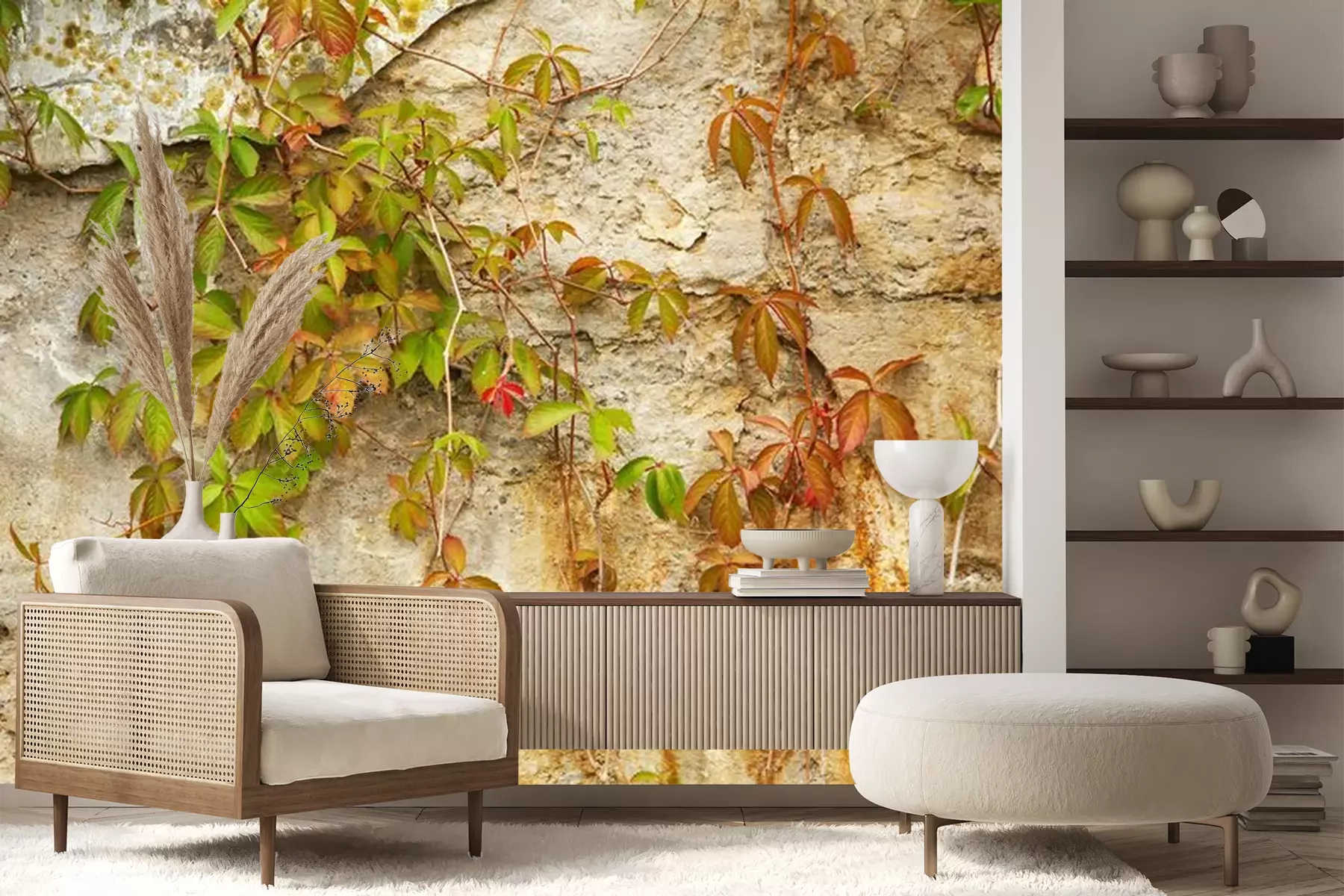Fotobehang Oude stenen muur bedekt groene plant