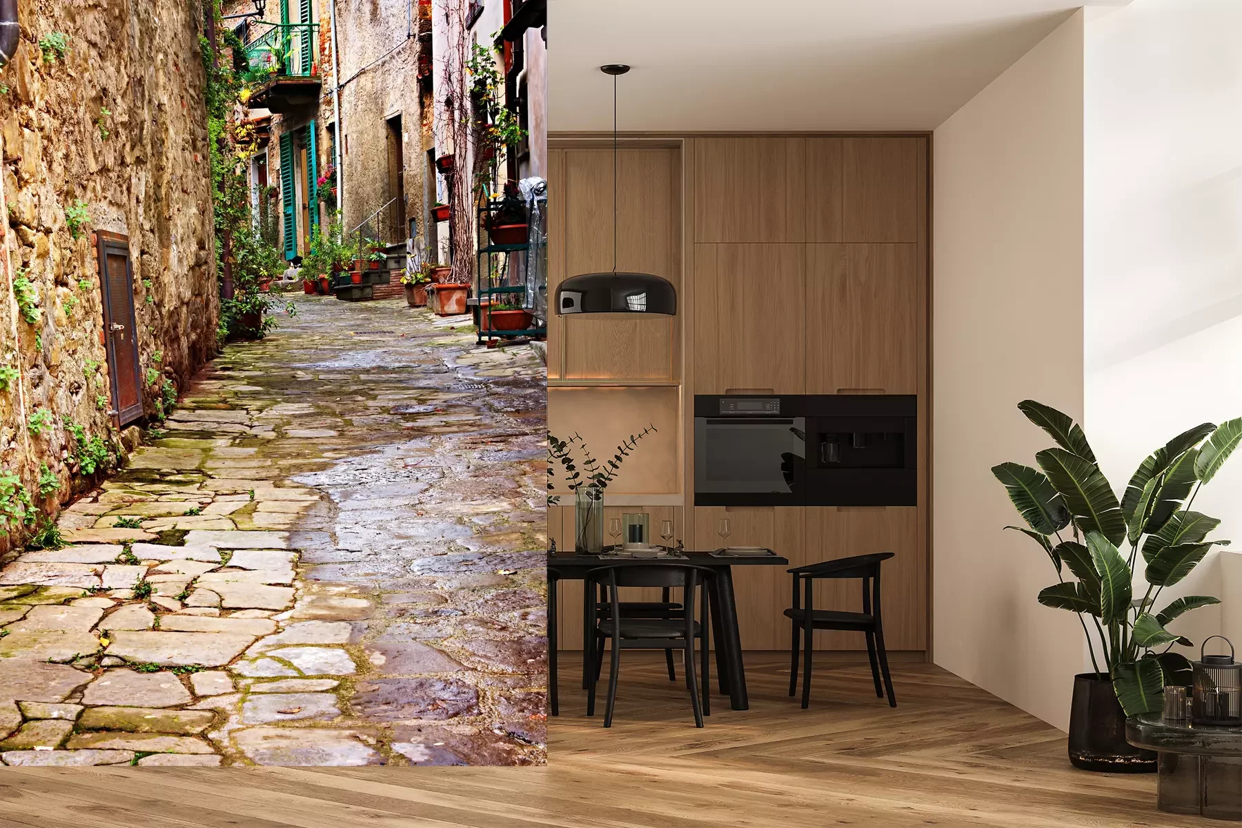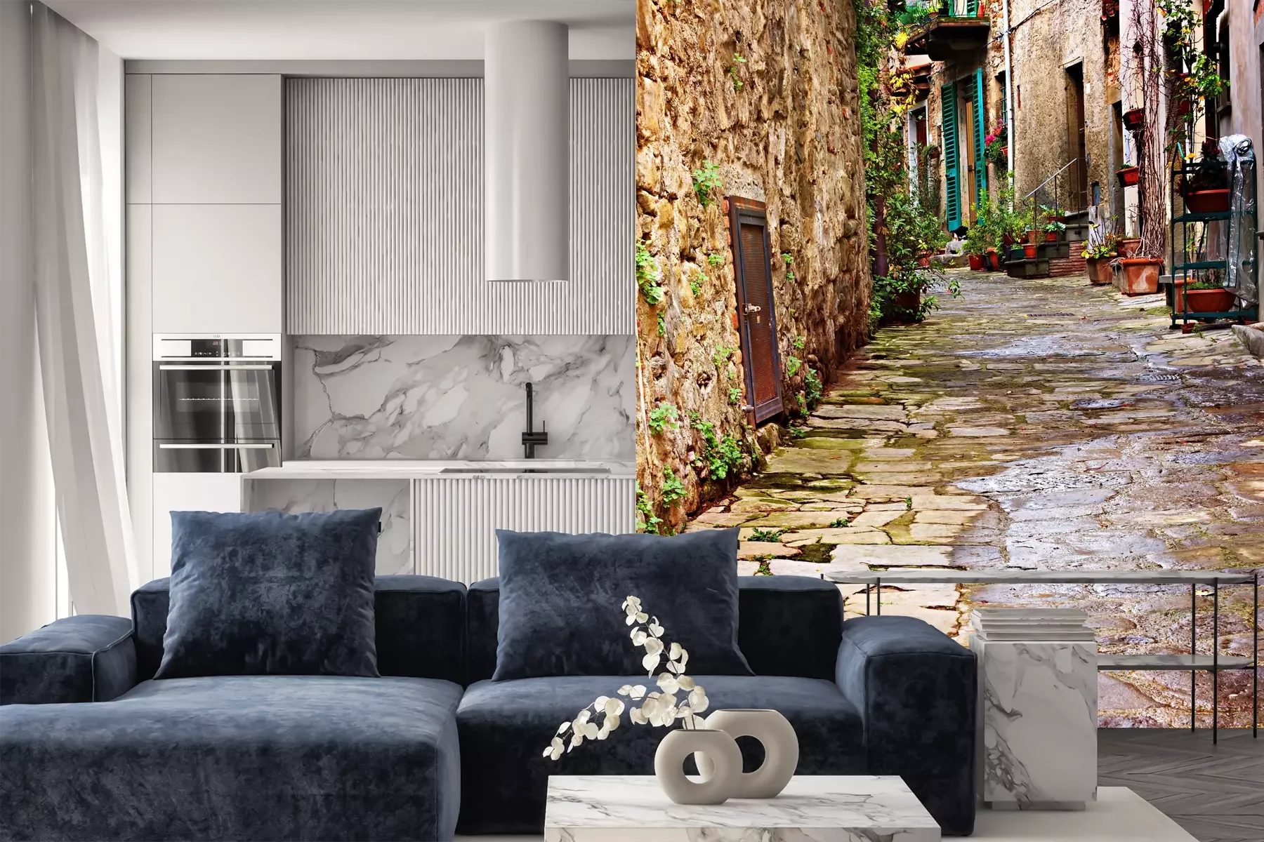 Het materiaal Premium is een glad vinyl op vlies, dat bestand is tegen uitrekken en vervorming. Het is dampdoorlatend – de muren kunnen vrij ademen – waardoor het geschikt is voor gebruik in de keuken en badkamer. Bij vervuiling kan het materiaal worden afgenomen met een vochtige doek. De maximale breedte van één baan bedraagt 95 of 105 cm, afhankelijk van de beschikbaarheid. Montage vindt plaats met de rand-aan-rand methode, wat een esthetisch resultaat zonder zichtbare naden oplevert. Omdat de lijm rechtstreeks op de muur wordt aangebracht, verloopt de installatie van het fotobehang snel en eenvoudig.