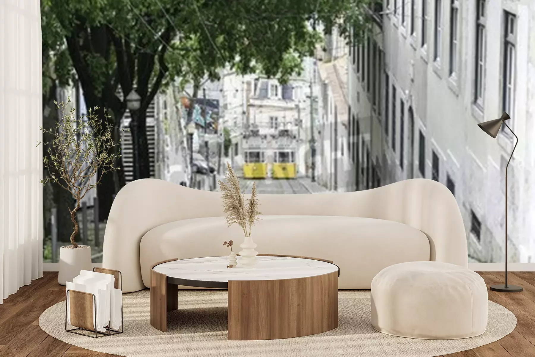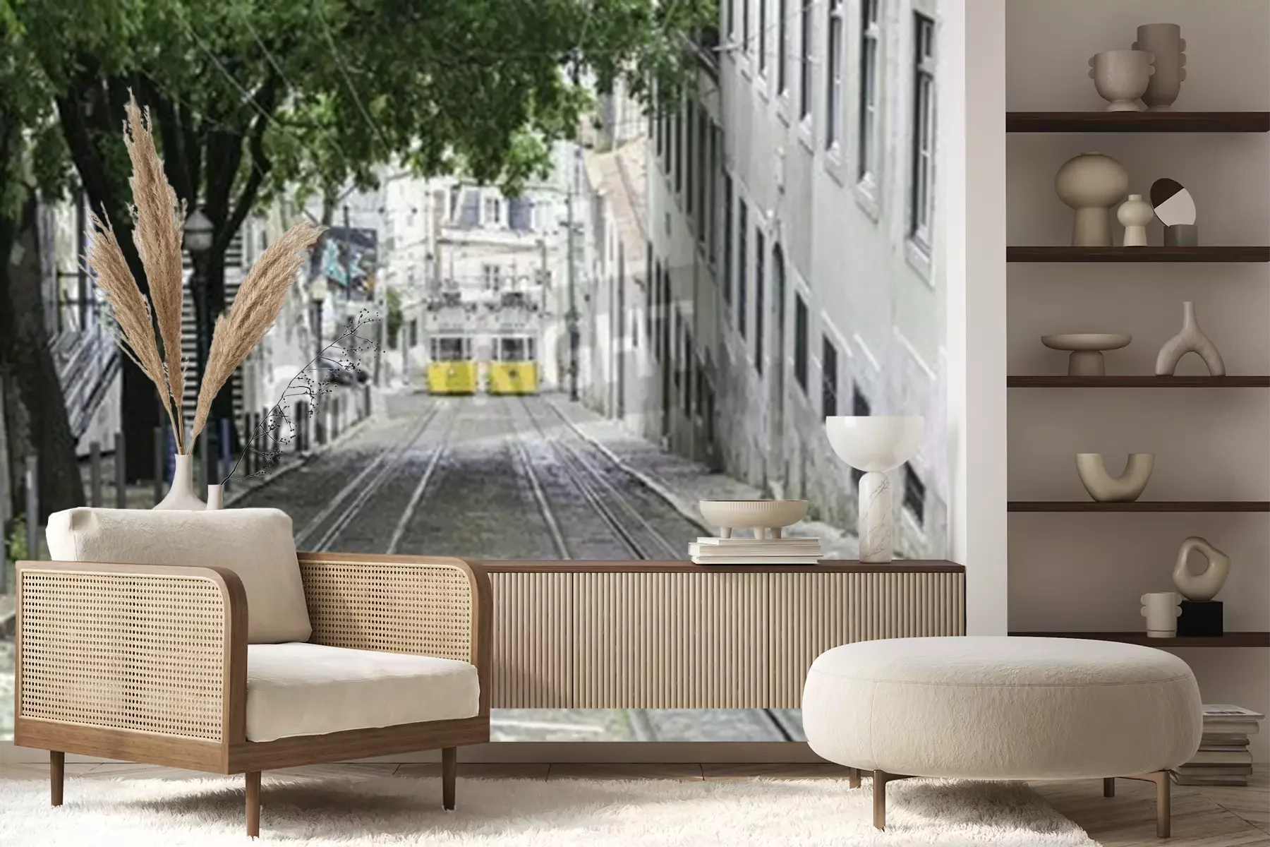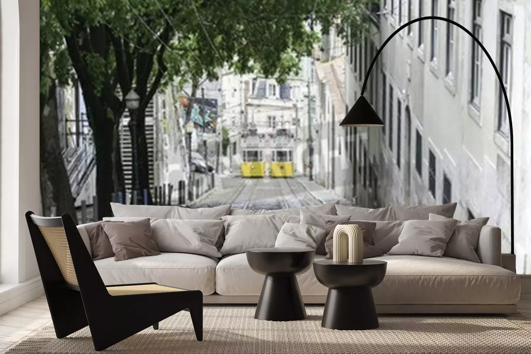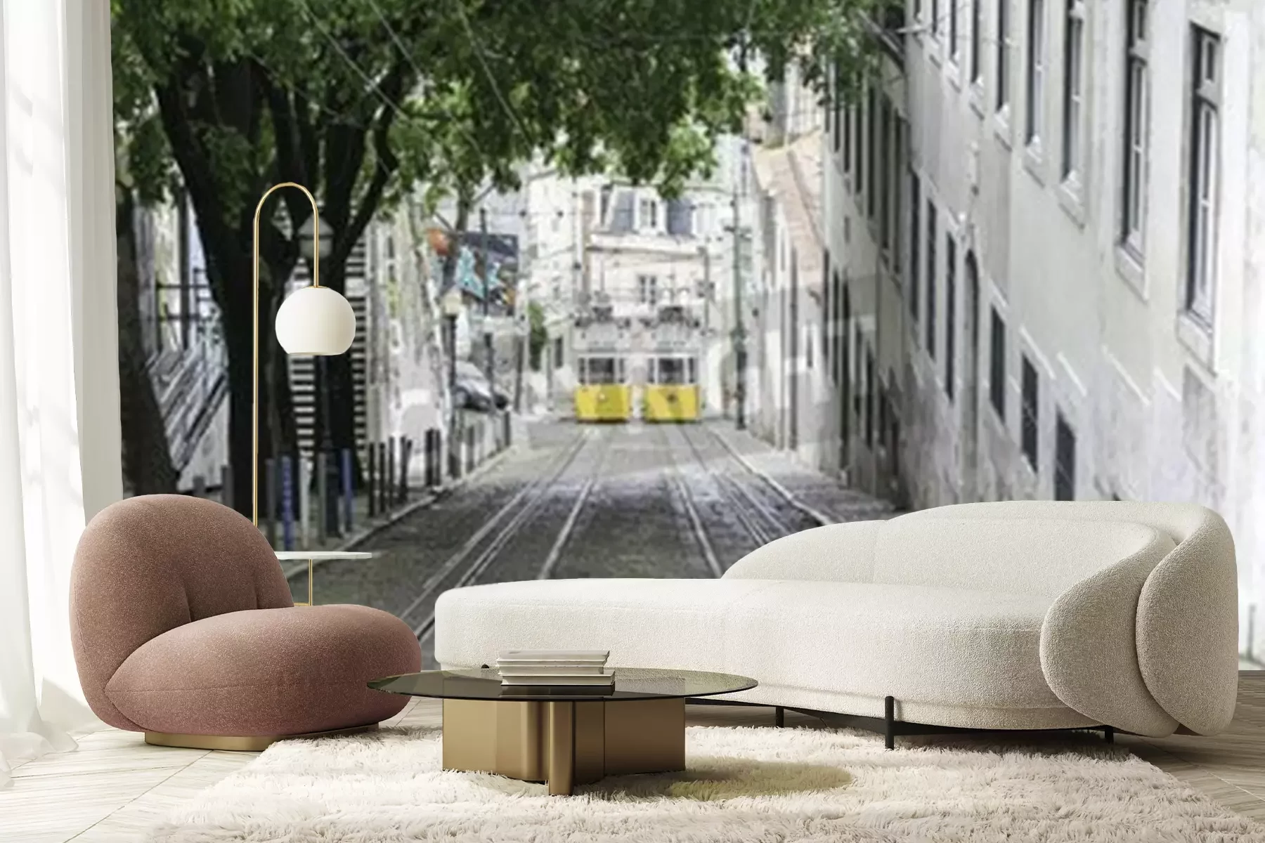 Fotobehang Oude trams in Lissabon, detail van een oude vervoer stad, oude kunst, het toerisme in de stad