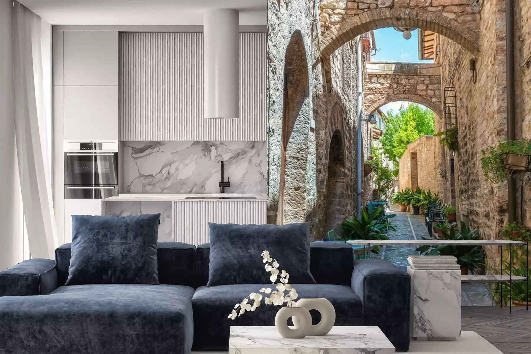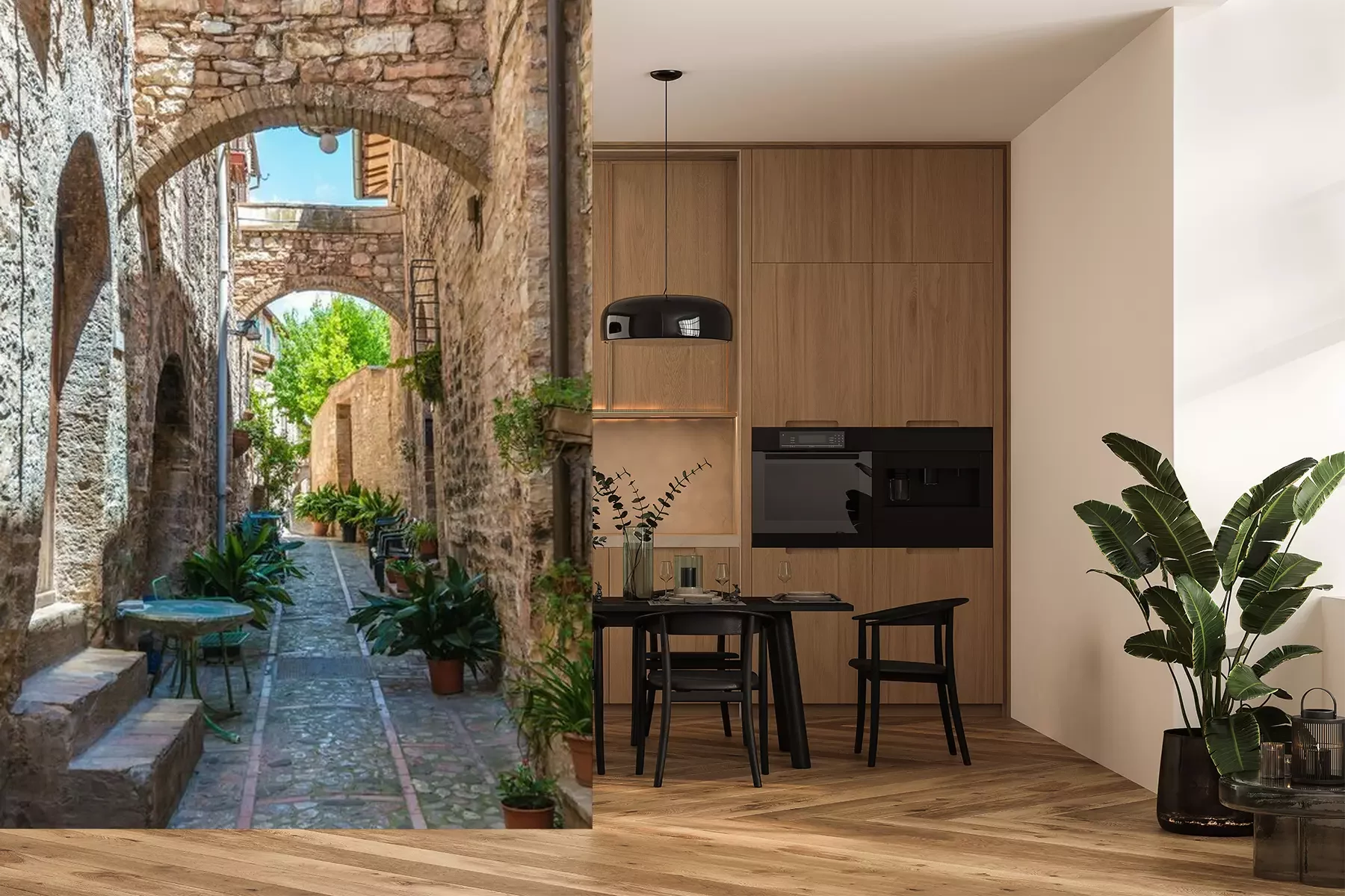 Het materiaal Premium is een glad vinyl op vlies, dat bestand is tegen uitrekken en vervorming. Het is dampdoorlatend – de muren kunnen vrij ademen – waardoor het geschikt is voor gebruik in de keuken en badkamer. Bij vervuiling kan het materiaal worden afgenomen met een vochtige doek. De maximale breedte van één baan bedraagt 95 of 105 cm, afhankelijk van de beschikbaarheid. Montage vindt plaats met de rand-aan-rand methode, wat een esthetisch resultaat zonder zichtbare naden oplevert. Omdat de lijm rechtstreeks op de muur wordt aangebracht, verloopt de installatie van het fotobehang snel en eenvoudig.
