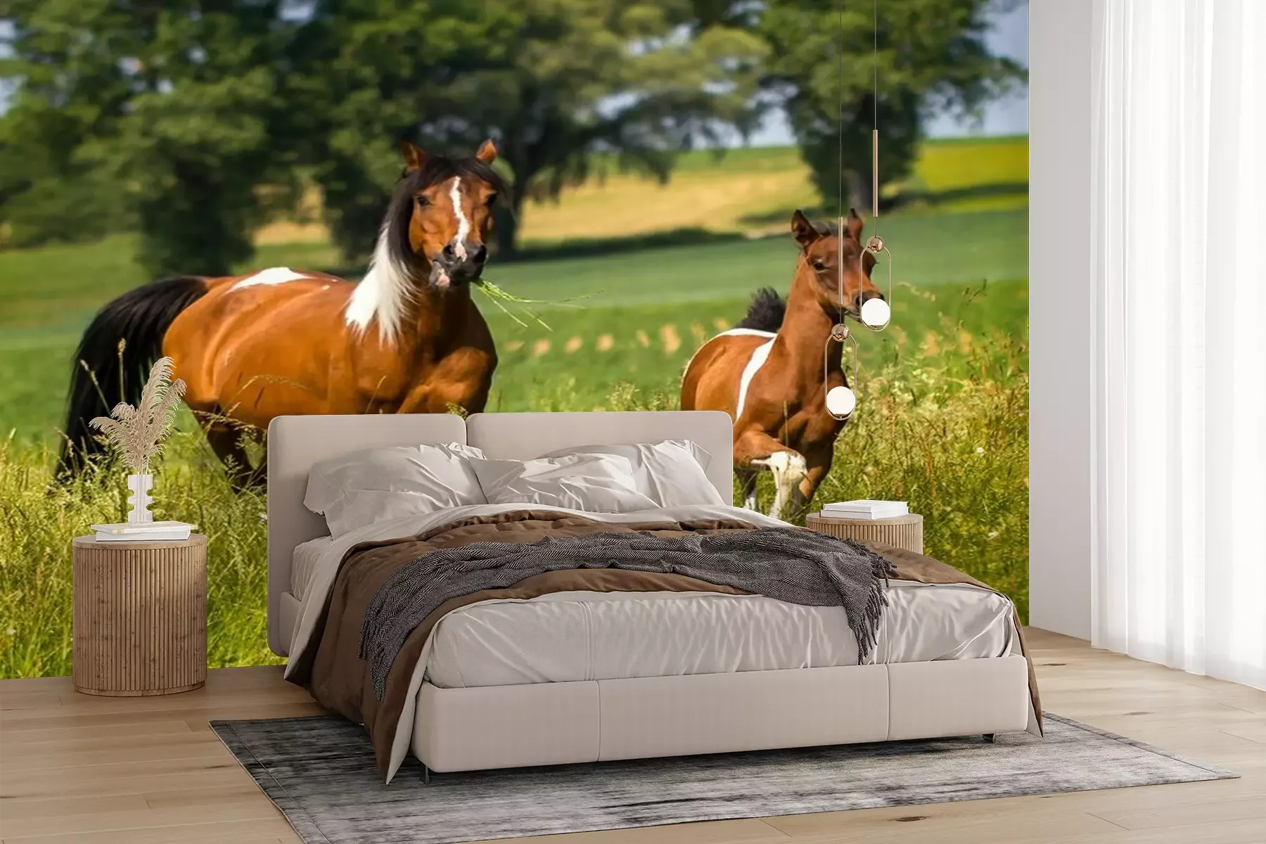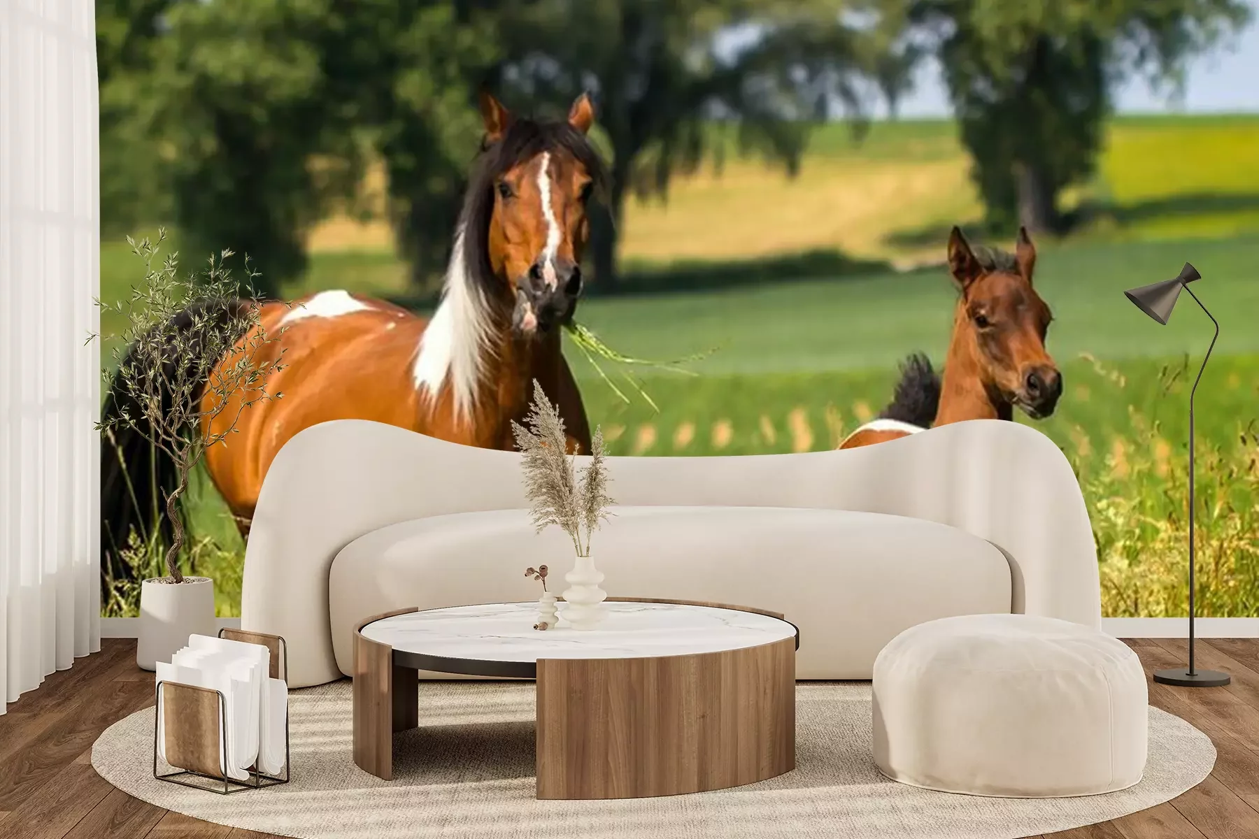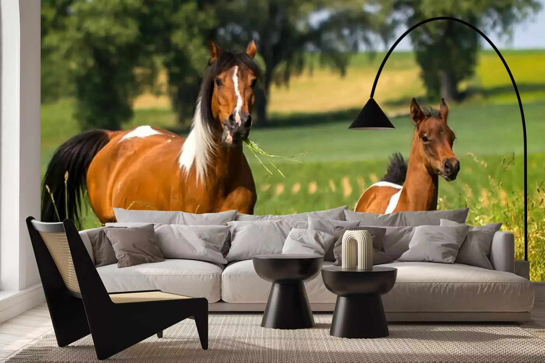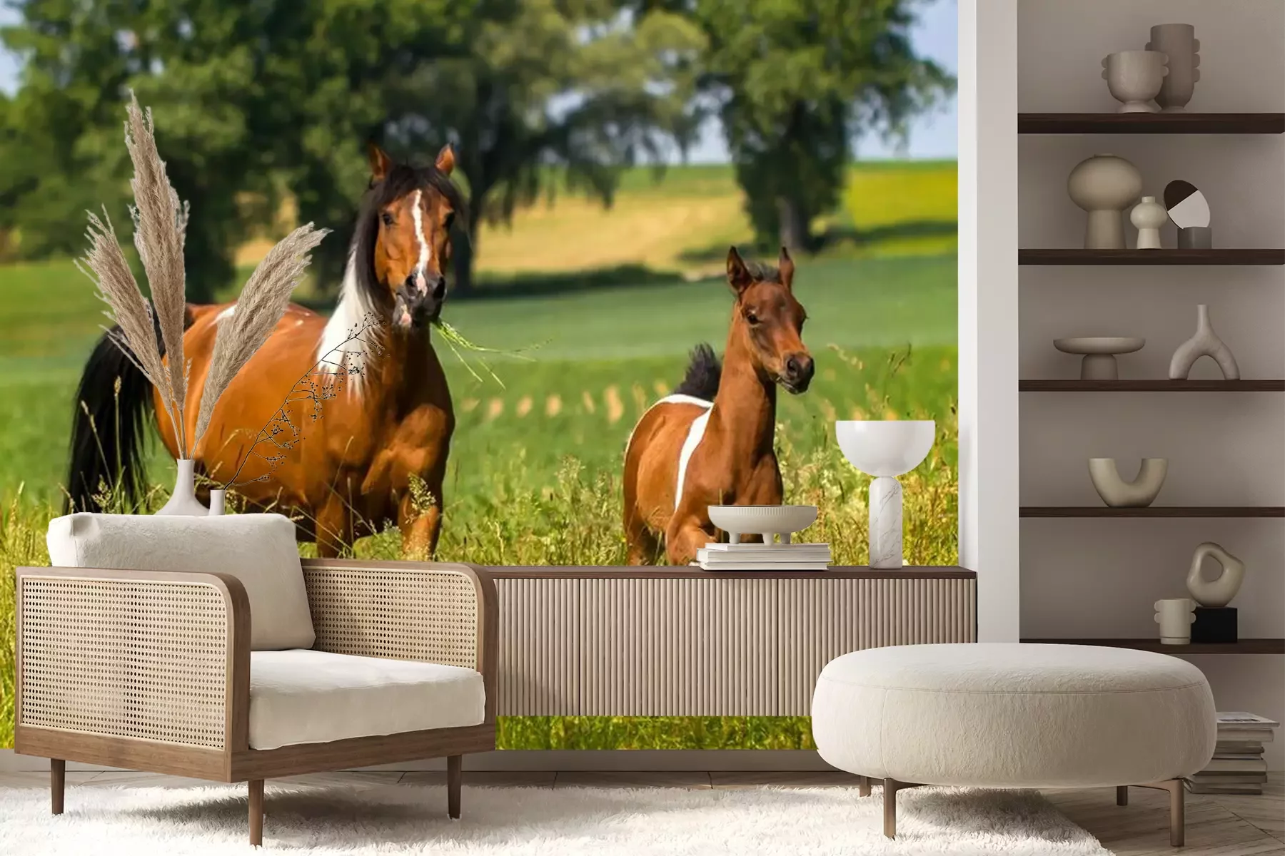 Fotobehang Paard en veulen tussen de grassen