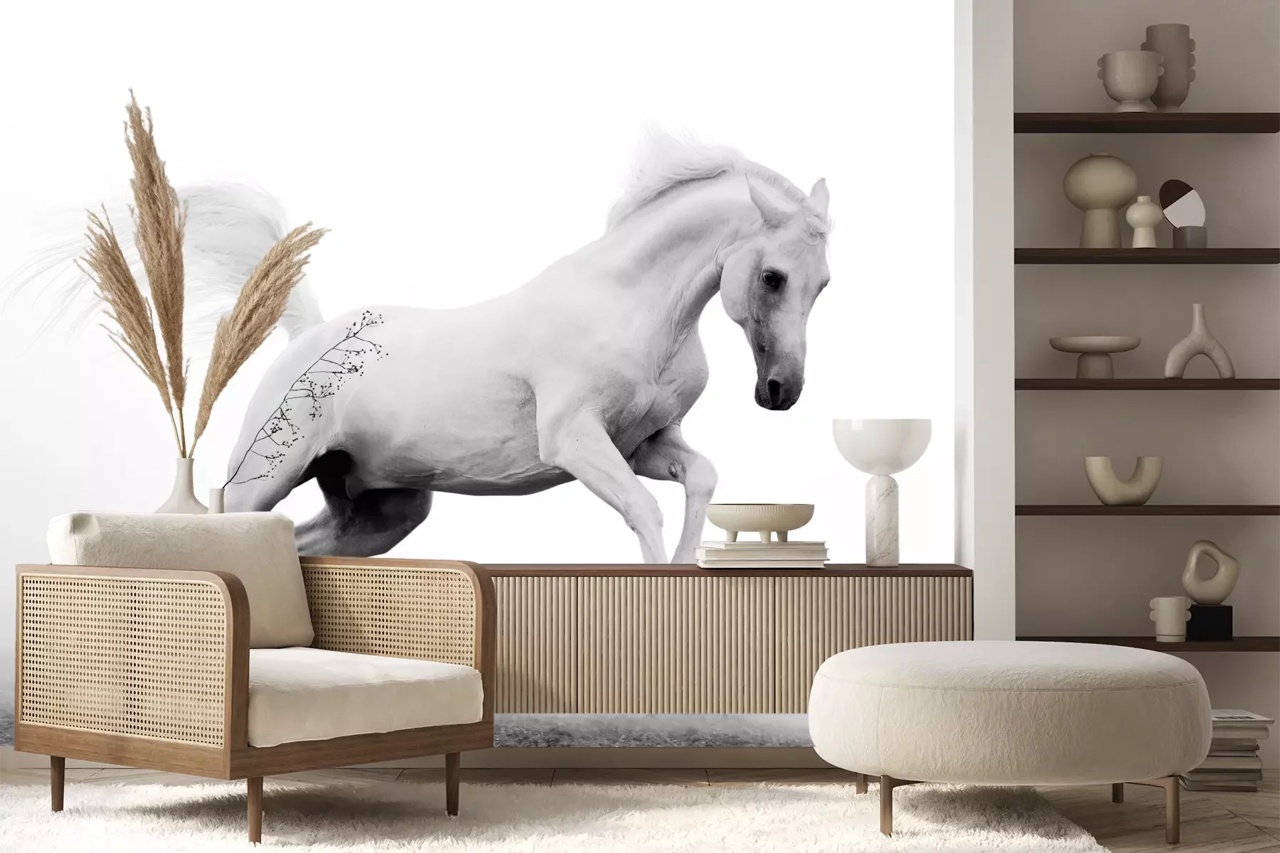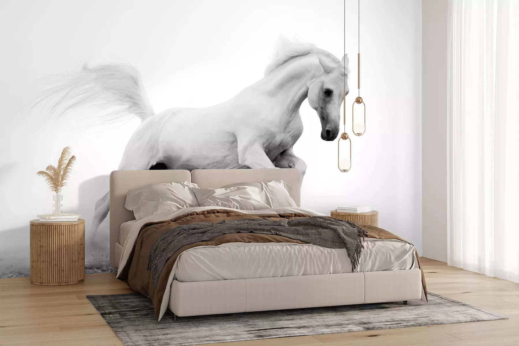 Het materiaal Premium+ is een gestructureerd vinyl op vlies met een gewicht van 255 g/m², dat kleine oneffenheden in de muur effectief camoufleert. De subtiele structuur van fijn zand geeft het oppervlak een exclusieve uitstraling, terwijl de halfmatte afwerking de diepte van de kleuren benadrukt. Het materiaal is dampdoorlatend, waardoor het ook in de keuken en badkamer kan worden gebruikt. De maximale breedte van één baan bedraagt 100 cm – bij grotere afmetingen wordt het fotobehang in meerdere gelijke banen verdeeld. De lijm wordt direct op de muur aangebracht en het behang wordt rand-aan-rand geplakt, wat zorgt voor een esthetisch resultaat zonder zichtbare naden. Het oppervlak kan gemakkelijk worden schoongemaakt door het voorzichtig af te nemen met een vochtige doek.