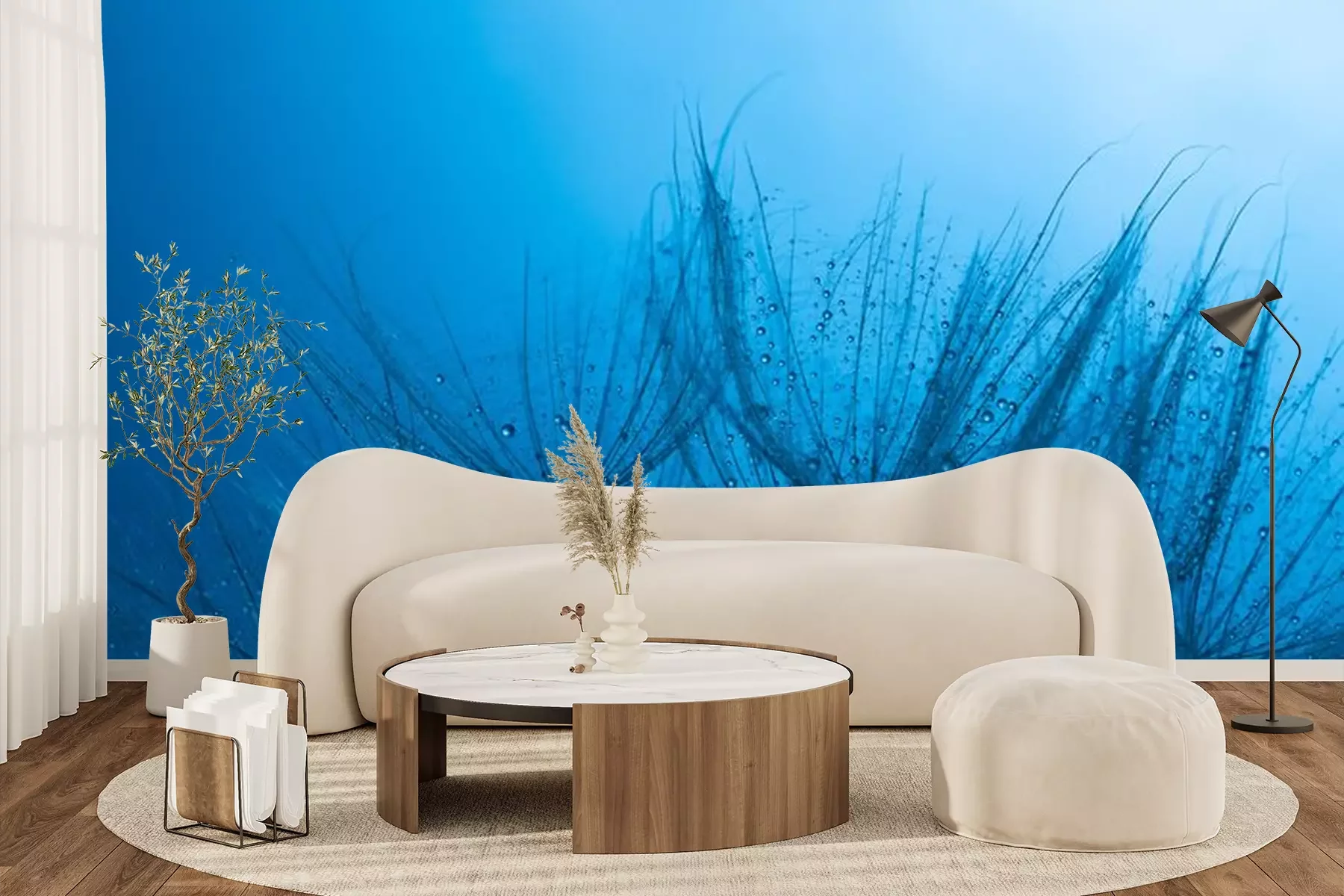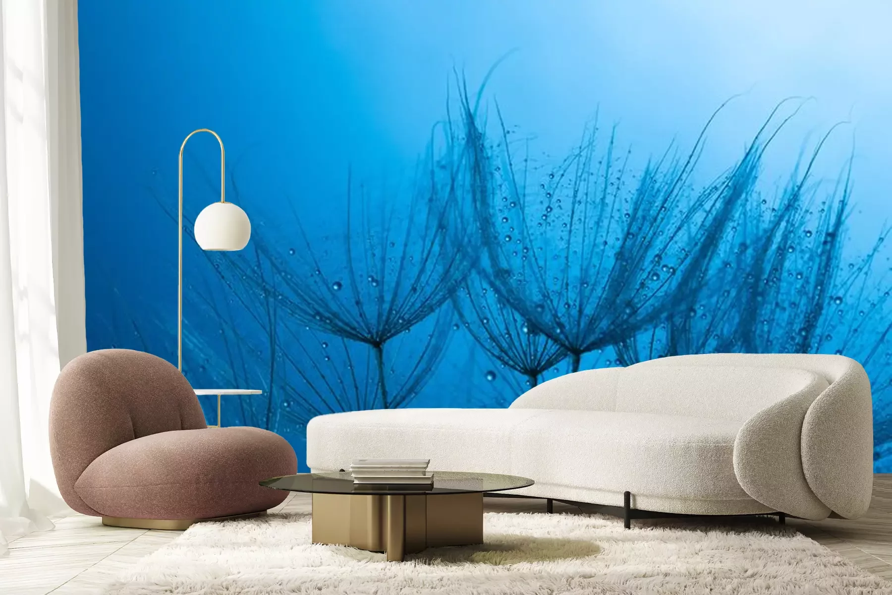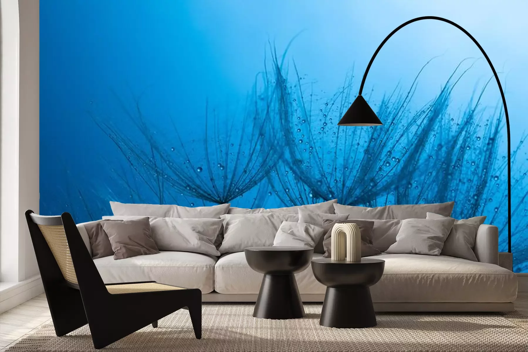 Fotobehang Paardebloemzaden op een blauwe achtergrond