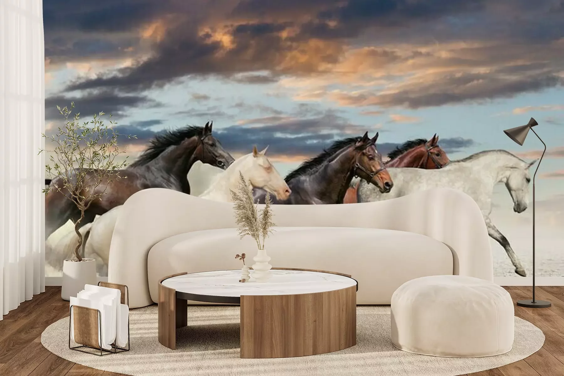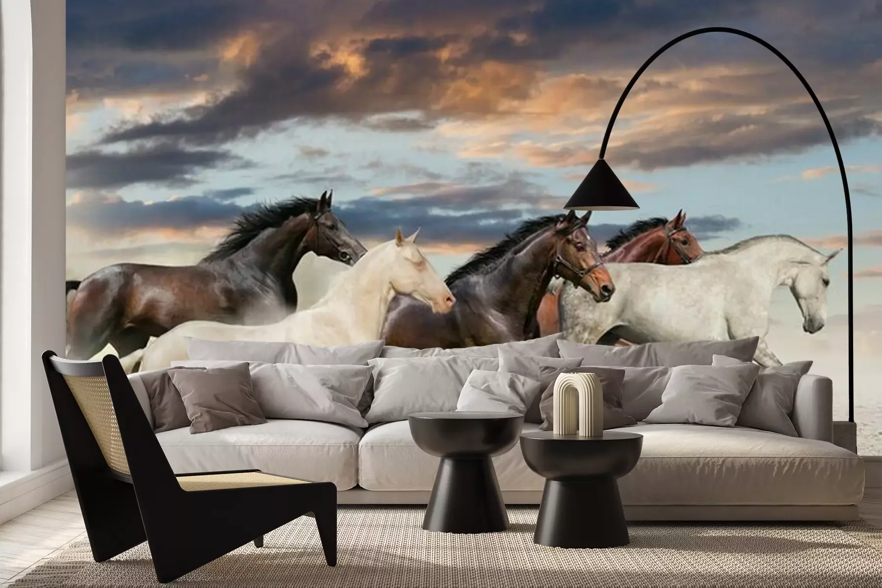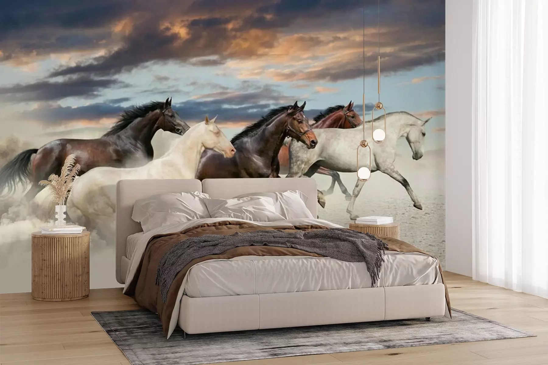 Het materiaal Premium+ is een gestructureerd vinyl op vlies met een gewicht van 255 g/m², dat kleine oneffenheden in de muur effectief camoufleert. De subtiele structuur van fijn zand geeft het oppervlak een exclusieve uitstraling, terwijl de halfmatte afwerking de diepte van de kleuren benadrukt. Het materiaal is dampdoorlatend, waardoor het ook in de keuken en badkamer kan worden gebruikt. De maximale breedte van één baan bedraagt 100 cm – bij grotere afmetingen wordt het fotobehang in meerdere gelijke banen verdeeld. De lijm wordt direct op de muur aangebracht en het behang wordt rand-aan-rand geplakt, wat zorgt voor een esthetisch resultaat zonder zichtbare naden. Het oppervlak kan gemakkelijk worden schoongemaakt door het voorzichtig af te nemen met een vochtige doek.