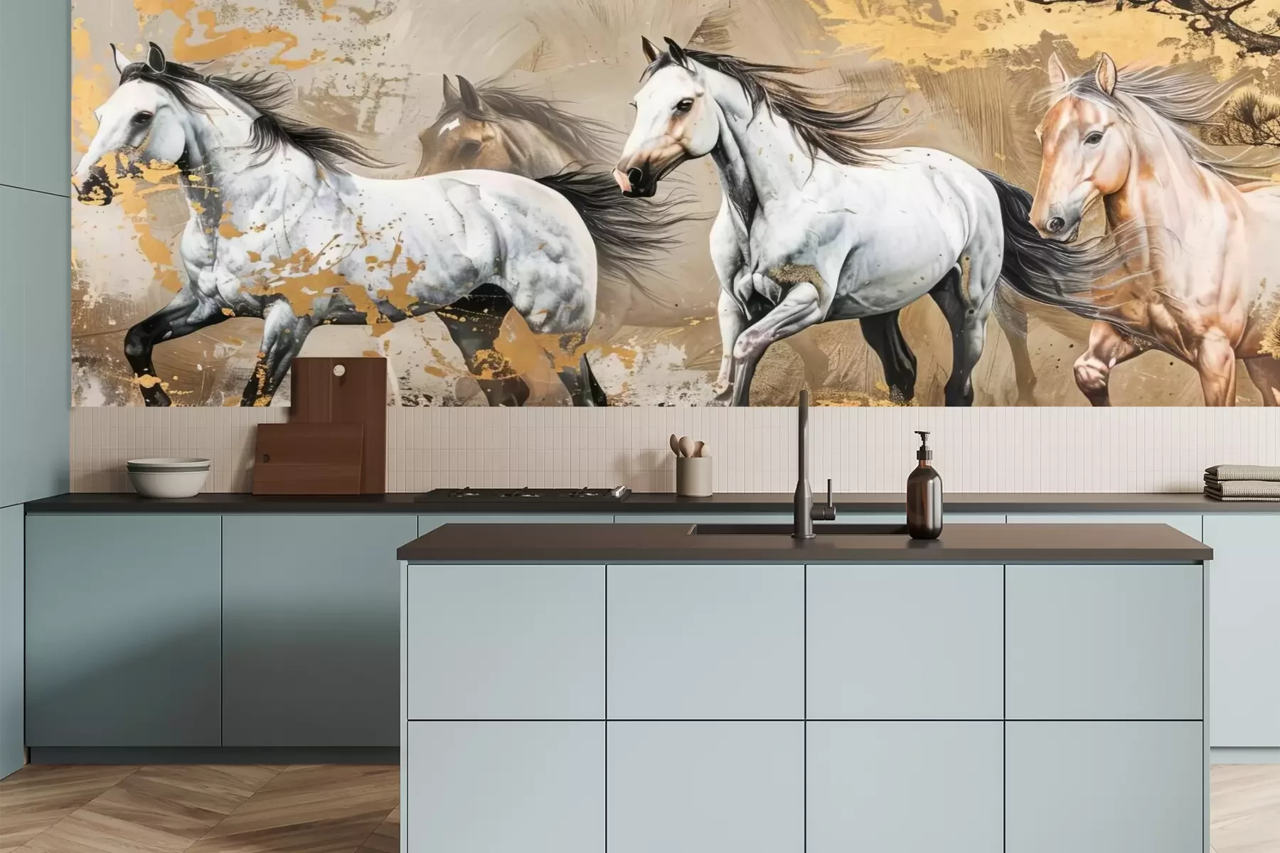 Het materiaal Premium is een glad vinyl op vlies, dat bestand is tegen uitrekken en vervorming. Het is dampdoorlatend – de muren kunnen vrij ademen – waardoor het geschikt is voor gebruik in de keuken en badkamer. Bij vervuiling kan het materiaal worden afgenomen met een vochtige doek. De maximale breedte van één baan bedraagt 95 of 105 cm, afhankelijk van de beschikbaarheid. Montage vindt plaats met de rand-aan-rand methode, wat een esthetisch resultaat zonder zichtbare naden oplevert. Omdat de lijm rechtstreeks op de muur wordt aangebracht, verloopt de installatie van het fotobehang snel en eenvoudig.
