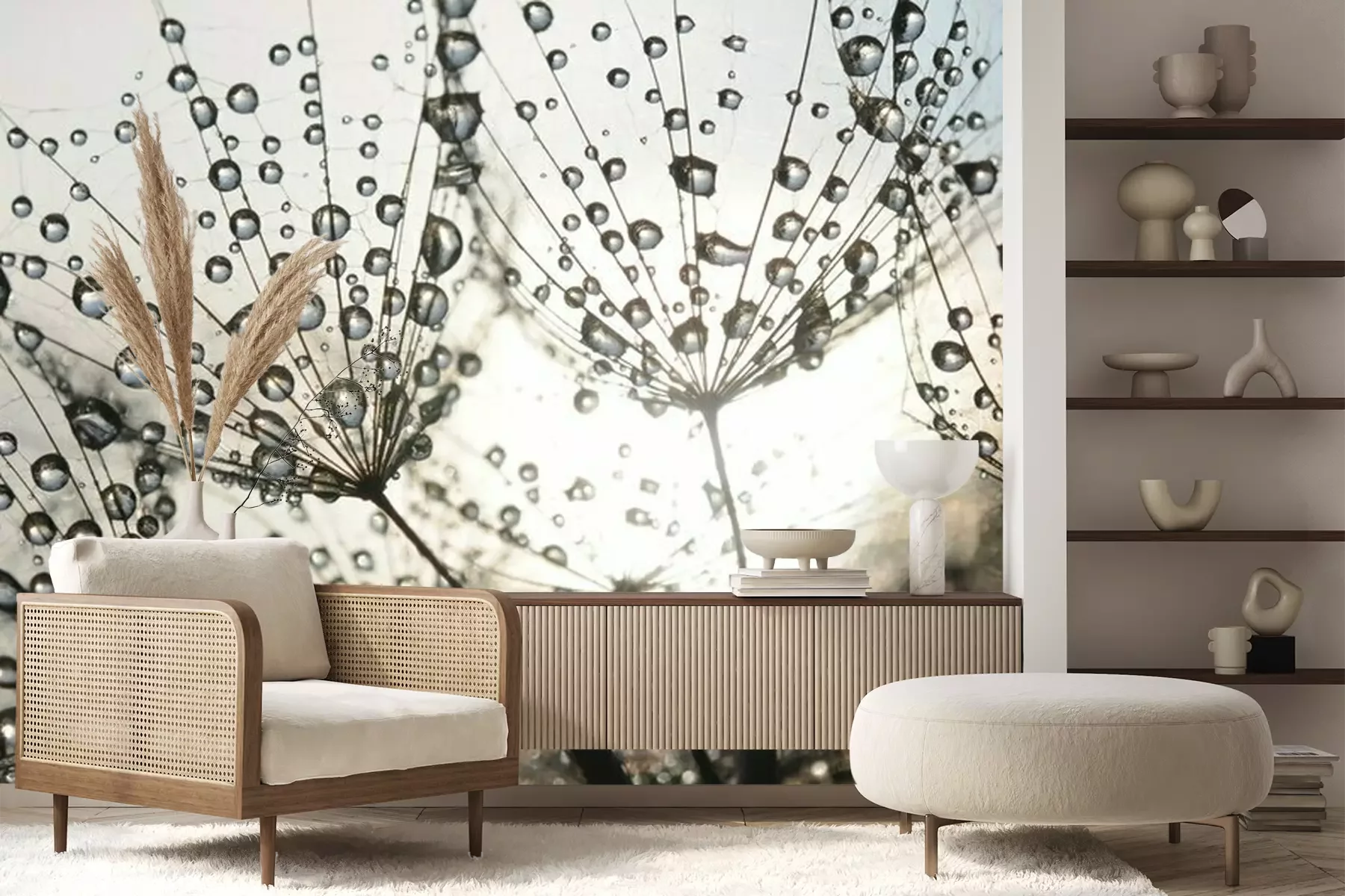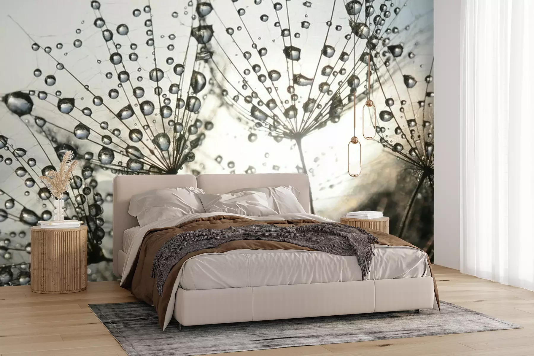 Het materiaal Premium+ is een gestructureerd vinyl op vlies met een gewicht van 255 g/m², dat kleine oneffenheden in de muur effectief camoufleert. De subtiele structuur van fijn zand geeft het oppervlak een exclusieve uitstraling, terwijl de halfmatte afwerking de diepte van de kleuren benadrukt. Het materiaal is dampdoorlatend, waardoor het ook in de keuken en badkamer kan worden gebruikt. De maximale breedte van één baan bedraagt 100 cm – bij grotere afmetingen wordt het fotobehang in meerdere gelijke banen verdeeld. De lijm wordt direct op de muur aangebracht en het behang wordt rand-aan-rand geplakt, wat zorgt voor een esthetisch resultaat zonder zichtbare naden. Het oppervlak kan gemakkelijk worden schoongemaakt door het voorzichtig af te nemen met een vochtige doek.