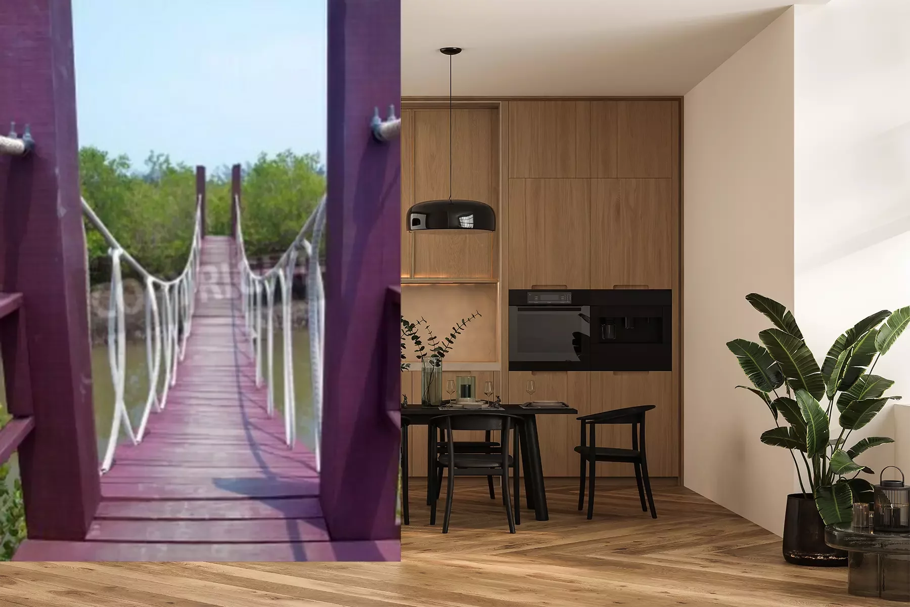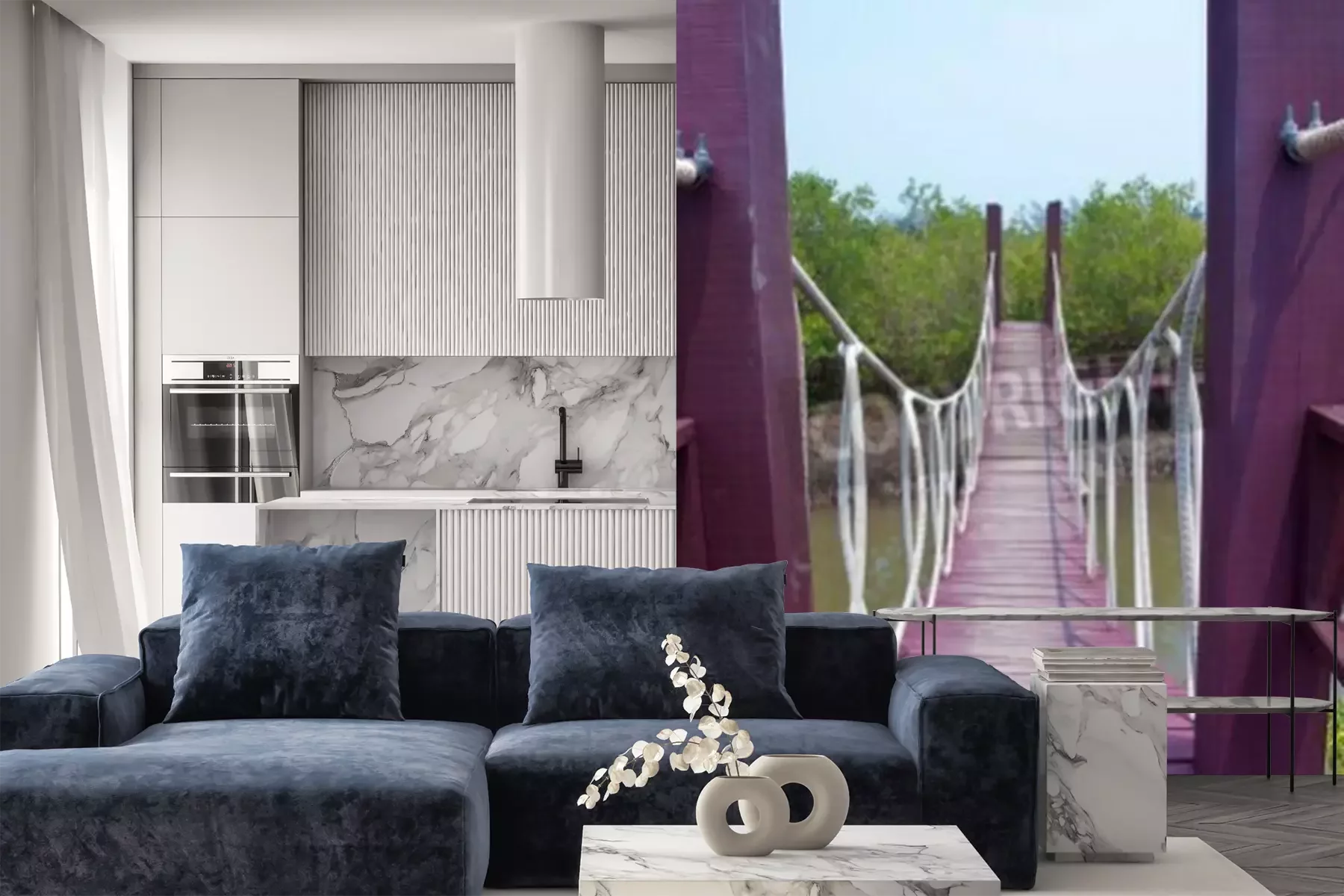 Fotobehang Paarse hangbrug over een kanaal