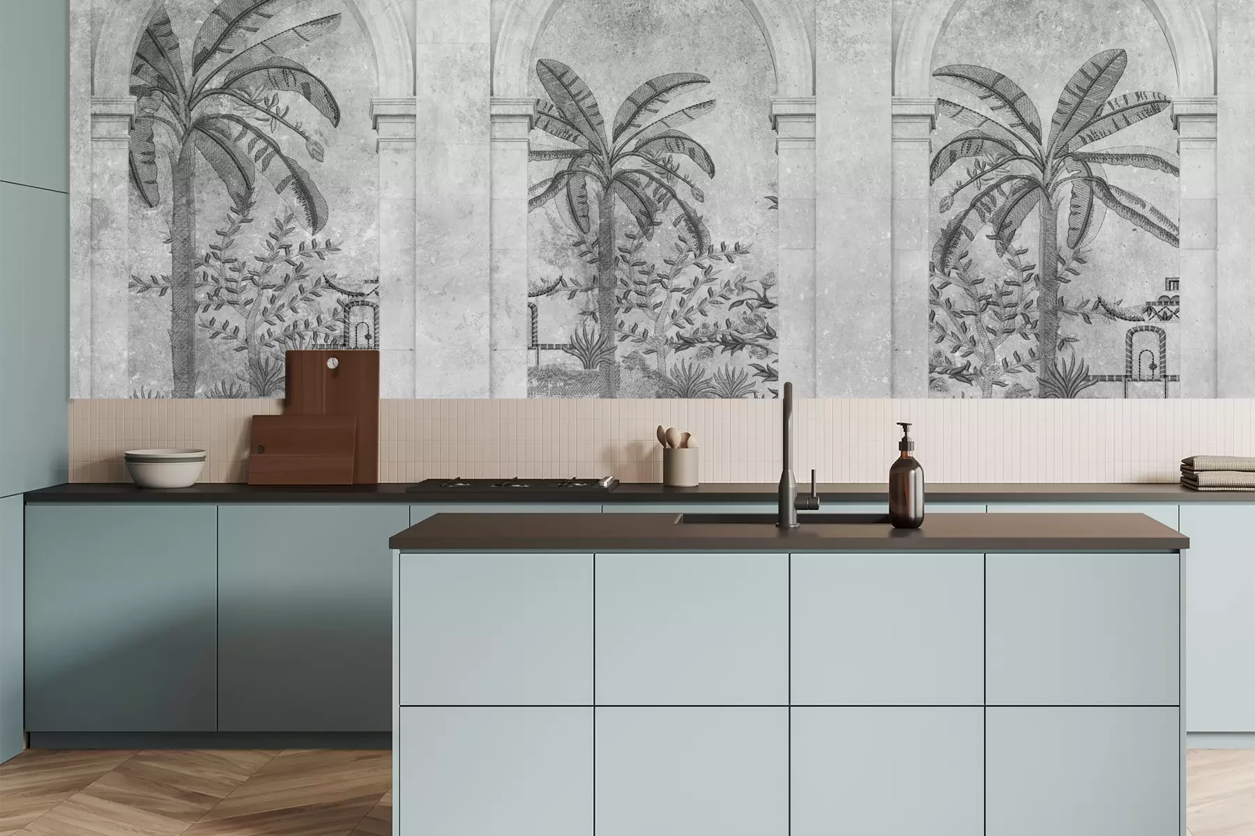Het materiaal Premium is een glad vinyl op vlies, dat bestand is tegen uitrekken en vervorming. Het is dampdoorlatend – de muren kunnen vrij ademen – waardoor het geschikt is voor gebruik in de keuken en badkamer. Bij vervuiling kan het materiaal worden afgenomen met een vochtige doek. De maximale breedte van één baan bedraagt 95 of 105 cm, afhankelijk van de beschikbaarheid. Montage vindt plaats met de rand-aan-rand methode, wat een esthetisch resultaat zonder zichtbare naden oplevert. Omdat de lijm rechtstreeks op de muur wordt aangebracht, verloopt de installatie van het fotobehang snel en eenvoudig.