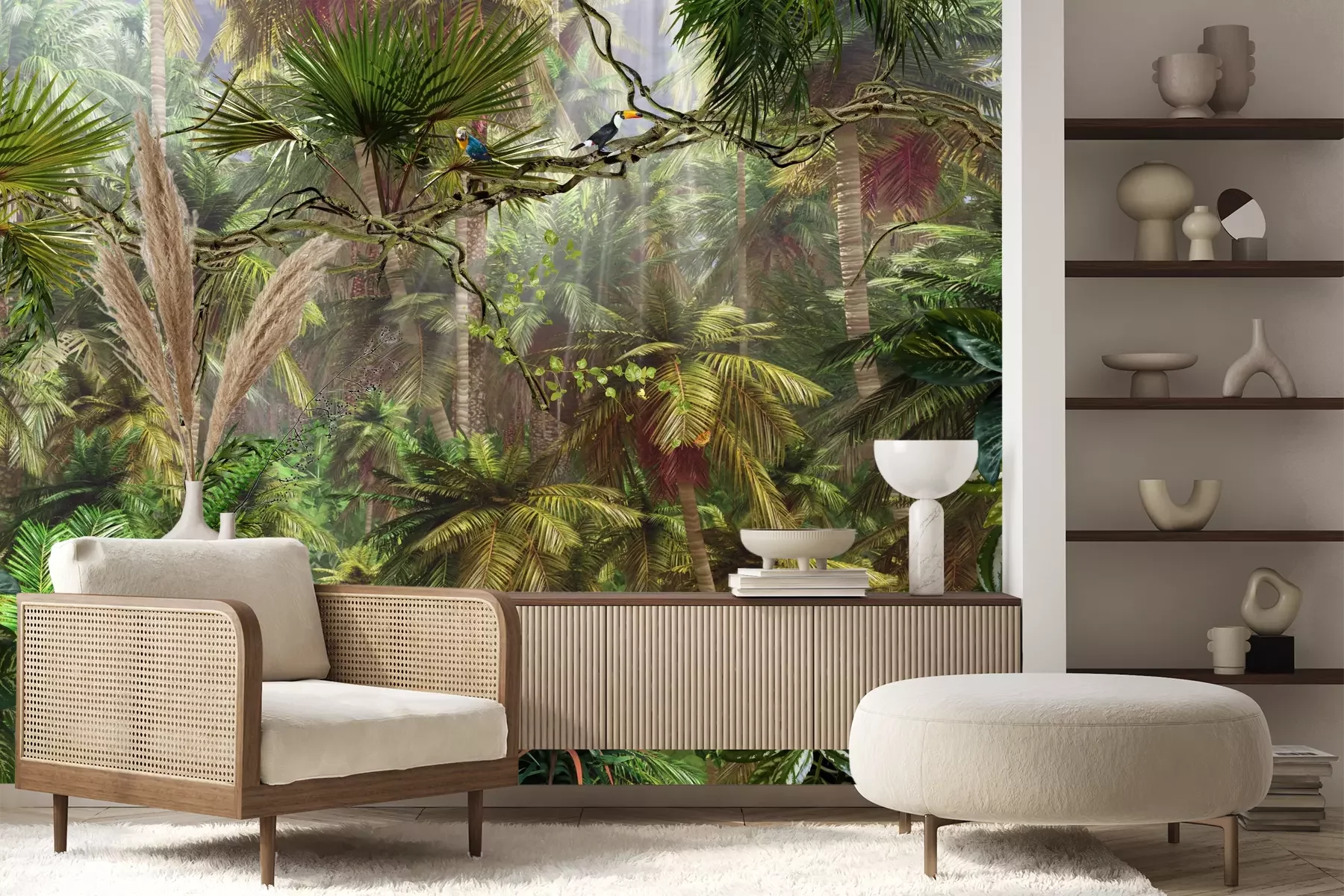 Het materiaal Premium+ is een gestructureerd vinyl op vlies met een gewicht van 255 g/m², dat kleine oneffenheden in de muur effectief camoufleert. De subtiele structuur van fijn zand geeft het oppervlak een exclusieve uitstraling, terwijl de halfmatte afwerking de diepte van de kleuren benadrukt. Het materiaal is dampdoorlatend, waardoor het ook in de keuken en badkamer kan worden gebruikt. De maximale breedte van één baan bedraagt 100 cm – bij grotere afmetingen wordt het fotobehang in meerdere gelijke banen verdeeld. De lijm wordt direct op de muur aangebracht en het behang wordt rand-aan-rand geplakt, wat zorgt voor een esthetisch resultaat zonder zichtbare naden. Het oppervlak kan gemakkelijk worden schoongemaakt door het voorzichtig af te nemen met een vochtige doek.