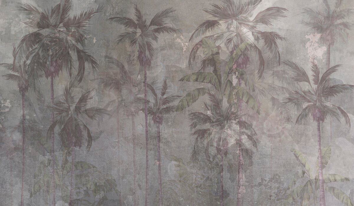 Fotobehang: Palmbomen op een betonnen achtergrond, industrieel landschap