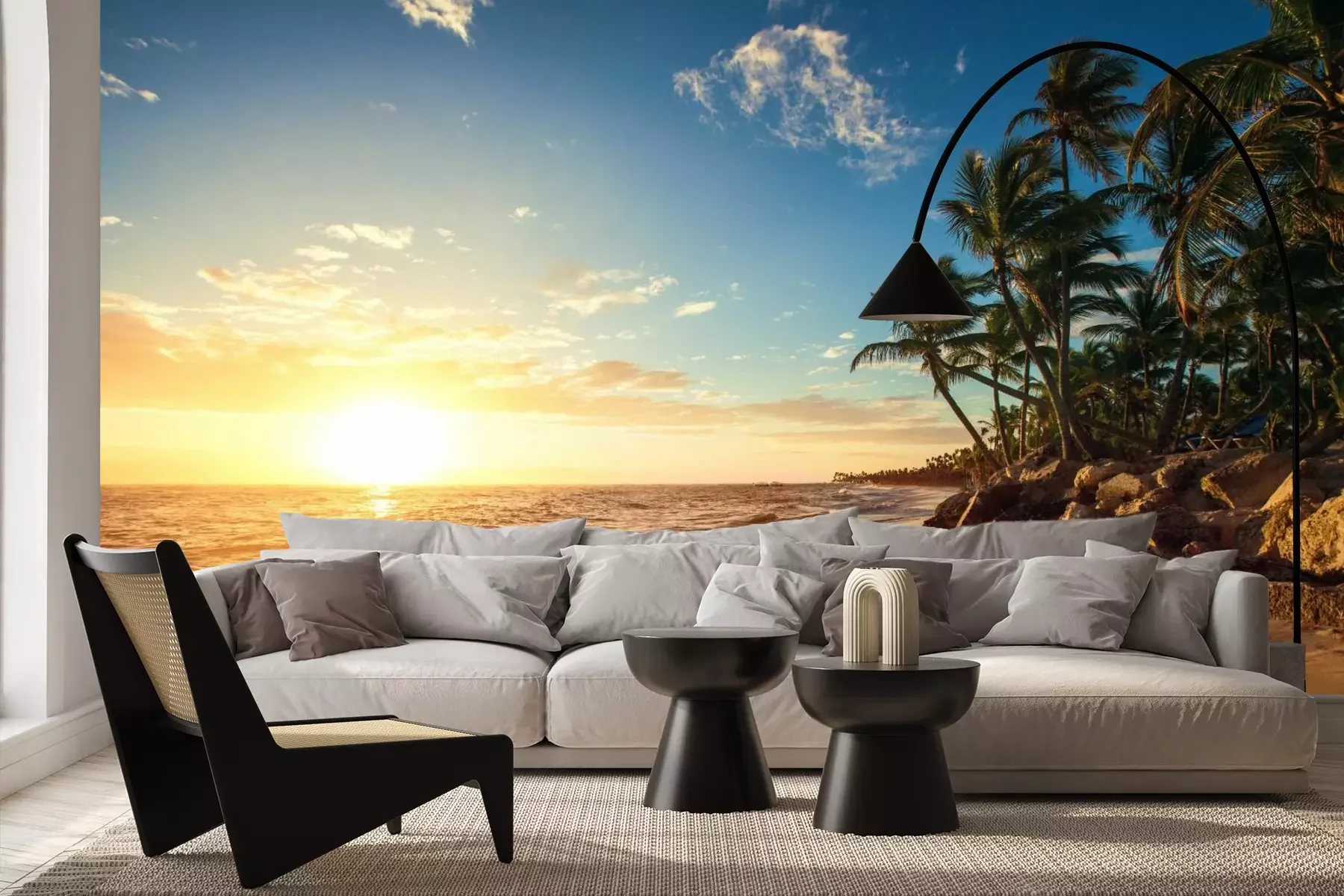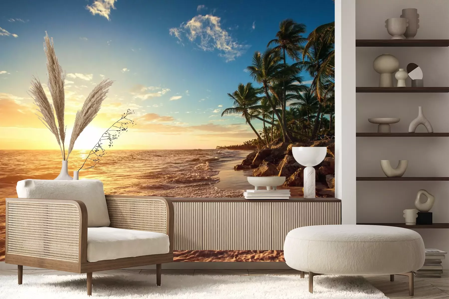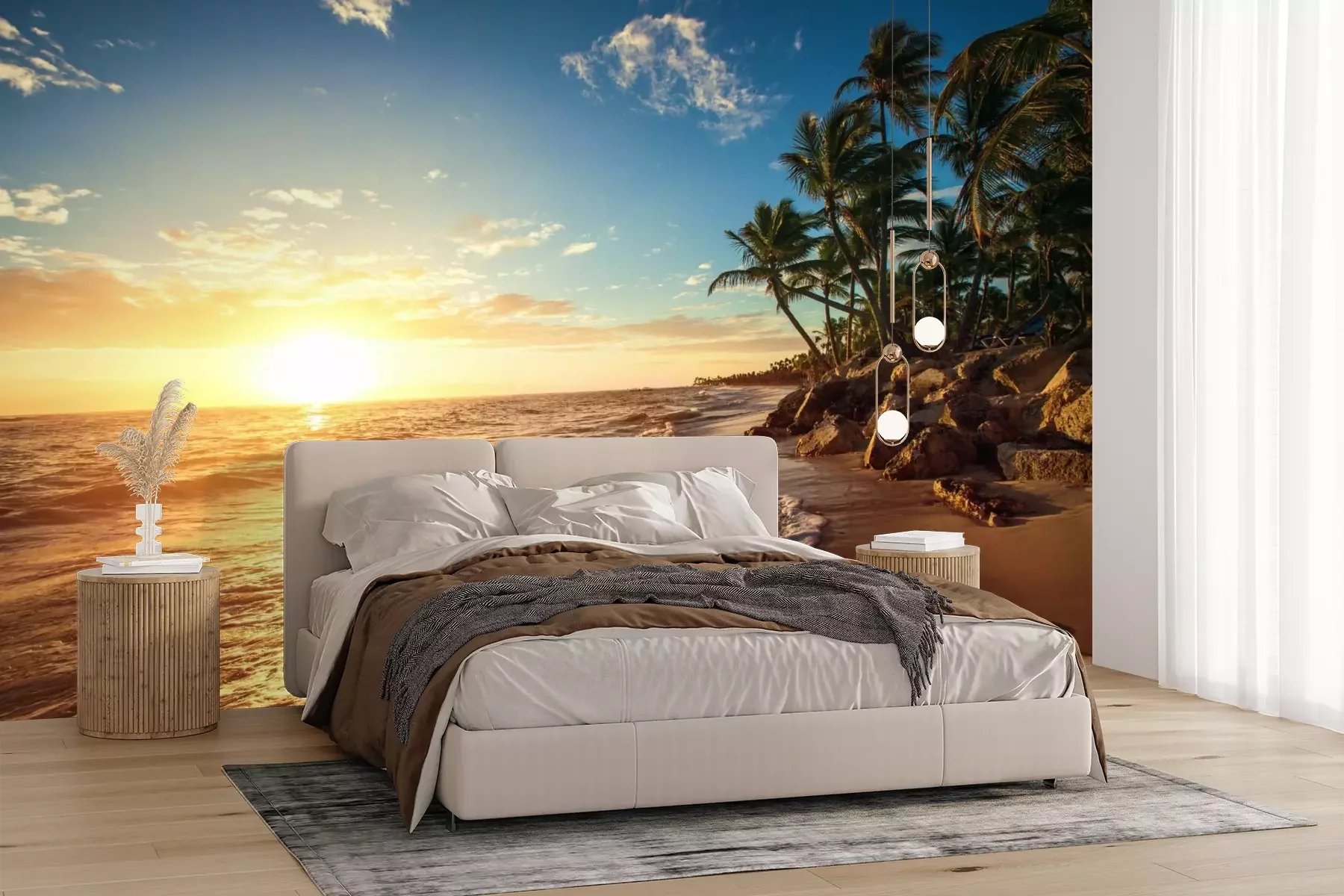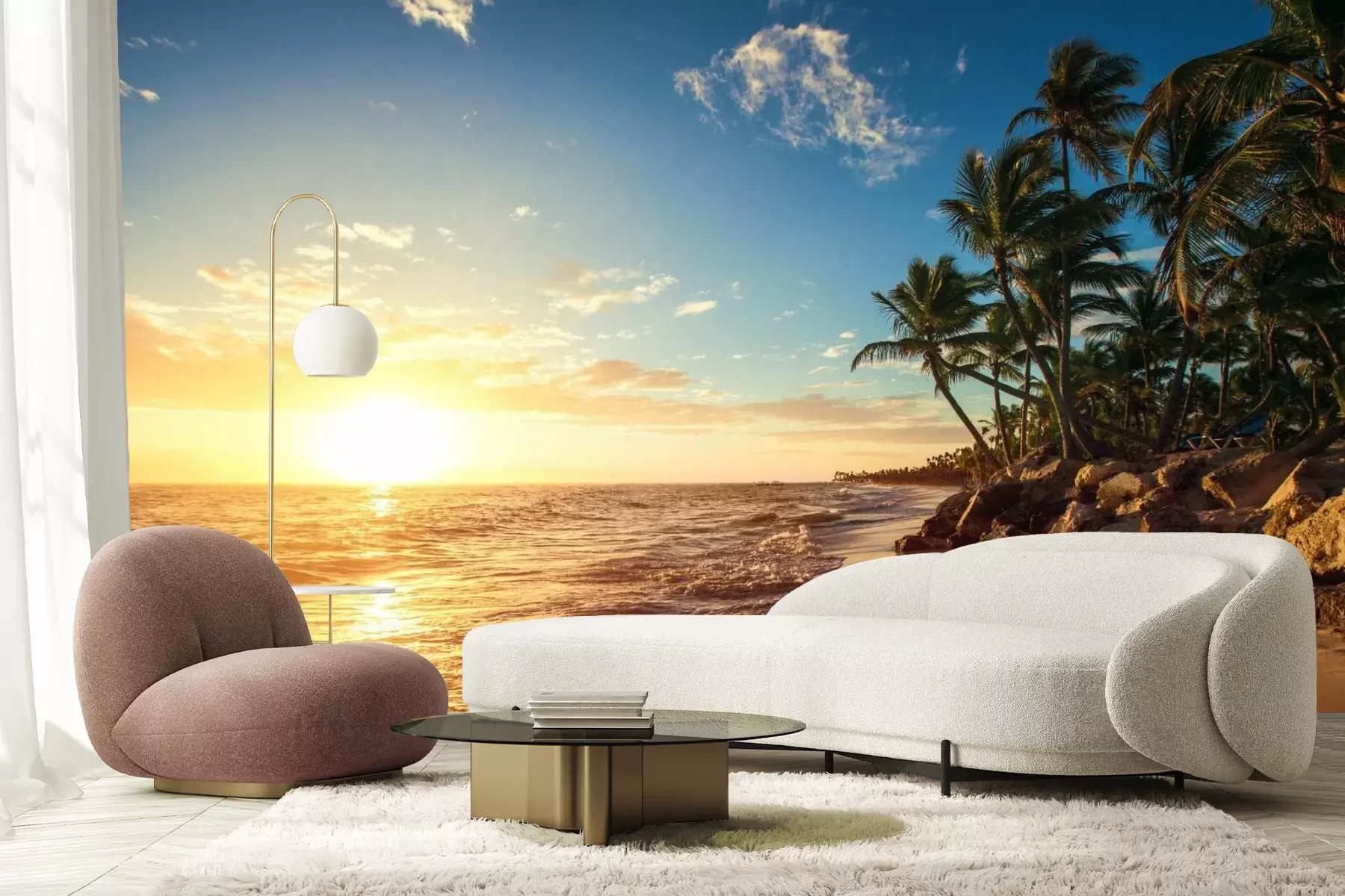 Strand zee en tropische bomenFotobehang