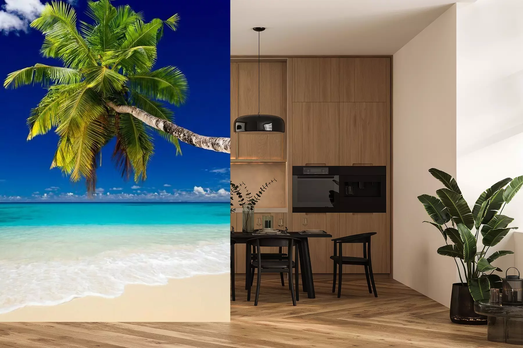 Zee en palmbomen op de SeychellenFotobehang