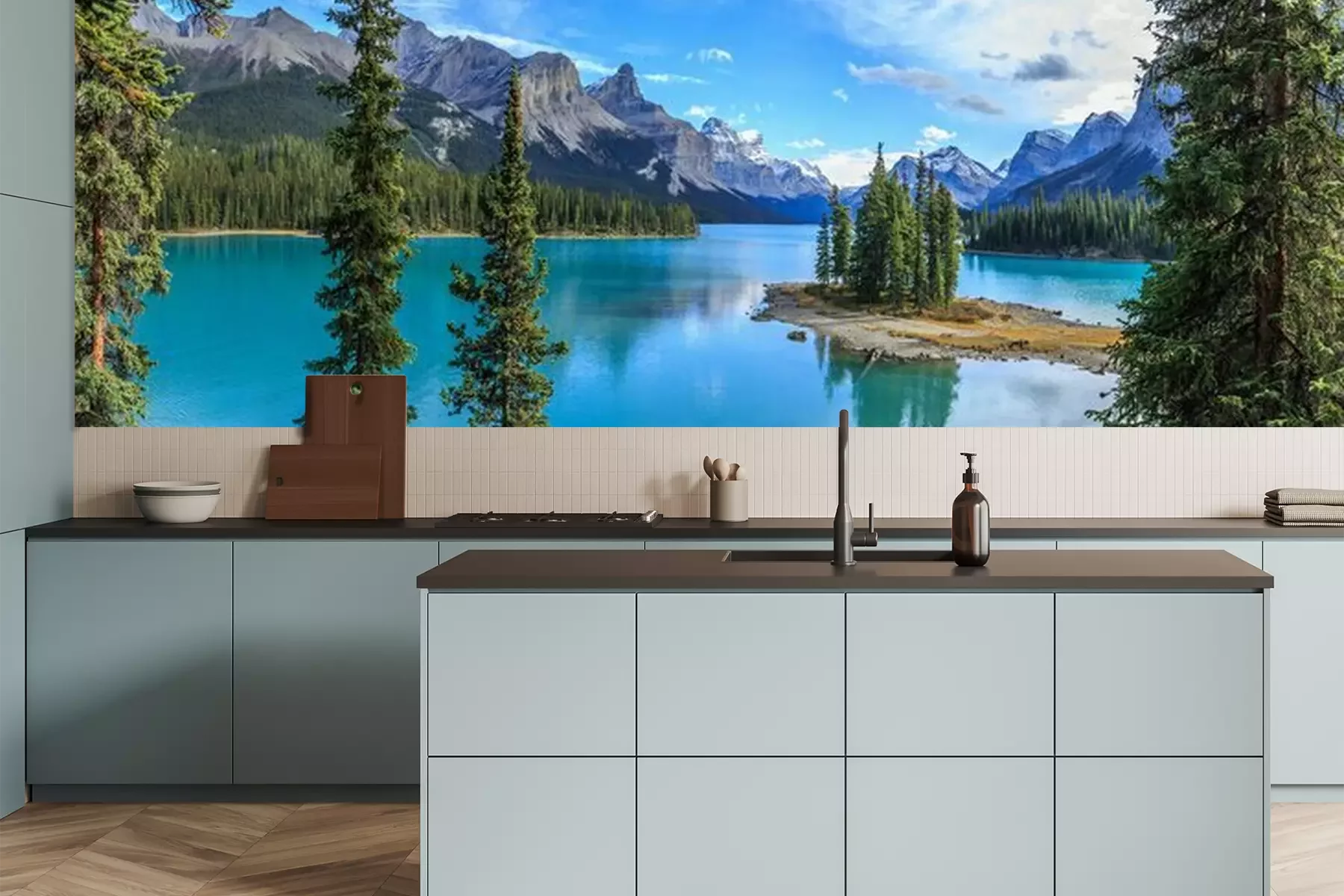 Het materiaal Premium is een glad vinyl op vlies, dat bestand is tegen uitrekken en vervorming. Het is dampdoorlatend – de muren kunnen vrij ademen – waardoor het geschikt is voor gebruik in de keuken en badkamer. Bij vervuiling kan het materiaal worden afgenomen met een vochtige doek. De maximale breedte van één baan bedraagt 95 of 105 cm, afhankelijk van de beschikbaarheid. Montage vindt plaats met de rand-aan-rand methode, wat een esthetisch resultaat zonder zichtbare naden oplevert. Omdat de lijm rechtstreeks op de muur wordt aangebracht, verloopt de installatie van het fotobehang snel en eenvoudig.