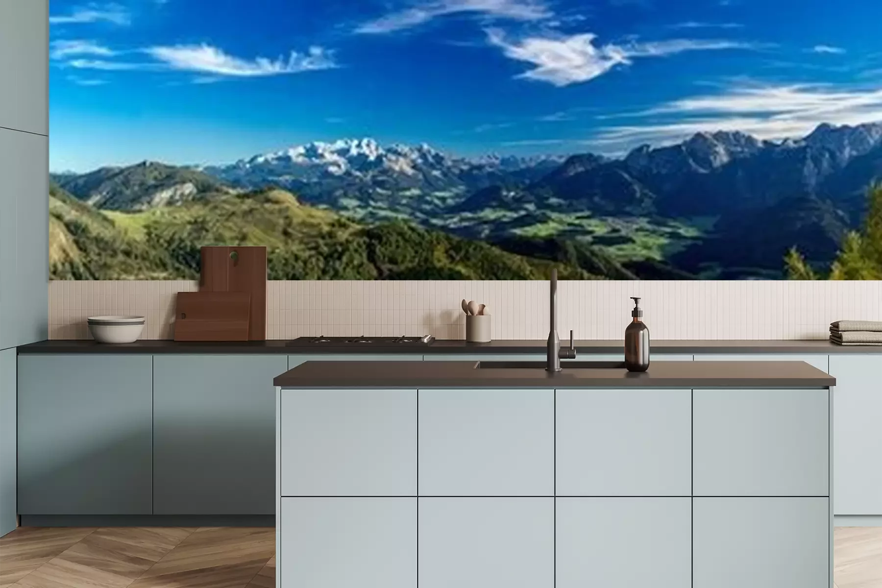 Het materiaal Premium is een glad vinyl op vlies, dat bestand is tegen uitrekken en vervorming. Het is dampdoorlatend – de muren kunnen vrij ademen – waardoor het geschikt is voor gebruik in de keuken en badkamer. Bij vervuiling kan het materiaal worden afgenomen met een vochtige doek. De maximale breedte van één baan bedraagt 95 of 105 cm, afhankelijk van de beschikbaarheid. Montage vindt plaats met de rand-aan-rand methode, wat een esthetisch resultaat zonder zichtbare naden oplevert. Omdat de lijm rechtstreeks op de muur wordt aangebracht, verloopt de installatie van het fotobehang snel en eenvoudig.
