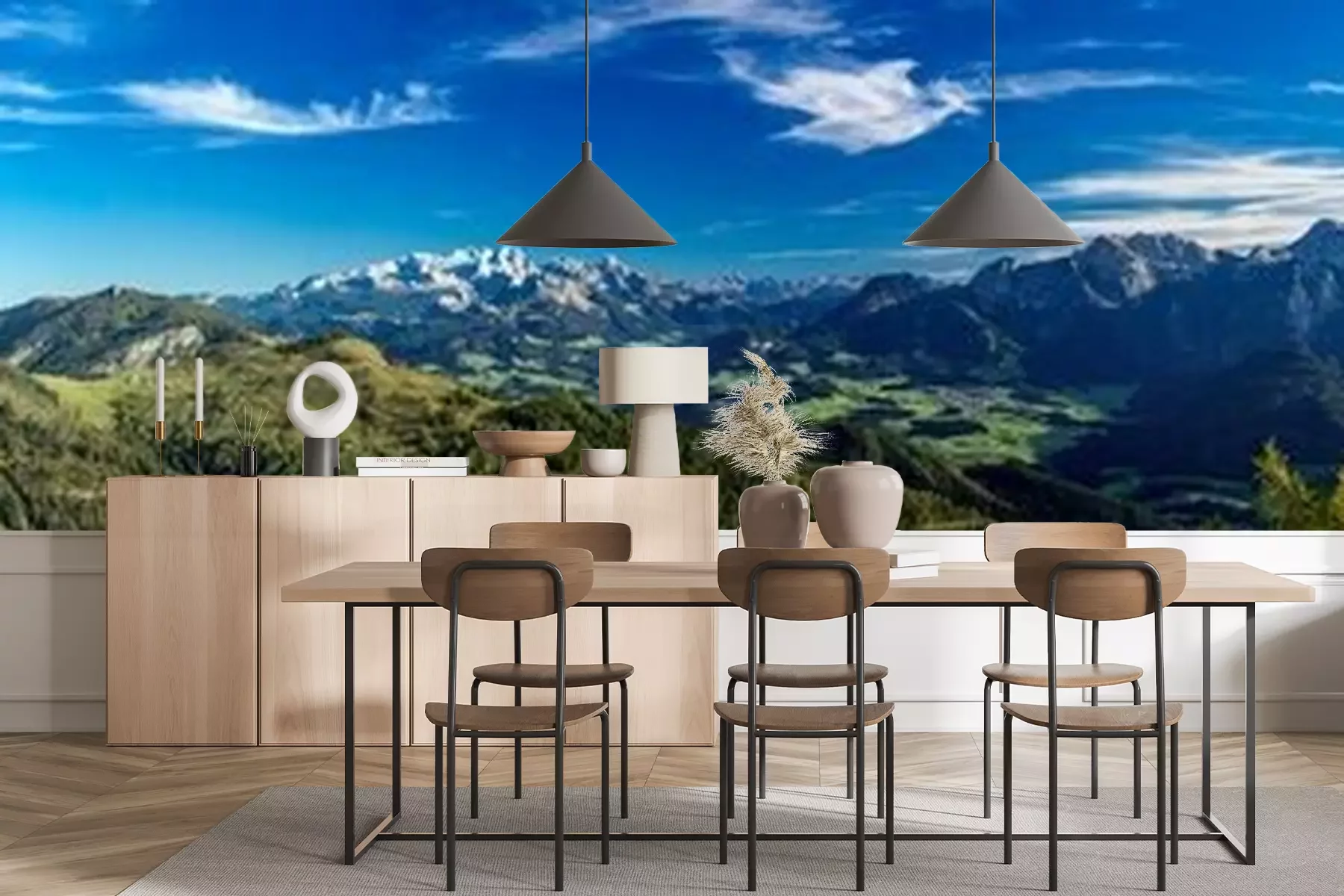 Het materiaal Premium+ is een gestructureerd vinyl op vlies met een gewicht van 255 g/m², dat kleine oneffenheden in de muur effectief camoufleert. De subtiele structuur van fijn zand geeft het oppervlak een exclusieve uitstraling, terwijl de halfmatte afwerking de diepte van de kleuren benadrukt. Het materiaal is dampdoorlatend, waardoor het ook in de keuken en badkamer kan worden gebruikt. De maximale breedte van één baan bedraagt 100 cm – bij grotere afmetingen wordt het fotobehang in meerdere gelijke banen verdeeld. De lijm wordt direct op de muur aangebracht en het behang wordt rand-aan-rand geplakt, wat zorgt voor een esthetisch resultaat zonder zichtbare naden. Het oppervlak kan gemakkelijk worden schoongemaakt door het voorzichtig af te nemen met een vochtige doek.