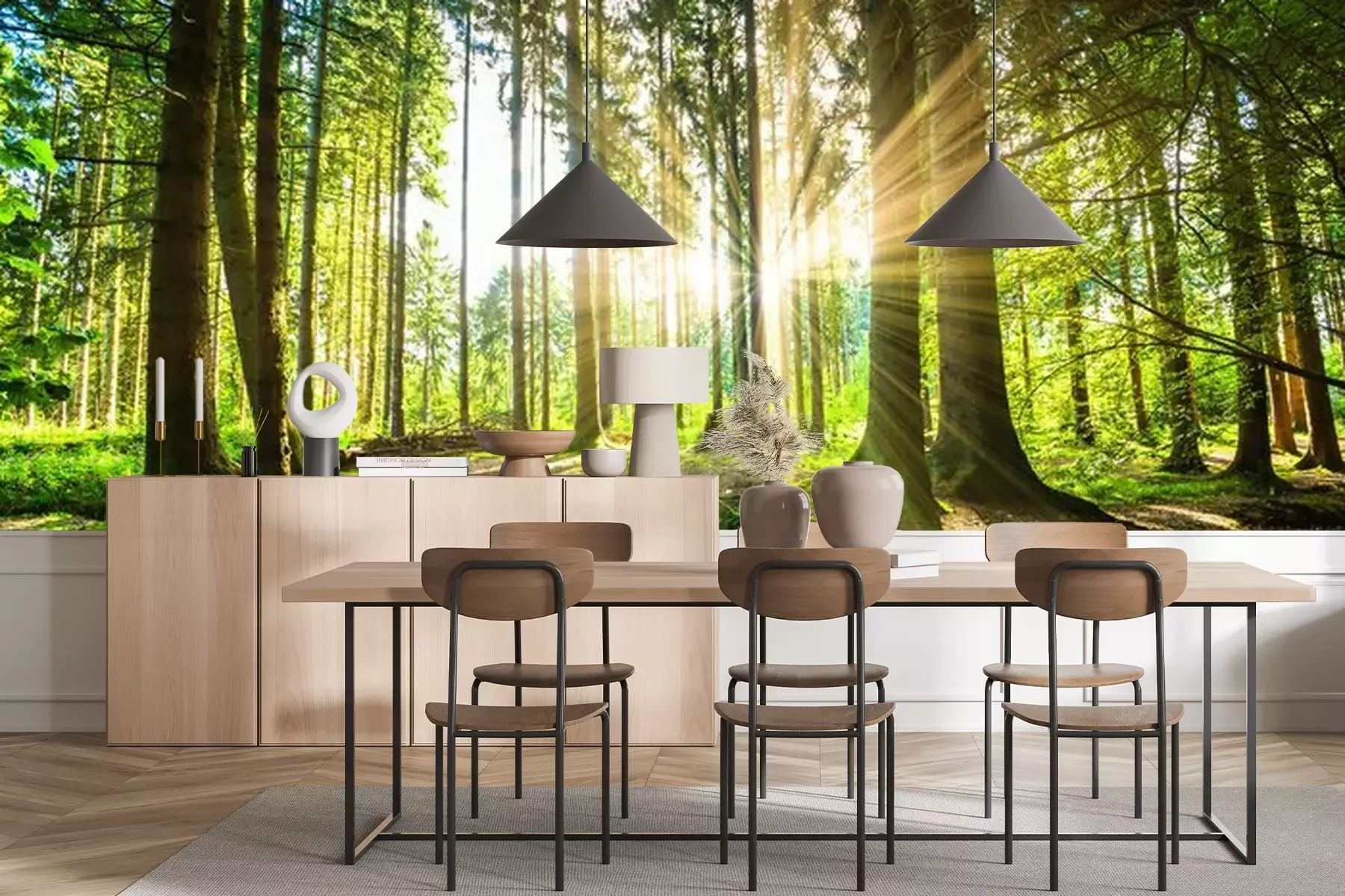 Zonnestralen in het bosFotobehang