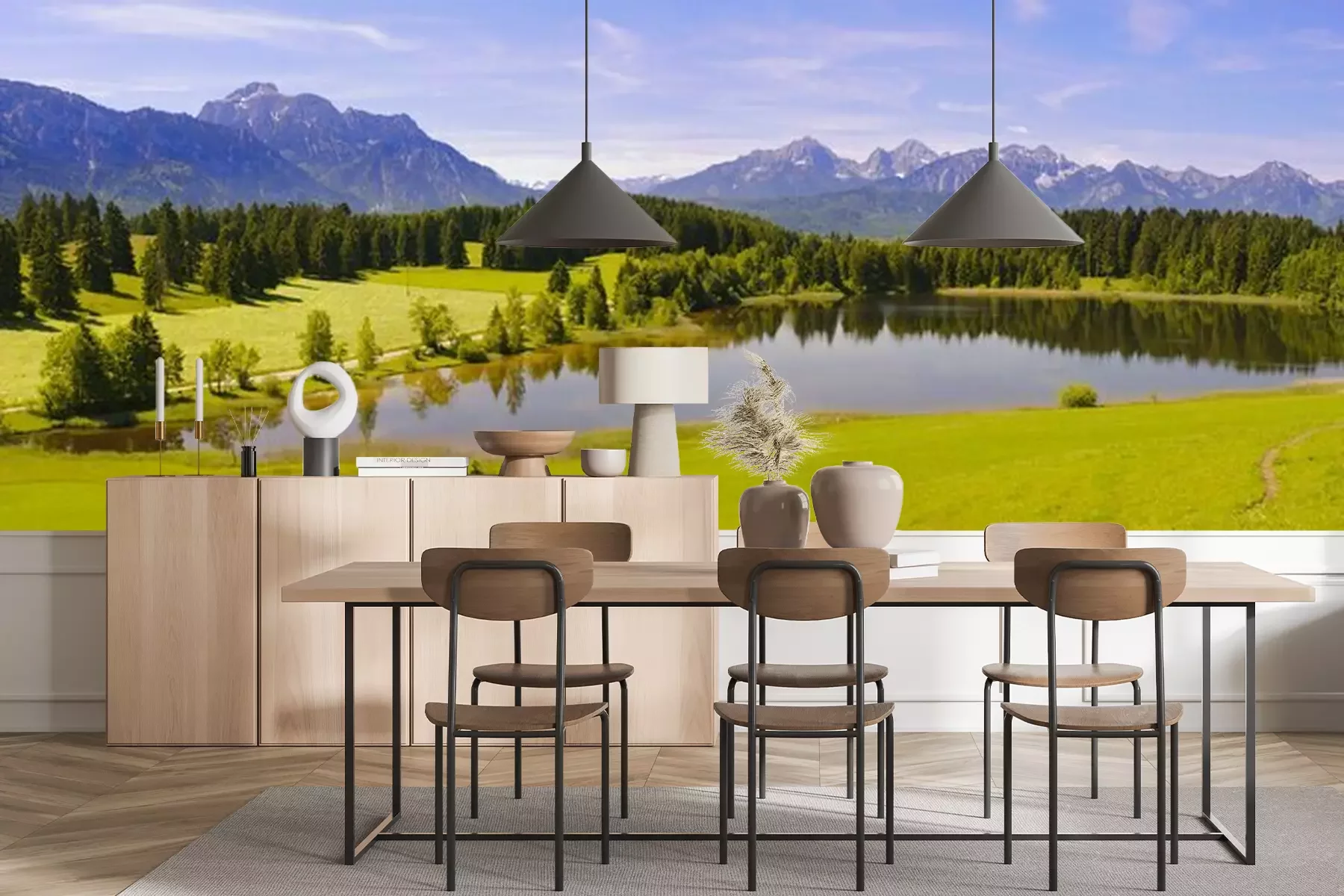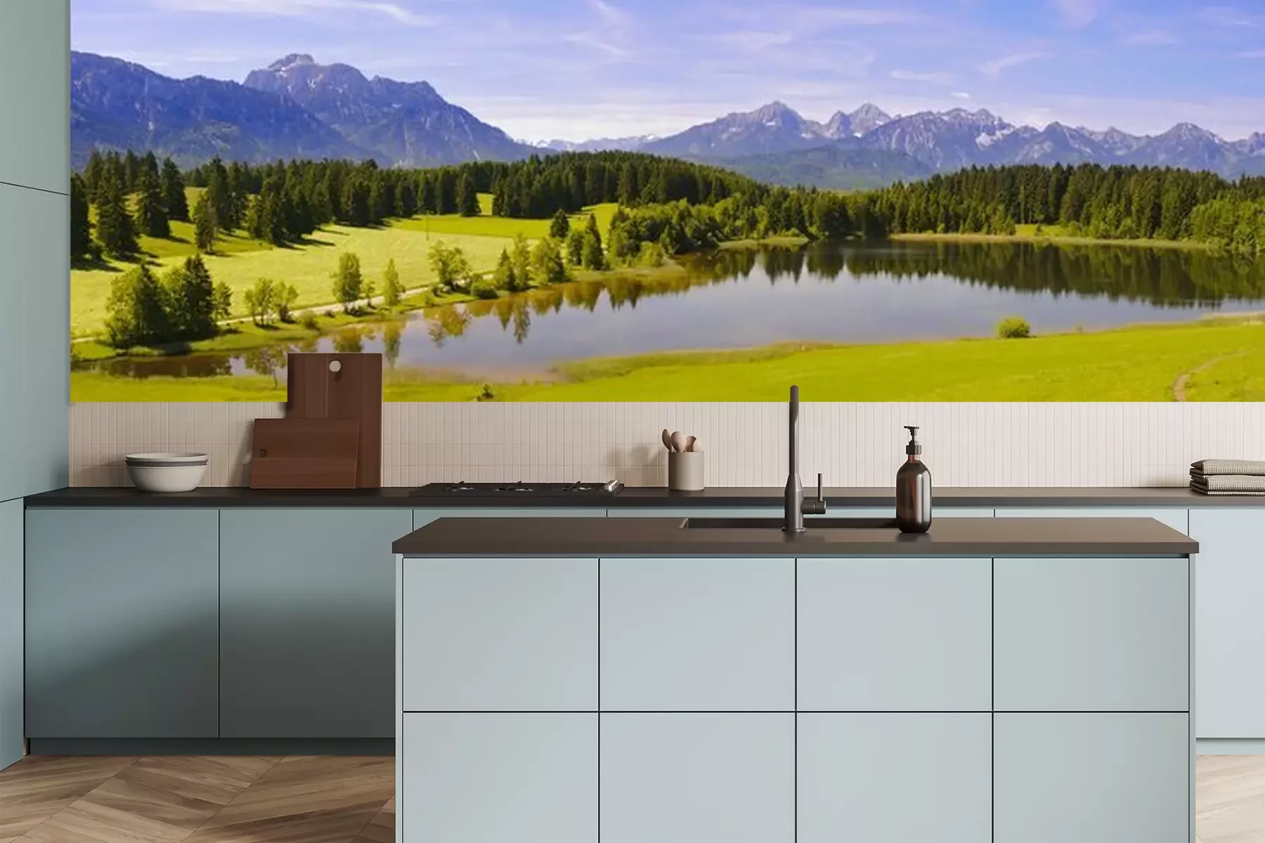 Bergpanorama met velden en de AlpenProbleemloze bezorging verzorgd door vertrouwde vervoerders