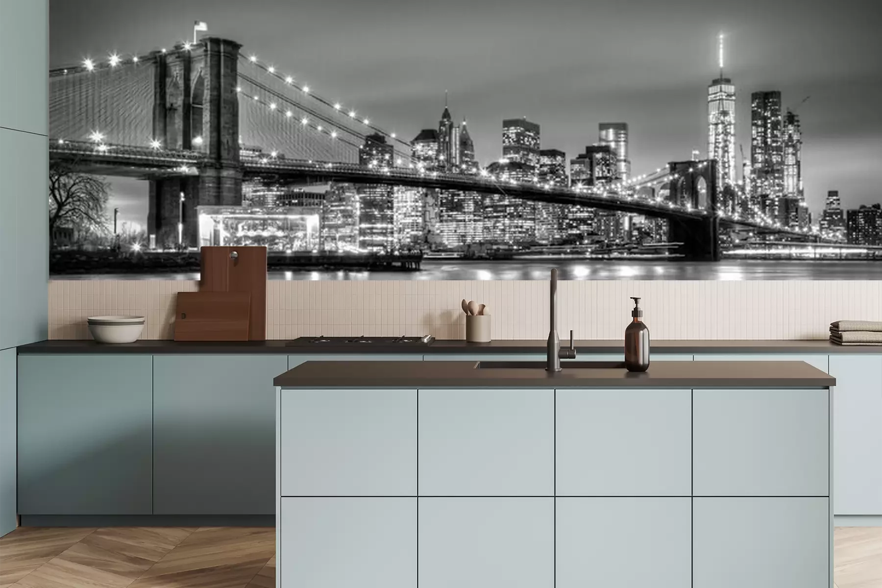 Het materiaal Premium is een glad vinyl op vlies, dat bestand is tegen uitrekken en vervorming. Het is dampdoorlatend – de muren kunnen vrij ademen – waardoor het geschikt is voor gebruik in de keuken en badkamer. Bij vervuiling kan het materiaal worden afgenomen met een vochtige doek. De maximale breedte van één baan bedraagt 95 of 105 cm, afhankelijk van de beschikbaarheid. Montage vindt plaats met de rand-aan-rand methode, wat een esthetisch resultaat zonder zichtbare naden oplevert. Omdat de lijm rechtstreeks op de muur wordt aangebracht, verloopt de installatie van het fotobehang snel en eenvoudig.