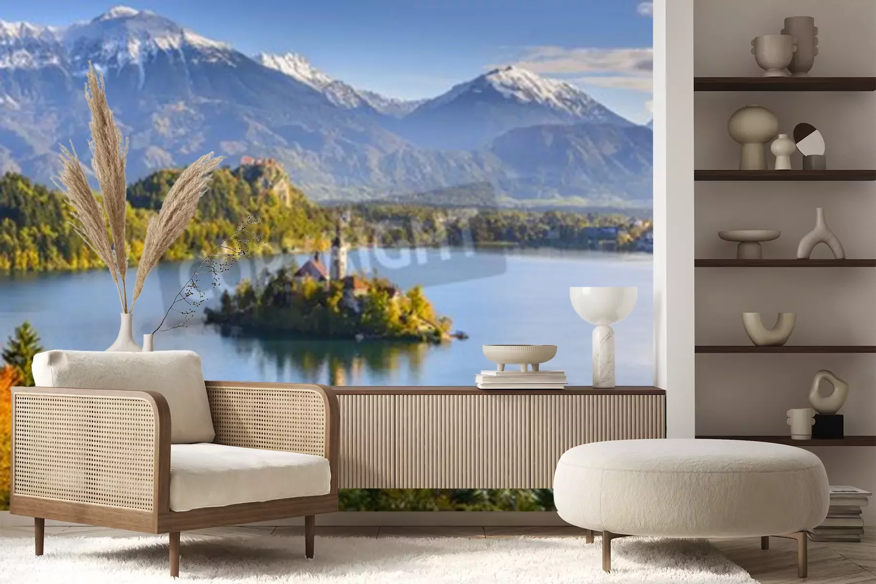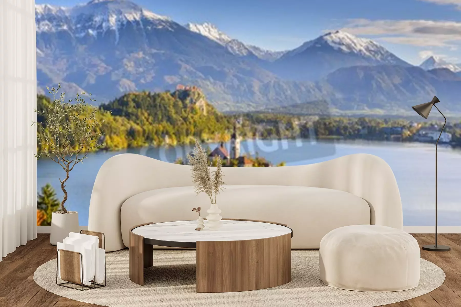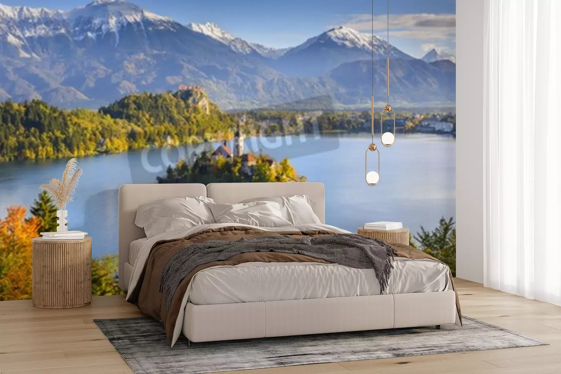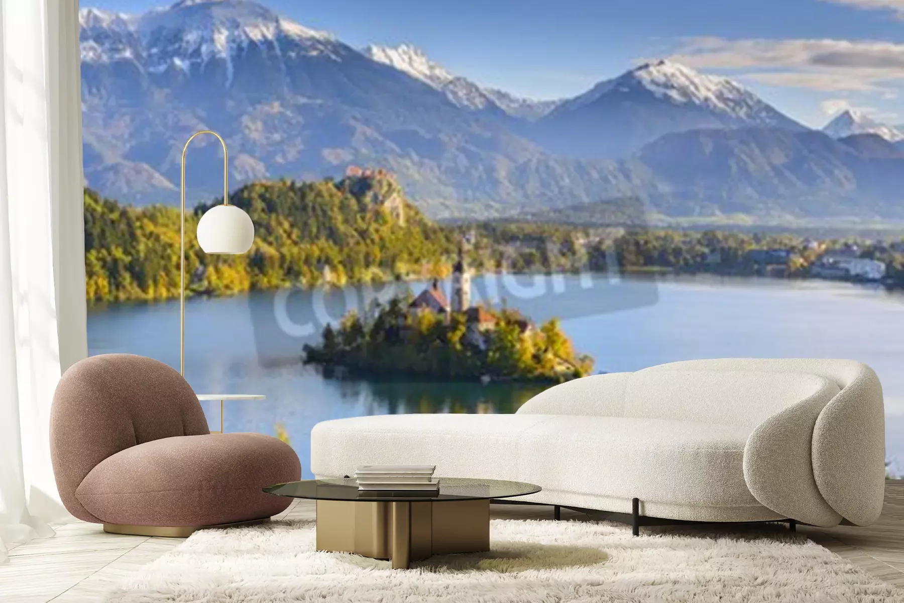 Fotobehang Panoramisch uitzicht op het meer van Bled, Slovenië