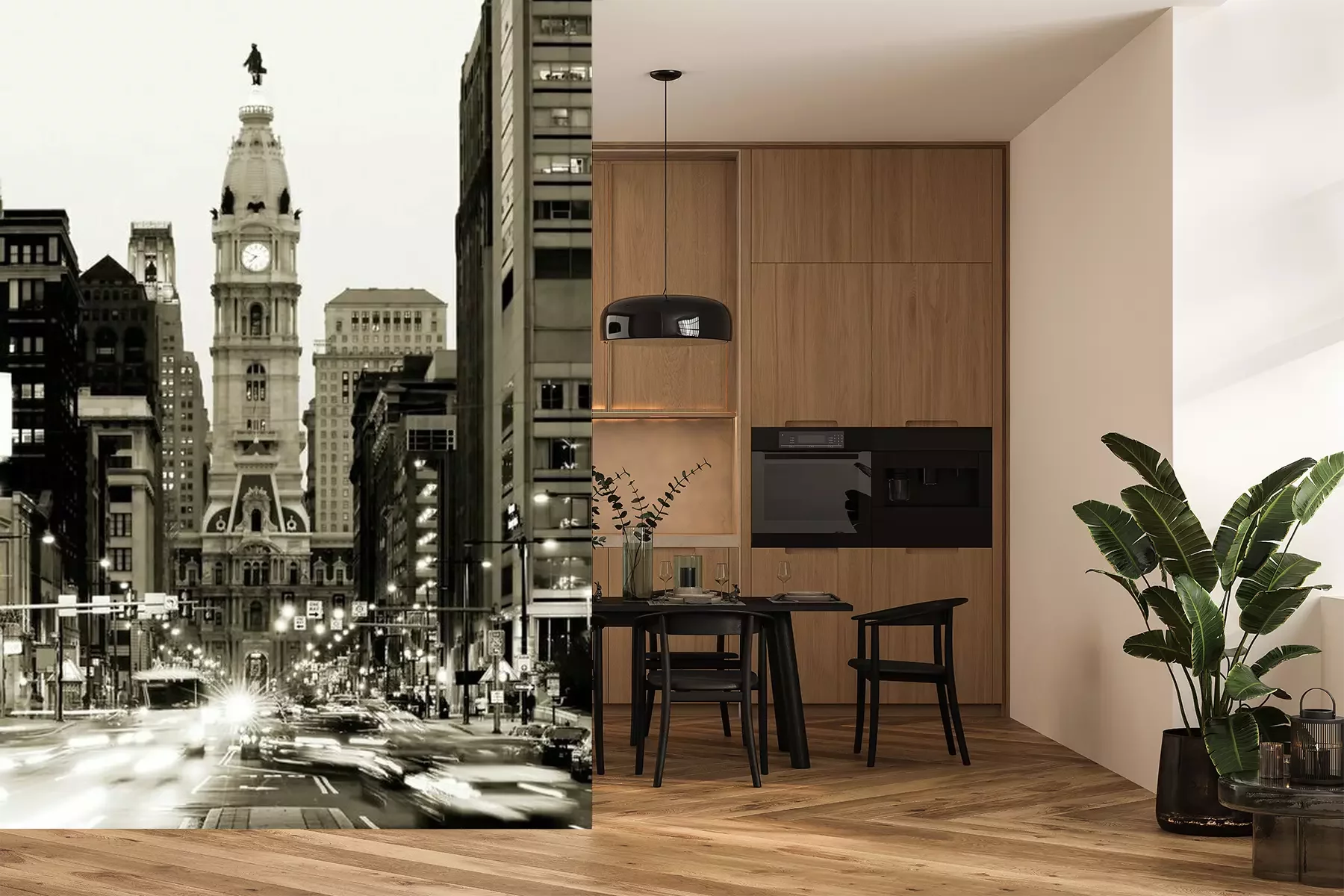 Het materiaal Premium is een glad vinyl op vlies, dat bestand is tegen uitrekken en vervorming. Het is dampdoorlatend – de muren kunnen vrij ademen – waardoor het geschikt is voor gebruik in de keuken en badkamer. Bij vervuiling kan het materiaal worden afgenomen met een vochtige doek. De maximale breedte van één baan bedraagt 95 of 105 cm, afhankelijk van de beschikbaarheid. Montage vindt plaats met de rand-aan-rand methode, wat een esthetisch resultaat zonder zichtbare naden oplevert. Omdat de lijm rechtstreeks op de muur wordt aangebracht, verloopt de installatie van het fotobehang snel en eenvoudig.