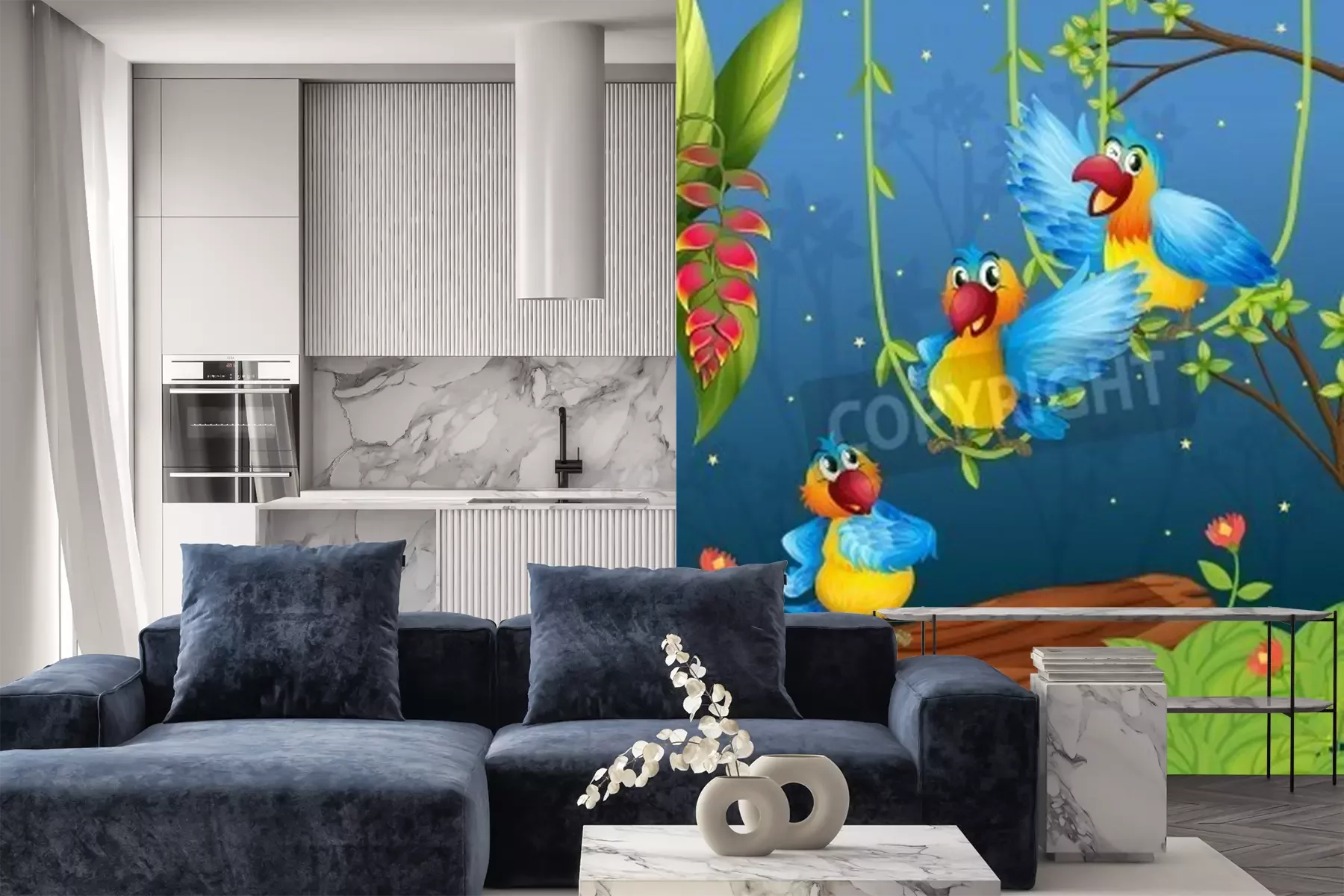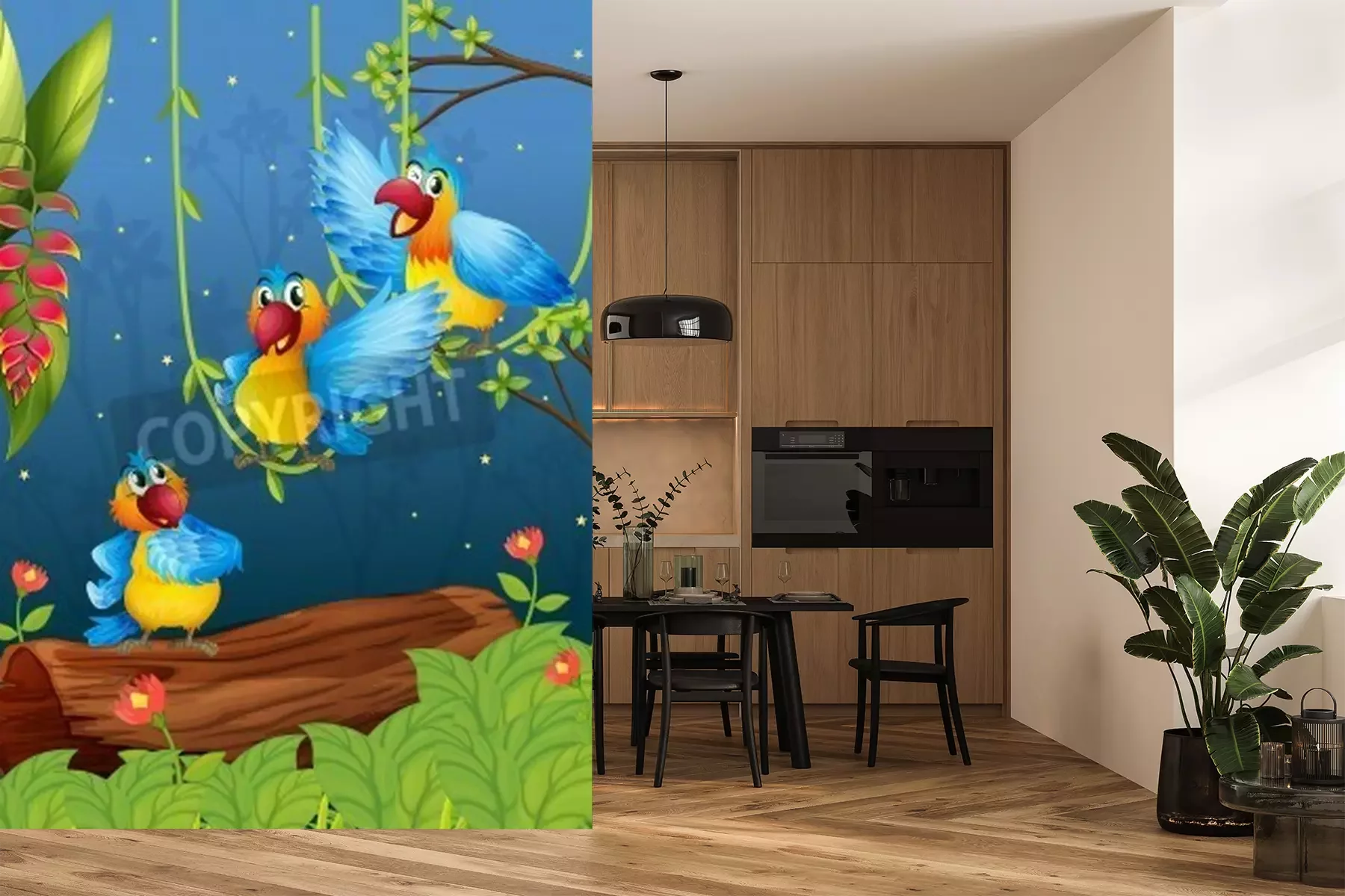Fotobehang Papegaaien op lianen
