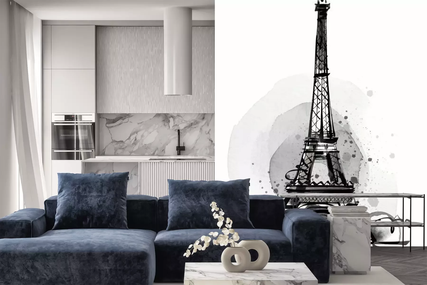Het materiaal Premium is een glad vinyl op vlies, dat bestand is tegen uitrekken en vervorming. Het is dampdoorlatend – de muren kunnen vrij ademen – waardoor het geschikt is voor gebruik in de keuken en badkamer. Bij vervuiling kan het materiaal worden afgenomen met een vochtige doek. De maximale breedte van één baan bedraagt 95 of 105 cm, afhankelijk van de beschikbaarheid. Montage vindt plaats met de rand-aan-rand methode, wat een esthetisch resultaat zonder zichtbare naden oplevert. Omdat de lijm rechtstreeks op de muur wordt aangebracht, verloopt de installatie van het fotobehang snel en eenvoudig.