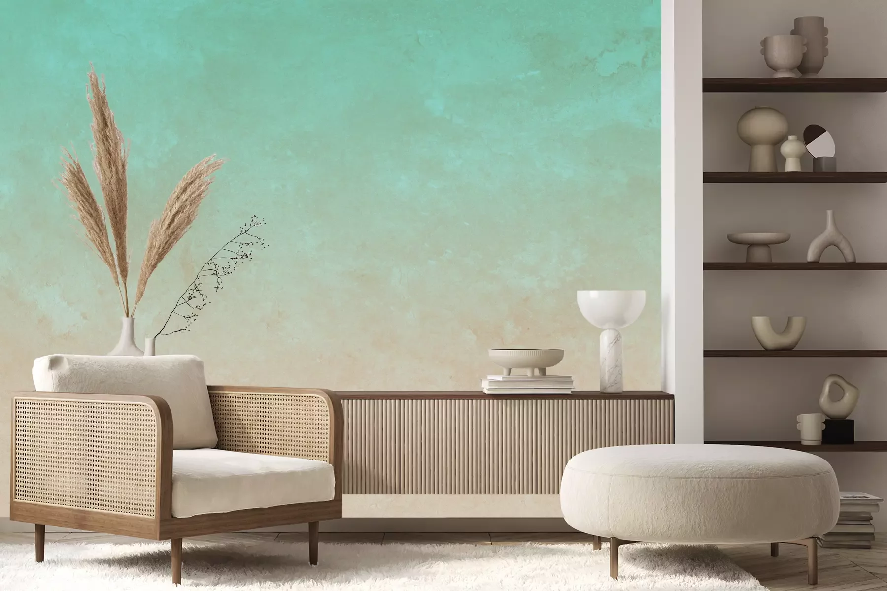 Het materiaal Premium+ is een gestructureerd vinyl op vlies met een gewicht van 255 g/m², dat kleine oneffenheden in de muur effectief camoufleert. De subtiele structuur van fijn zand geeft het oppervlak een exclusieve uitstraling, terwijl de halfmatte afwerking de diepte van de kleuren benadrukt. Het materiaal is dampdoorlatend, waardoor het ook in de keuken en badkamer kan worden gebruikt. De maximale breedte van één baan bedraagt 100 cm – bij grotere afmetingen wordt het fotobehang in meerdere gelijke banen verdeeld. De lijm wordt direct op de muur aangebracht en het behang wordt rand-aan-rand geplakt, wat zorgt voor een esthetisch resultaat zonder zichtbare naden. Het oppervlak kan gemakkelijk worden schoongemaakt door het voorzichtig af te nemen met een vochtige doek.