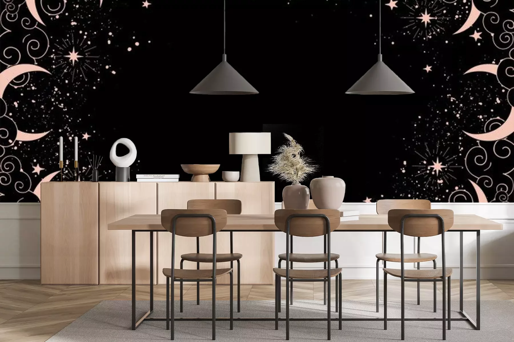 Fotobehang Patroon van roze manen tussen wolken op zwarte achtergrond