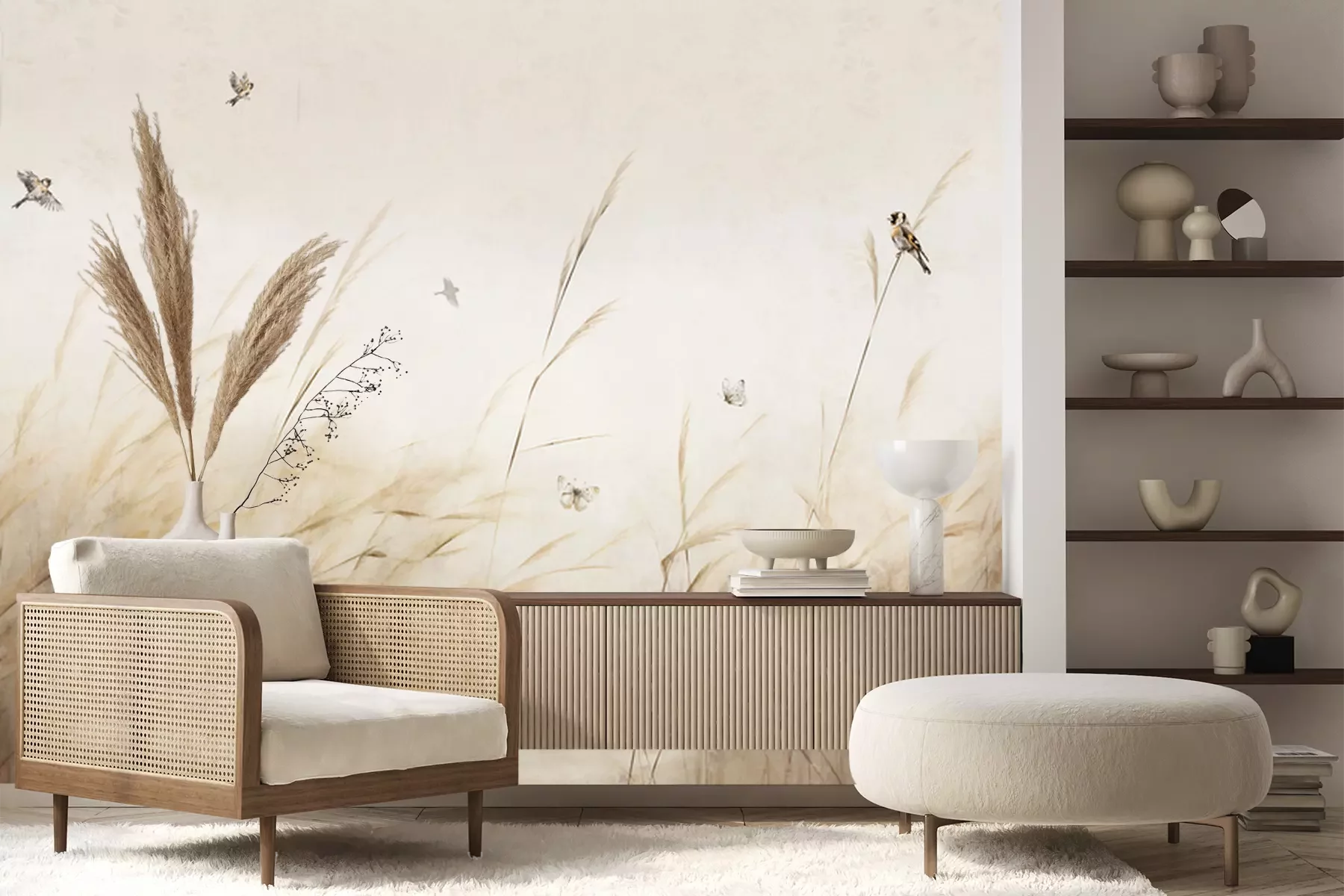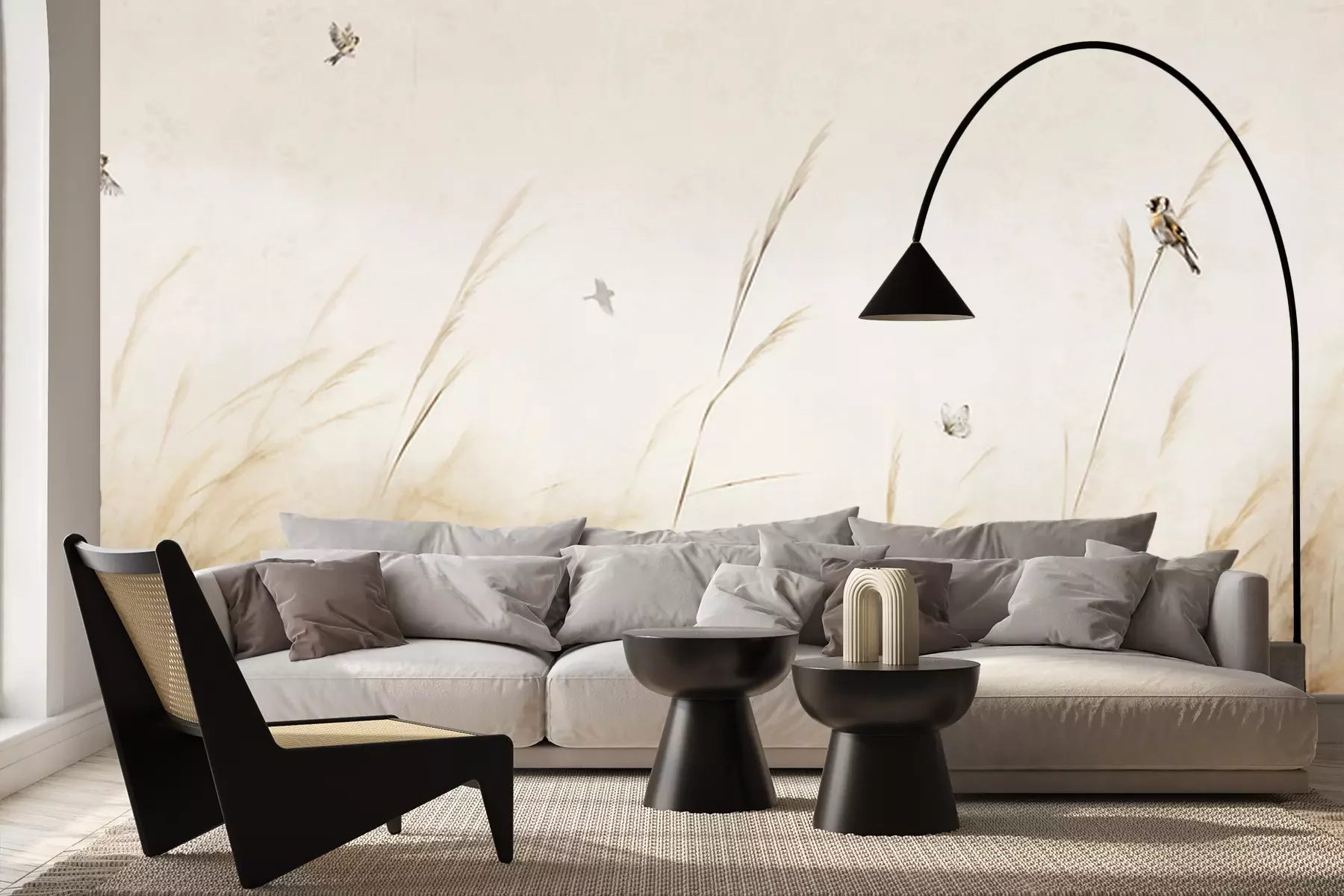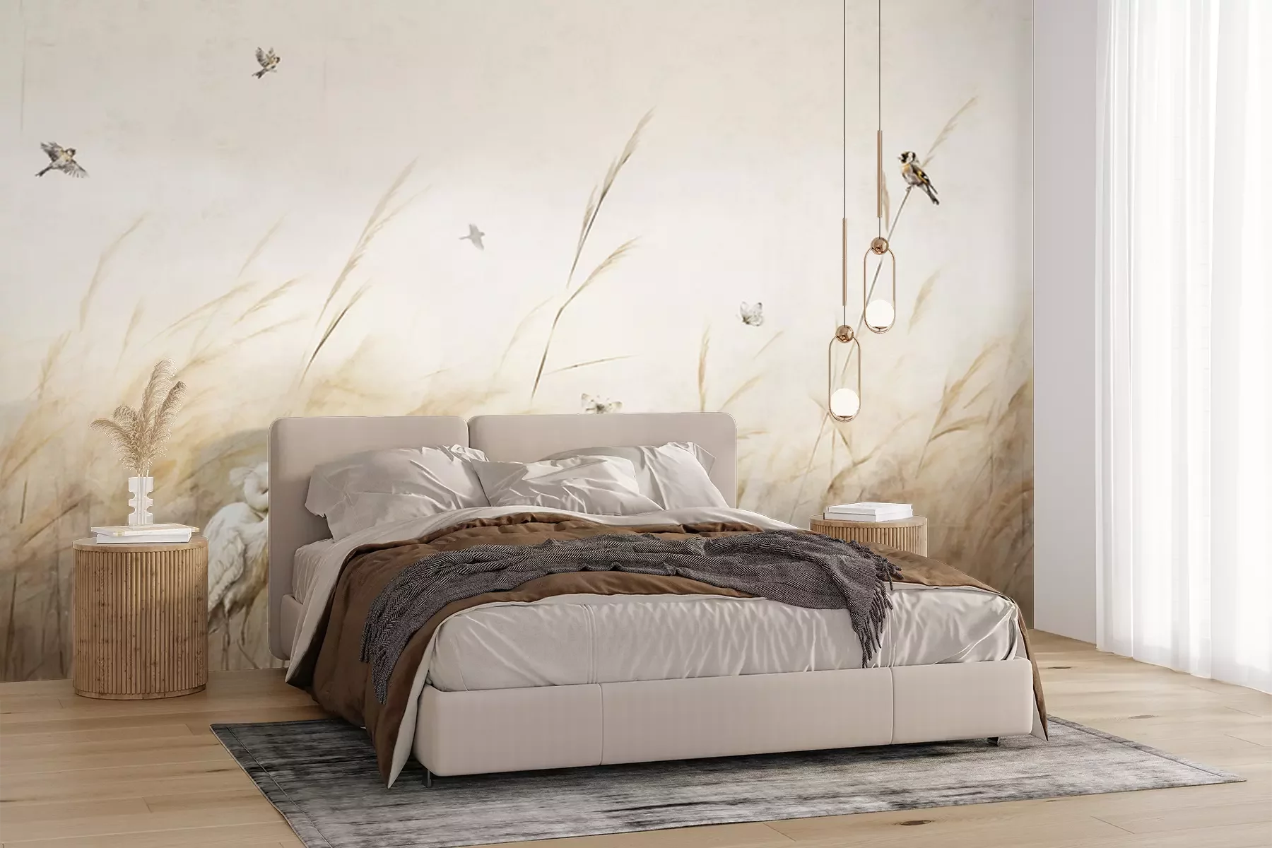 Flock of birds flying .Wanddecoratie op groot formaat kan niet alleen een kamer versieren, maar ook je woning openstellen voor een schilderachtig landschap. Het is genoeg om te kiezen voor een ontwerp zoals onze fotobehang vogels presenteert. Vogels die zich verschuilen tussen riet en pampasgras brengen een rustgevende natuur in de inrichting, zelfs als je in de stad woont en buiten een betonjungle ziet. Je zult aangenaam verrast zijn hoeveel zo'n fotobehang weide kan veranderen. Het grasland en het water erachter, gehuld in mist, vergroten optisch je kamer en geven een gevoel van diepte. Dit is dus een voorbeeld van uitstekende decoratie voor een kleine woonkamer, slaapkamer of zelfs badkamer. Het volstaat om te kiezen voor de oplossing van waterbestendig fotobehang vlinders. Vlinders en watervogels vliegend boven het gras zullen een perfecte aanvulling zijn op de plek waar je lange, ontspannende baden neemt. Het laminaatbedekte ontwerp zal bestand zijn tegen schadelijke effecten van water en vocht, dus het zal je vele jaren van dienst zijn. Om dezelfde reden is dit ook het ideale keuken fotobehang. Vlinders en vogels worden een mooie decoratie, en als het patroon vies wordt, kun je vlekken gemakkelijk verwijderen. Omdat het geen foto is maar een subtiel geschilderd kunstwerk, is dit buitengewoon artistiek vlinders fotobehang. Vogels en vlinders als decoratief motief zullen goed passen in veel verschillende arrangementen. Het is een uitstekend idee voor een woonkamer ingericht in de japandi-stijl, die Japanse inspiraties combineert met Scandinavische minimalisme. Waarom stellen we juist dit motief voor vogels fotobehang voor? Vogels op de voorgrond, vooral de witte reiger, roepen associaties op met het land van de bloeiende kersenbloesems. Vul zo'n decor aan met posters van reproducties van Japanse houtsneden en je krijgt een betoverende stijl. Vogels passen ook goed bij de momenteel trendy boho-interieurs. Fotobehang vogels in ingetogen kleuren wordt een harmonieuze aanvulling op de ruimte. In zo'n ingerichte slaapkamer is het de moeite waard om grote vazen met gedroogd pampasgras te plaatsen en macramés aan de muur te hangen. Een andere stylingoptie is de landelijke stijl, waar zowel vogels als vlinders goed passen. Fotobehang vogels met een weide brengt een zorgeloze en idyllische sfeer in de ruimte.
