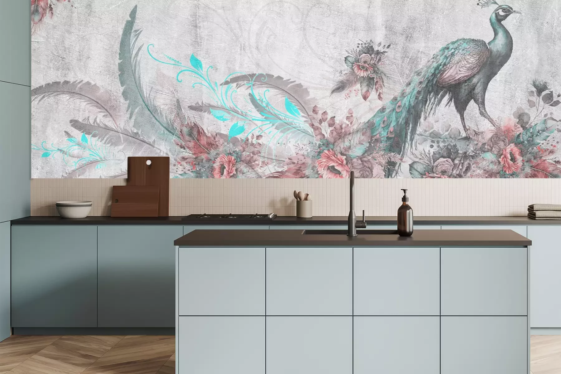 Het materiaal Premium is een glad vinyl op vlies, dat bestand is tegen uitrekken en vervorming. Het is dampdoorlatend – de muren kunnen vrij ademen – waardoor het geschikt is voor gebruik in de keuken en badkamer. Bij vervuiling kan het materiaal worden afgenomen met een vochtige doek. De maximale breedte van één baan bedraagt 95 of 105 cm, afhankelijk van de beschikbaarheid. Montage vindt plaats met de rand-aan-rand methode, wat een esthetisch resultaat zonder zichtbare naden oplevert. Omdat de lijm rechtstreeks op de muur wordt aangebracht, verloopt de installatie van het fotobehang snel en eenvoudig.
