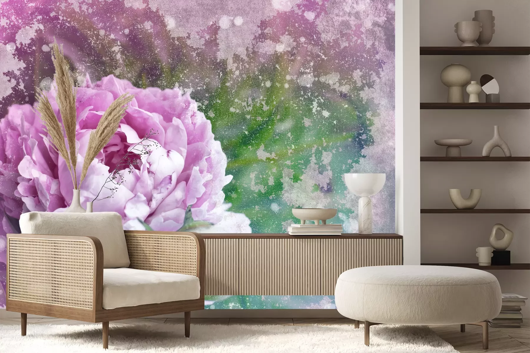Het materiaal Premium+ is een gestructureerd vinyl op vlies met een gewicht van 255 g/m², dat kleine oneffenheden in de muur effectief camoufleert. De subtiele structuur van fijn zand geeft het oppervlak een exclusieve uitstraling, terwijl de halfmatte afwerking de diepte van de kleuren benadrukt. Het materiaal is dampdoorlatend, waardoor het ook in de keuken en badkamer kan worden gebruikt. De maximale breedte van één baan bedraagt 100 cm – bij grotere afmetingen wordt het fotobehang in meerdere gelijke banen verdeeld. De lijm wordt direct op de muur aangebracht en het behang wordt rand-aan-rand geplakt, wat zorgt voor een esthetisch resultaat zonder zichtbare naden. Het oppervlak kan gemakkelijk worden schoongemaakt door het voorzichtig af te nemen met een vochtige doek.