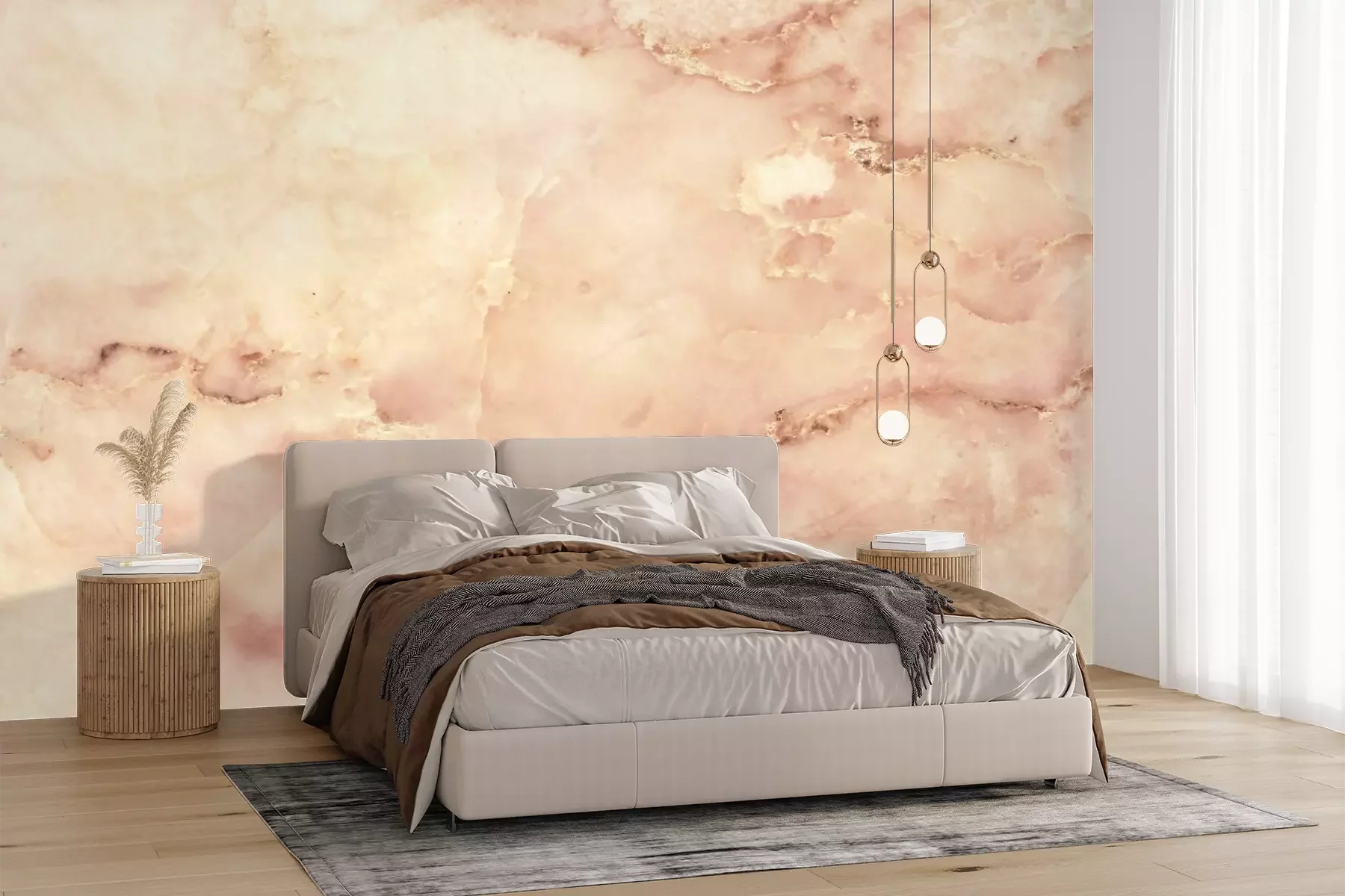 Het materiaal Premium+ is een gestructureerd vinyl op vlies met een gewicht van 255 g/m², dat kleine oneffenheden in de muur effectief camoufleert. De subtiele structuur van fijn zand geeft het oppervlak een exclusieve uitstraling, terwijl de halfmatte afwerking de diepte van de kleuren benadrukt. Het materiaal is dampdoorlatend, waardoor het ook in de keuken en badkamer kan worden gebruikt. De maximale breedte van één baan bedraagt 100 cm – bij grotere afmetingen wordt het fotobehang in meerdere gelijke banen verdeeld. De lijm wordt direct op de muur aangebracht en het behang wordt rand-aan-rand geplakt, wat zorgt voor een esthetisch resultaat zonder zichtbare naden. Het oppervlak kan gemakkelijk worden schoongemaakt door het voorzichtig af te nemen met een vochtige doek.