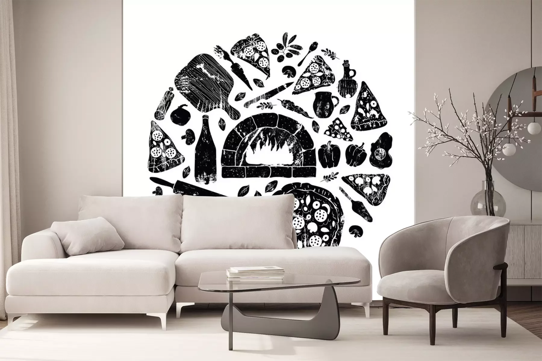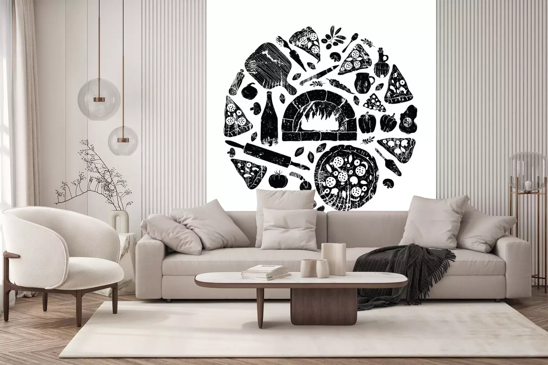 Fotobehang Pizza circle background. Collection of black grunge elements for menu design restaurant or pizzeria. Vintage style. Vector.
