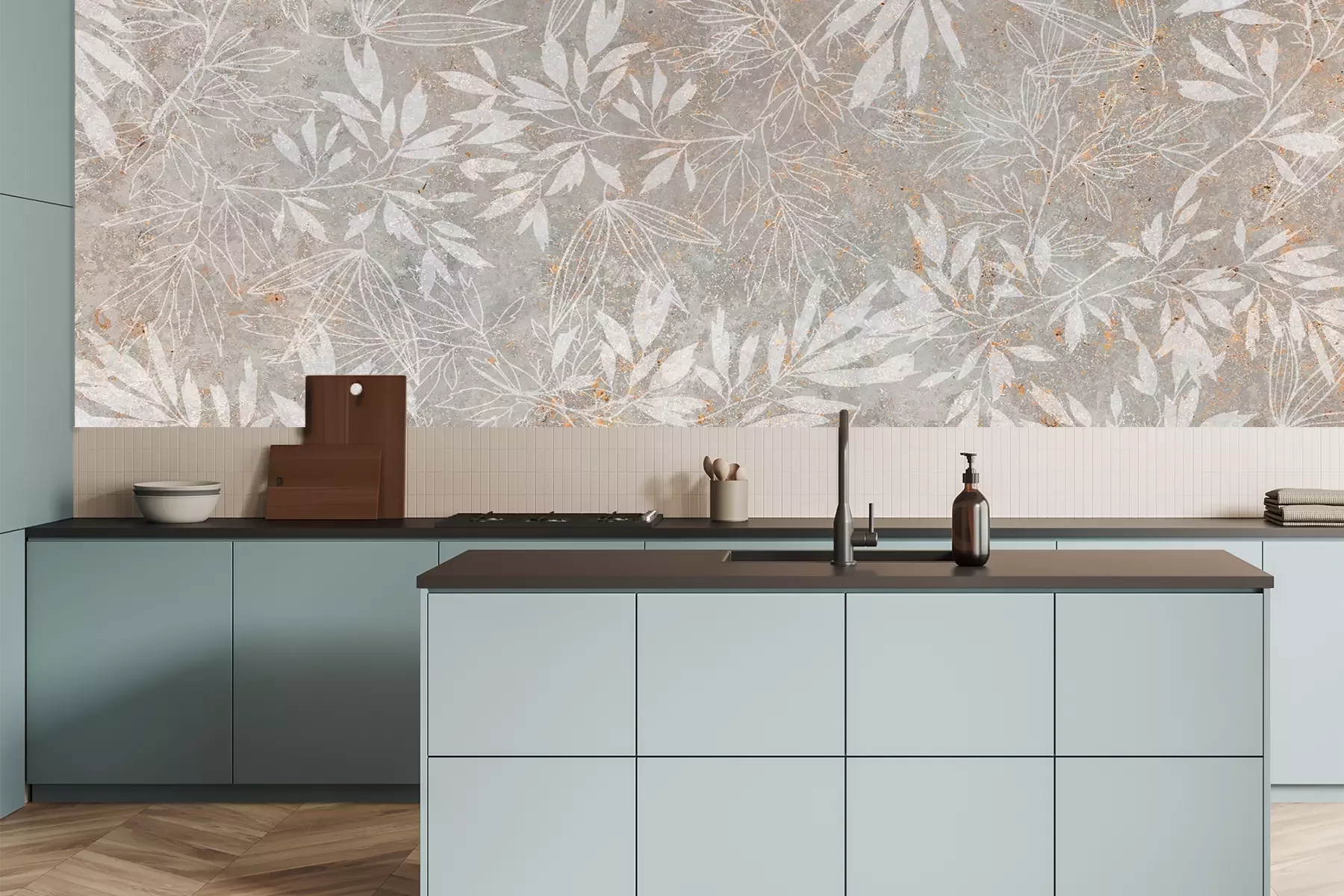 Het materiaal Premium is een glad vinyl op vlies, dat bestand is tegen uitrekken en vervorming. Het is dampdoorlatend – de muren kunnen vrij ademen – waardoor het geschikt is voor gebruik in de keuken en badkamer. Bij vervuiling kan het materiaal worden afgenomen met een vochtige doek. De maximale breedte van één baan bedraagt 95 of 105 cm, afhankelijk van de beschikbaarheid. Montage vindt plaats met de rand-aan-rand methode, wat een esthetisch resultaat zonder zichtbare naden oplevert. Omdat de lijm rechtstreeks op de muur wordt aangebracht, verloopt de installatie van het fotobehang snel en eenvoudig.