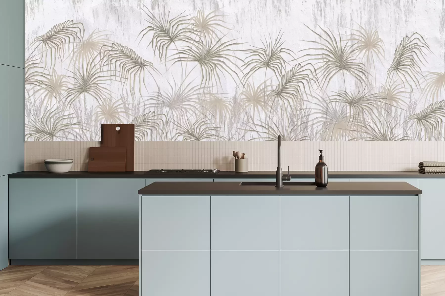 Het materiaal Premium is een glad vinyl op vlies, dat bestand is tegen uitrekken en vervorming. Het is dampdoorlatend – de muren kunnen vrij ademen – waardoor het geschikt is voor gebruik in de keuken en badkamer. Bij vervuiling kan het materiaal worden afgenomen met een vochtige doek. De maximale breedte van één baan bedraagt 95 of 105 cm, afhankelijk van de beschikbaarheid. Montage vindt plaats met de rand-aan-rand methode, wat een esthetisch resultaat zonder zichtbare naden oplevert. Omdat de lijm rechtstreeks op de muur wordt aangebracht, verloopt de installatie van het fotobehang snel en eenvoudig.