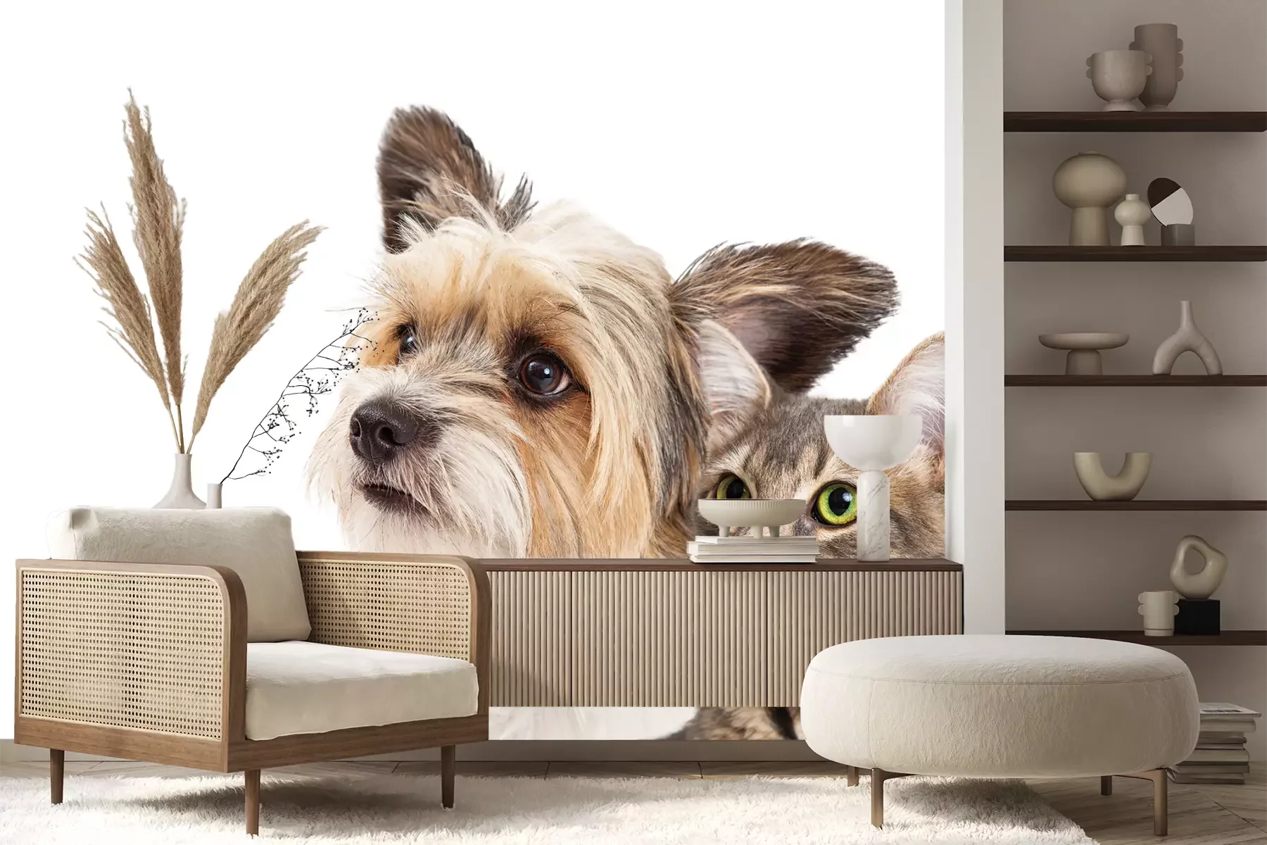 Het materiaal Premium+ is een gestructureerd vinyl op vlies met een gewicht van 255 g/m², dat kleine oneffenheden in de muur effectief camoufleert. De subtiele structuur van fijn zand geeft het oppervlak een exclusieve uitstraling, terwijl de halfmatte afwerking de diepte van de kleuren benadrukt. Het materiaal is dampdoorlatend, waardoor het ook in de keuken en badkamer kan worden gebruikt. De maximale breedte van één baan bedraagt 100 cm – bij grotere afmetingen wordt het fotobehang in meerdere gelijke banen verdeeld. De lijm wordt direct op de muur aangebracht en het behang wordt rand-aan-rand geplakt, wat zorgt voor een esthetisch resultaat zonder zichtbare naden. Het oppervlak kan gemakkelijk worden schoongemaakt door het voorzichtig af te nemen met een vochtige doek.