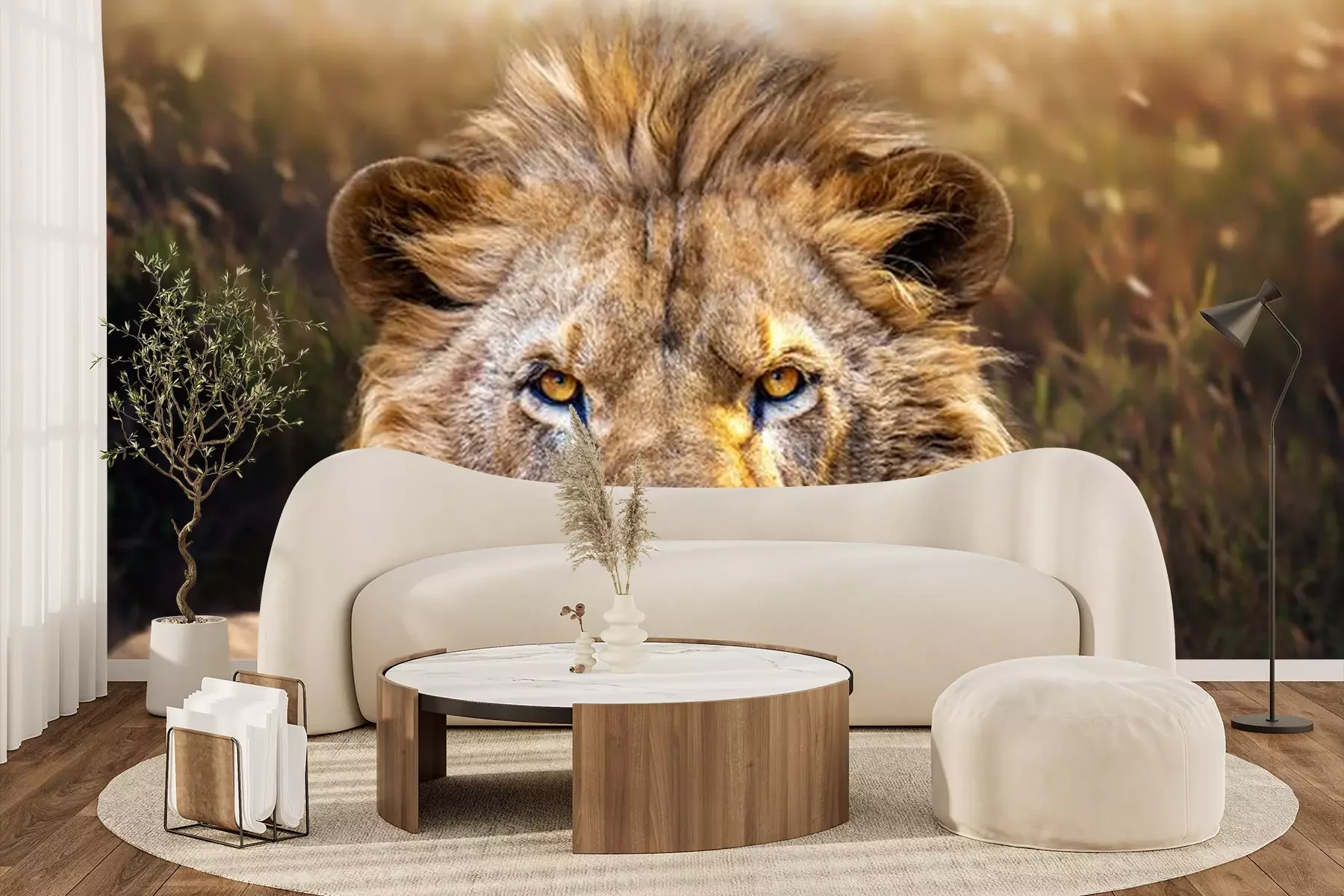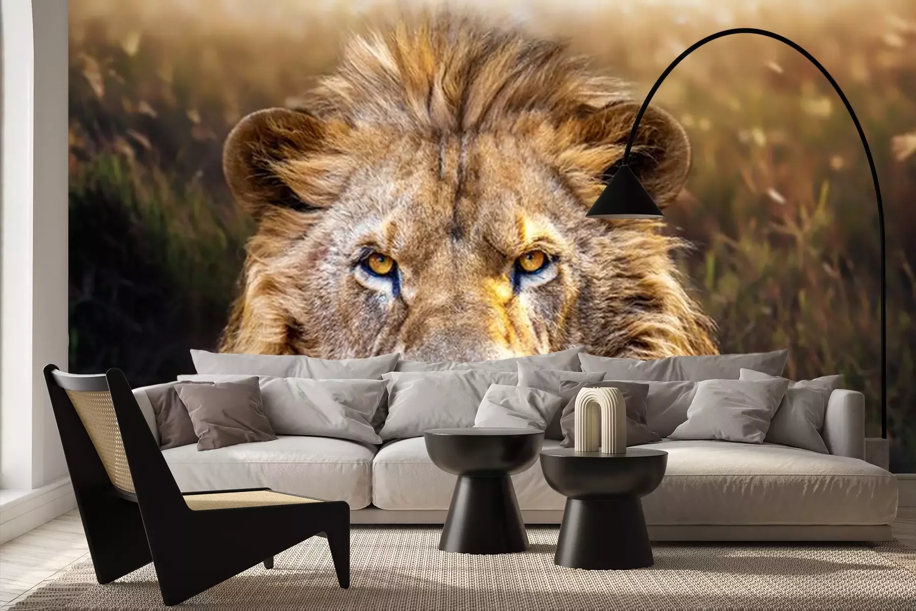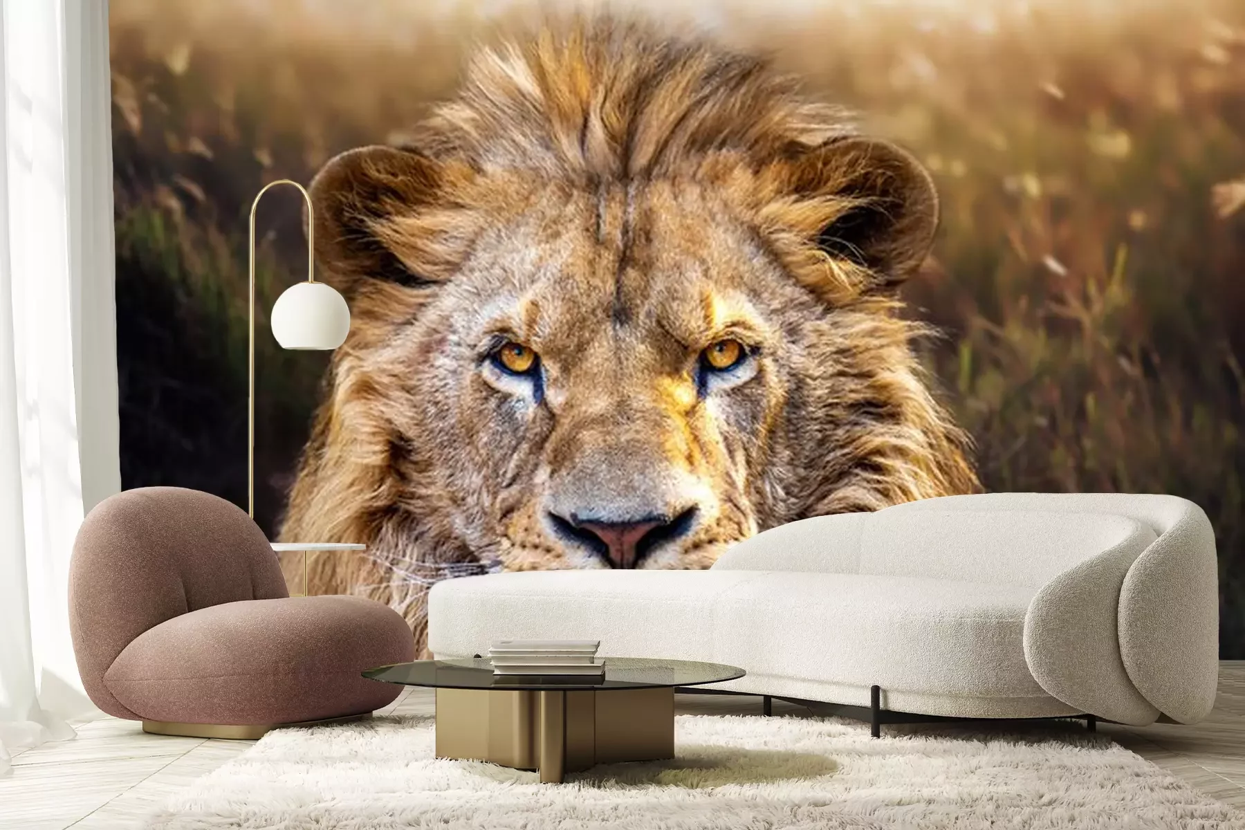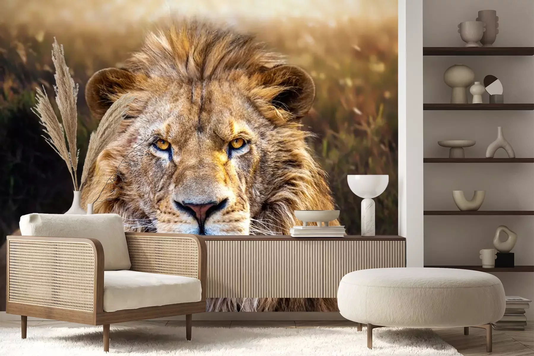 Fotobehang Portret van een leeuw met warme zonnestralen op de achtergrond