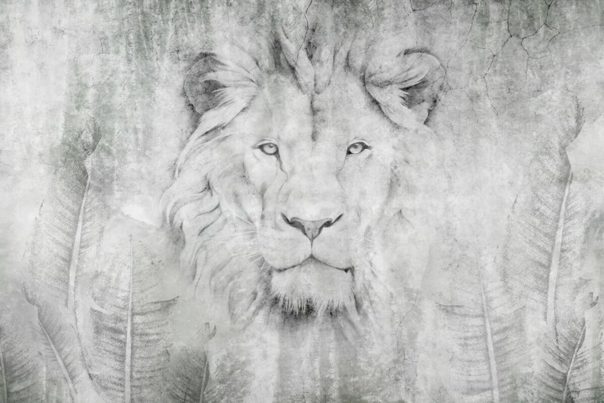 Portret van een leeuw tussen bladeren aan de muur