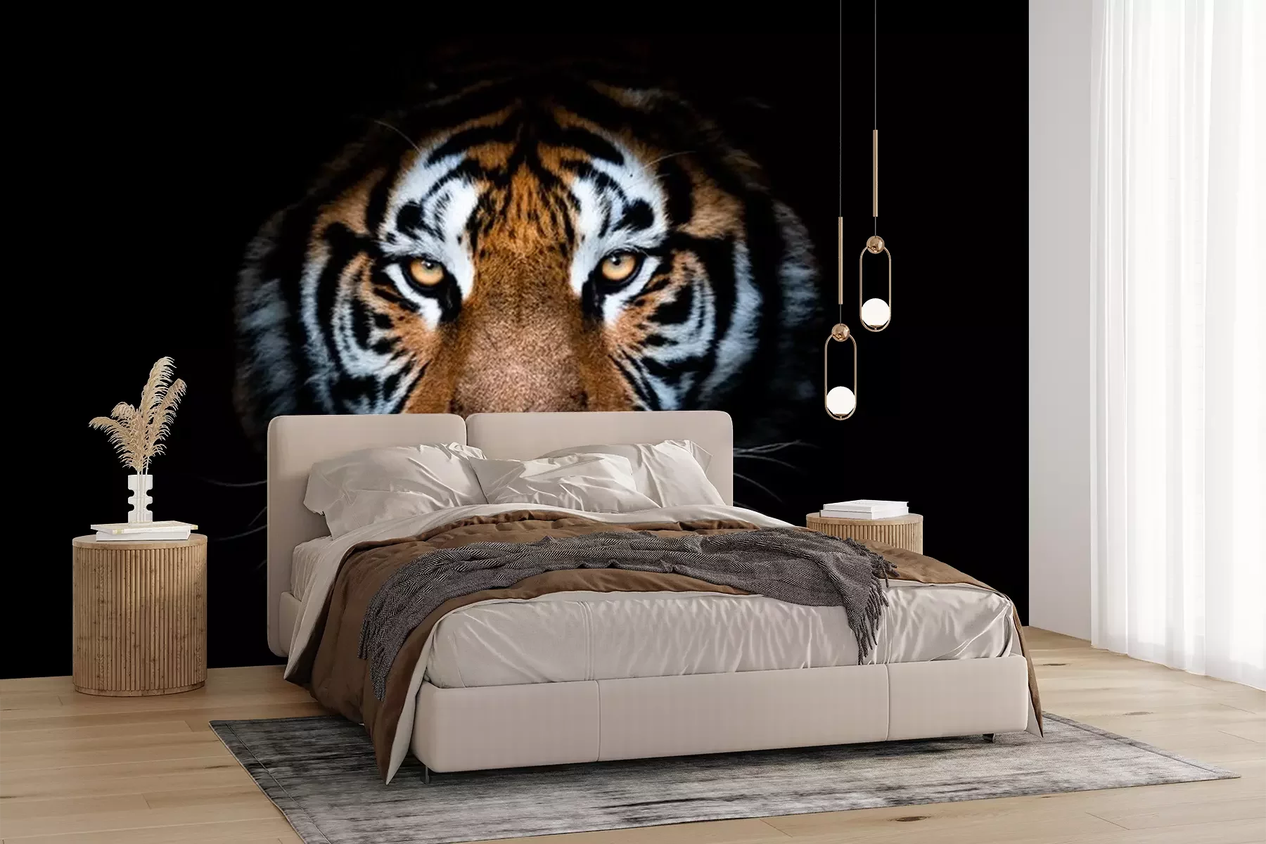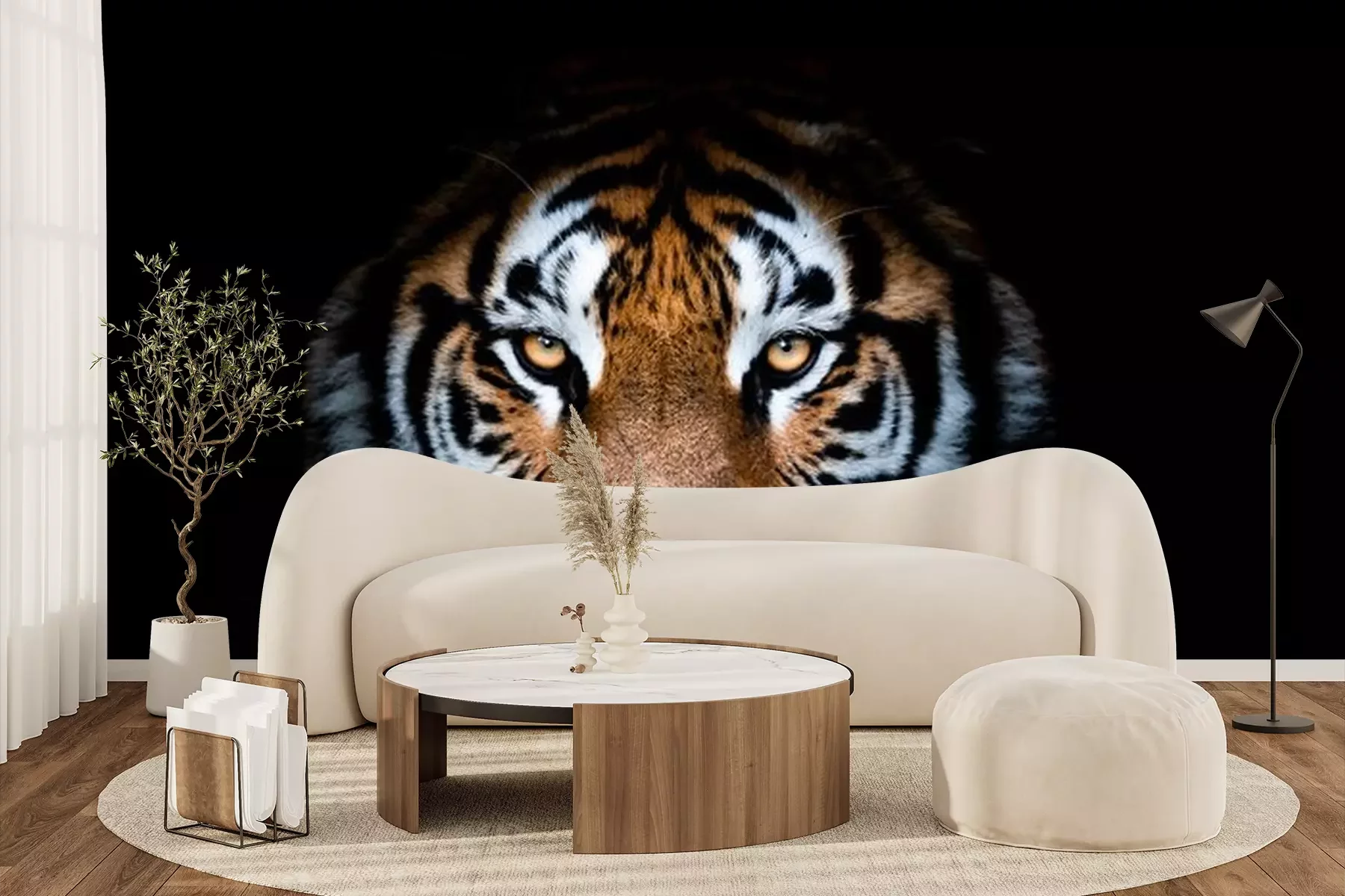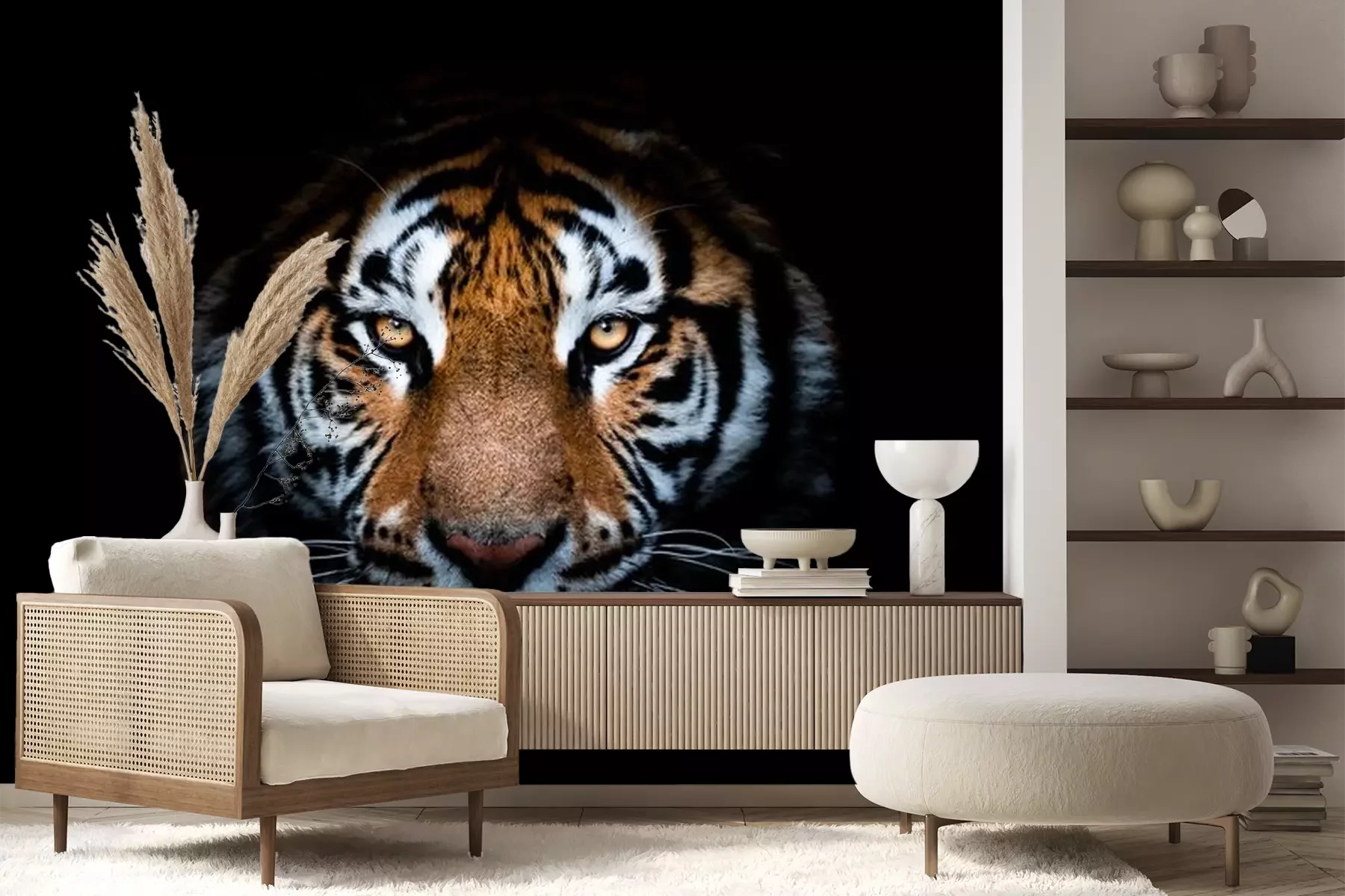 Fotobehang Portret van een tijger op zwarte achtergrond