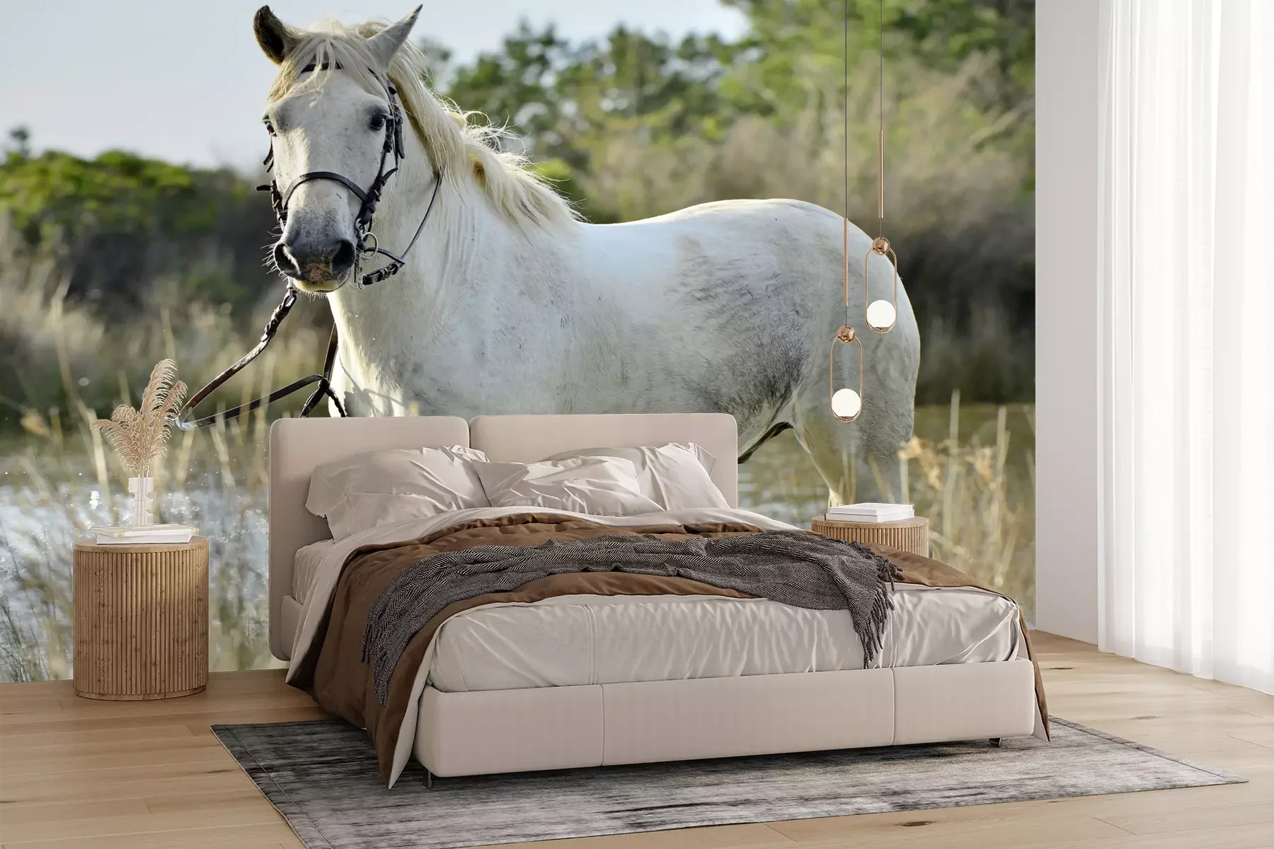 Het materiaal Premium+ is een gestructureerd vinyl op vlies met een gewicht van 255 g/m², dat kleine oneffenheden in de muur effectief camoufleert. De subtiele structuur van fijn zand geeft het oppervlak een exclusieve uitstraling, terwijl de halfmatte afwerking de diepte van de kleuren benadrukt. Het materiaal is dampdoorlatend, waardoor het ook in de keuken en badkamer kan worden gebruikt. De maximale breedte van één baan bedraagt 100 cm – bij grotere afmetingen wordt het fotobehang in meerdere gelijke banen verdeeld. De lijm wordt direct op de muur aangebracht en het behang wordt rand-aan-rand geplakt, wat zorgt voor een esthetisch resultaat zonder zichtbare naden. Het oppervlak kan gemakkelijk worden schoongemaakt door het voorzichtig af te nemen met een vochtige doek.