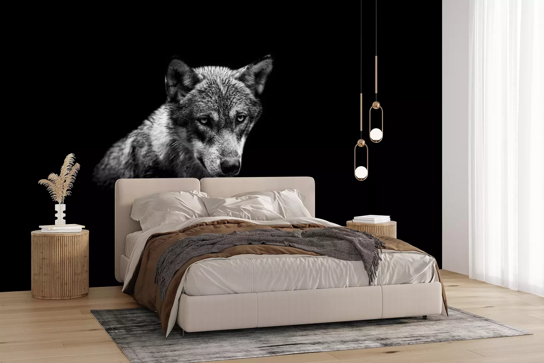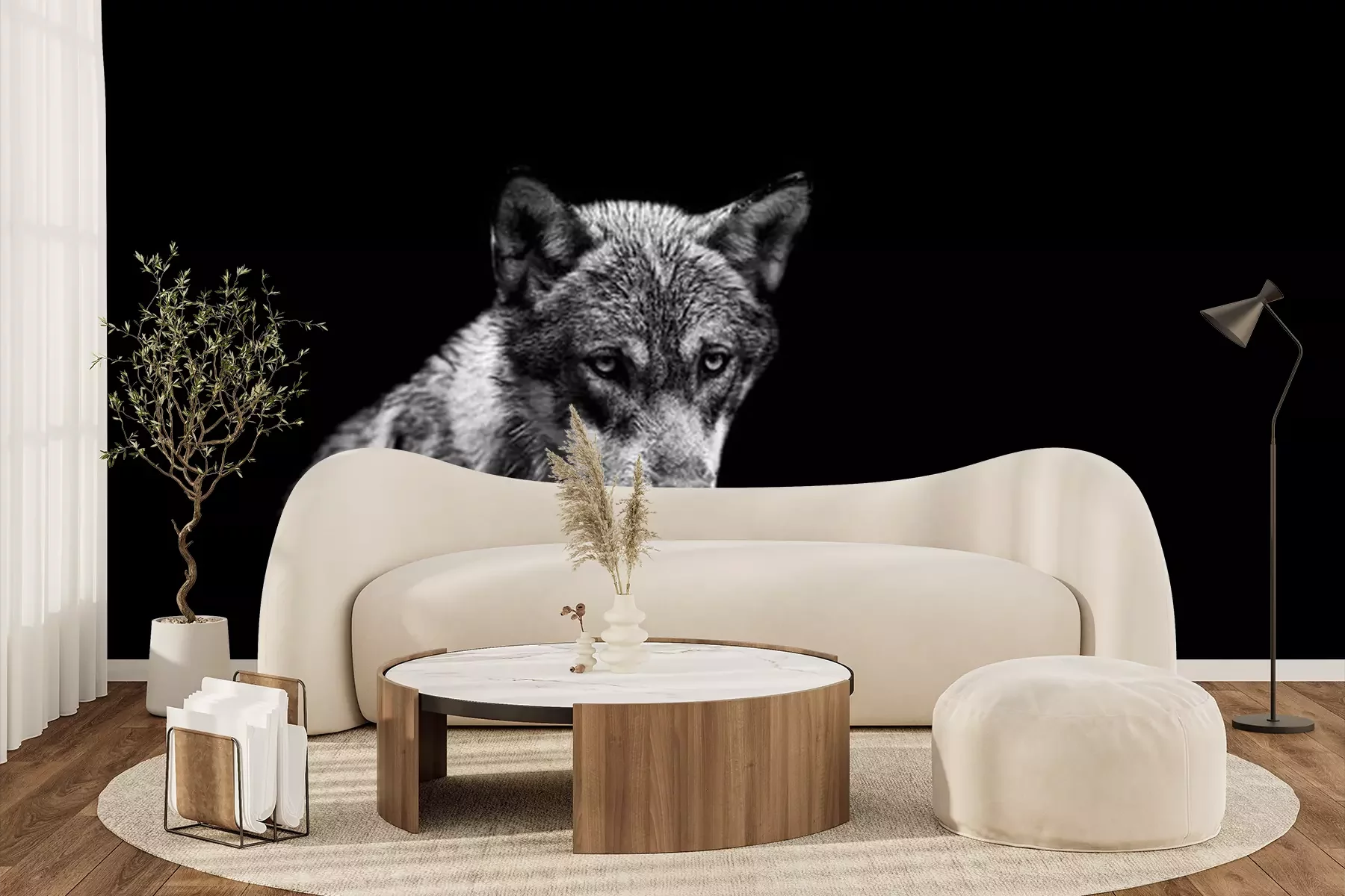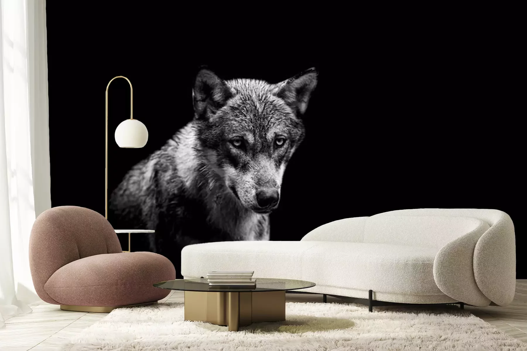 Fotobehang Portret van een wolf op zwarte achtergrond