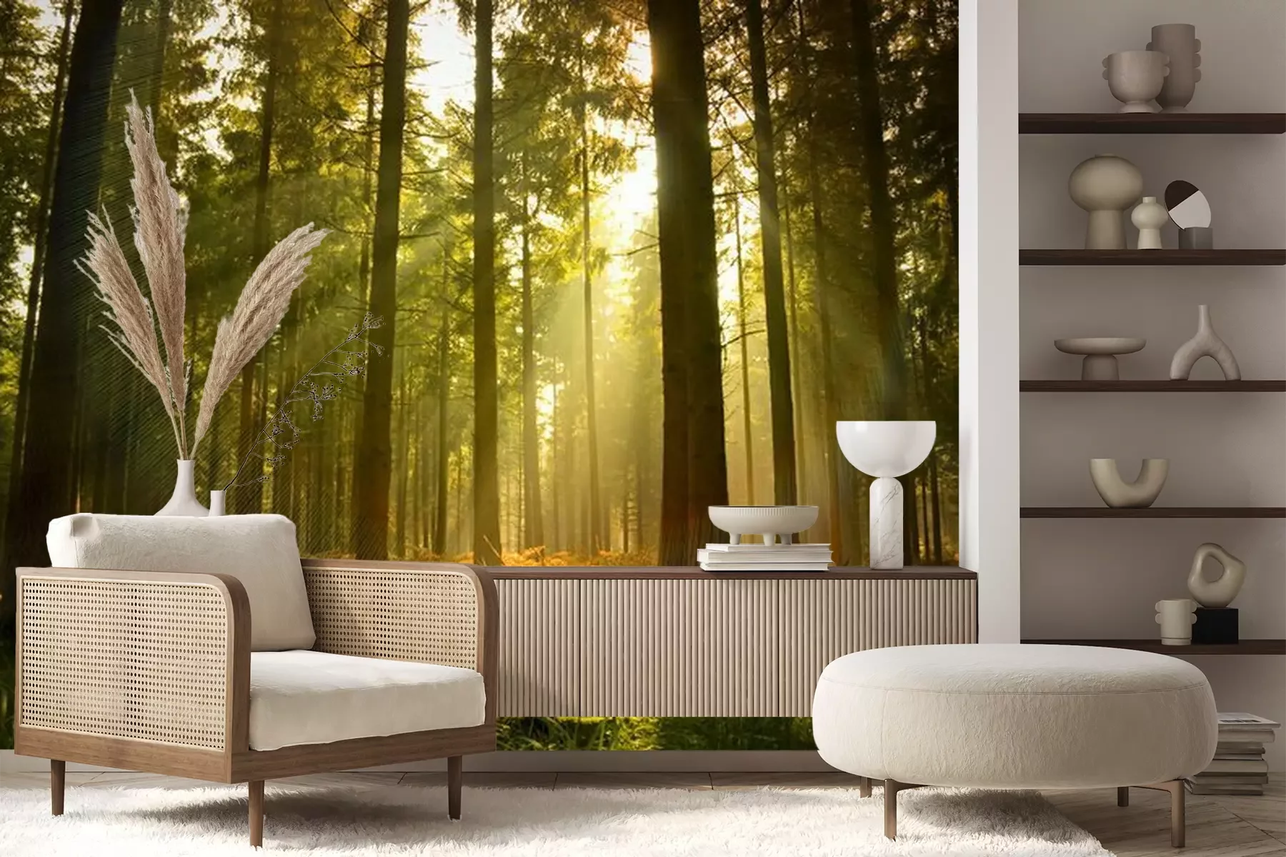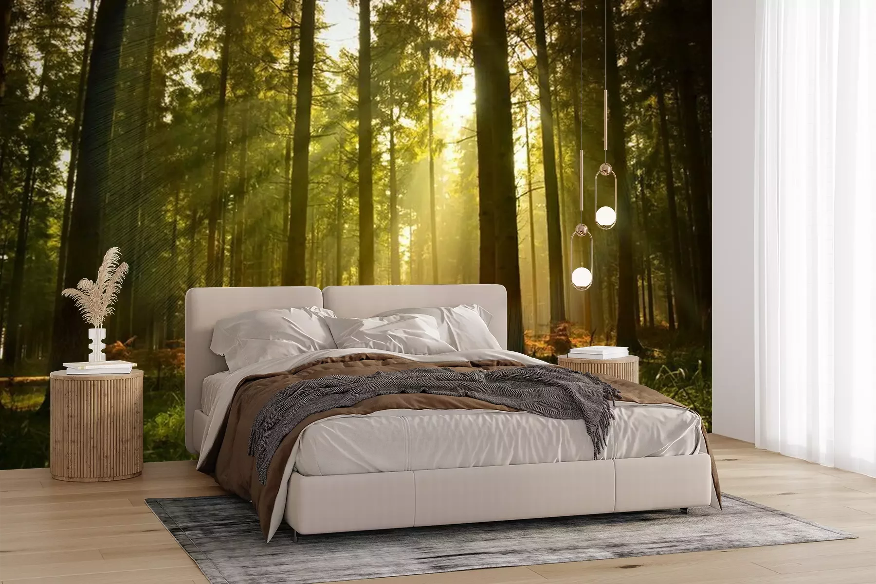 Het materiaal Premium+ is een gestructureerd vinyl op vlies met een gewicht van 255 g/m², dat kleine oneffenheden in de muur effectief camoufleert. De subtiele structuur van fijn zand geeft het oppervlak een exclusieve uitstraling, terwijl de halfmatte afwerking de diepte van de kleuren benadrukt. Het materiaal is dampdoorlatend, waardoor het ook in de keuken en badkamer kan worden gebruikt. De maximale breedte van één baan bedraagt 100 cm – bij grotere afmetingen wordt het fotobehang in meerdere gelijke banen verdeeld. De lijm wordt direct op de muur aangebracht en het behang wordt rand-aan-rand geplakt, wat zorgt voor een esthetisch resultaat zonder zichtbare naden. Het oppervlak kan gemakkelijk worden schoongemaakt door het voorzichtig af te nemen met een vochtige doek.