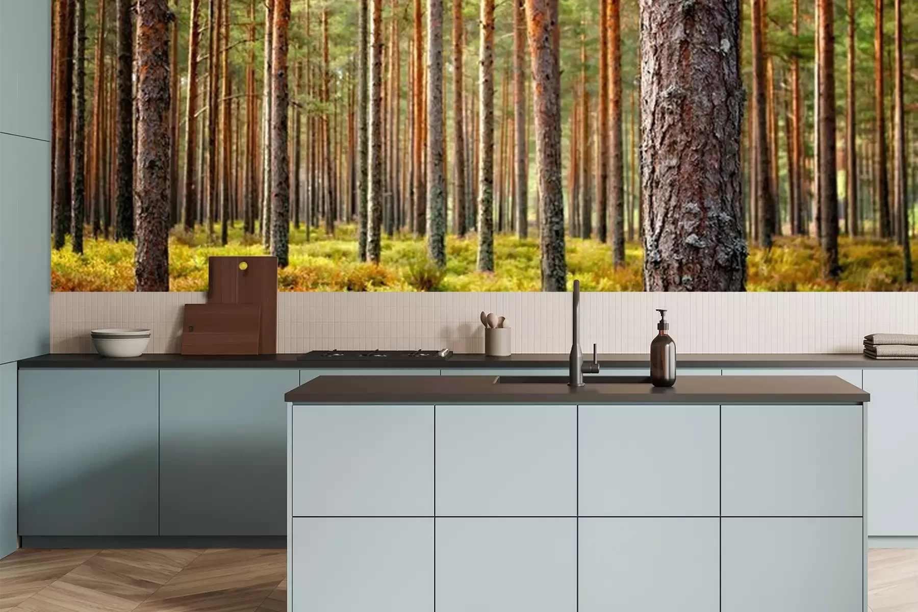 Het materiaal Premium is een glad vinyl op vlies, dat bestand is tegen uitrekken en vervorming. Het is dampdoorlatend – de muren kunnen vrij ademen – waardoor het geschikt is voor gebruik in de keuken en badkamer. Bij vervuiling kan het materiaal worden afgenomen met een vochtige doek. De maximale breedte van één baan bedraagt 95 of 105 cm, afhankelijk van de beschikbaarheid. Montage vindt plaats met de rand-aan-rand methode, wat een esthetisch resultaat zonder zichtbare naden oplevert. Omdat de lijm rechtstreeks op de muur wordt aangebracht, verloopt de installatie van het fotobehang snel en eenvoudig.