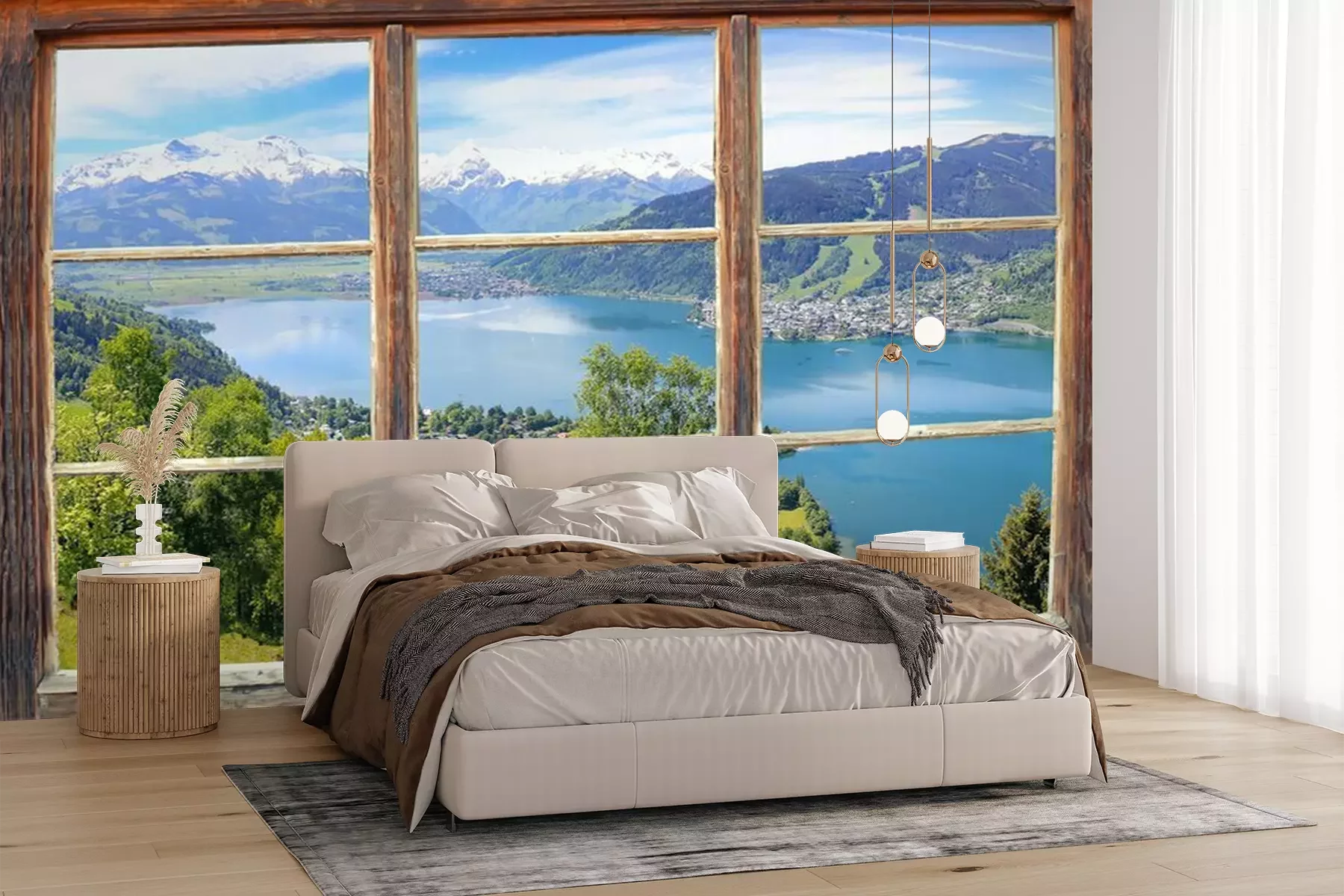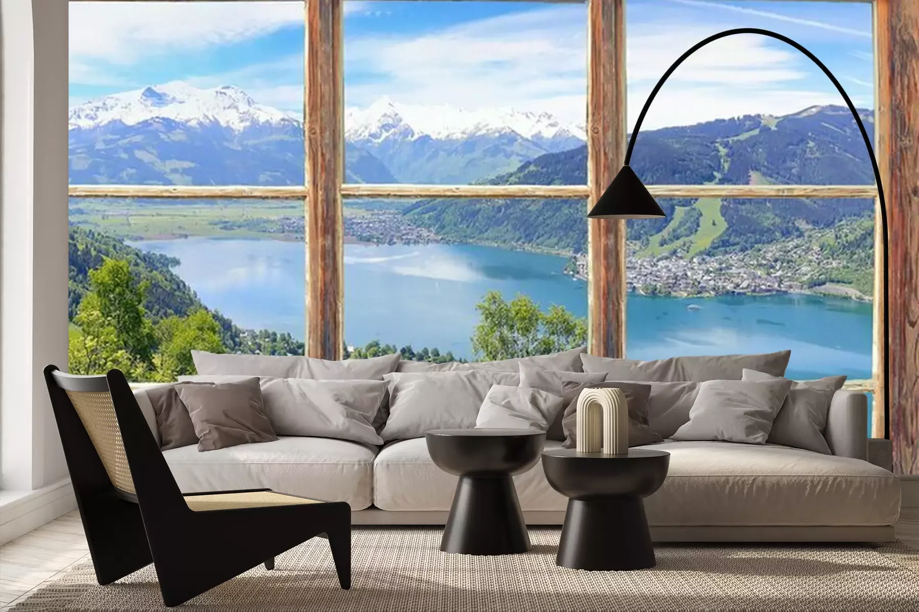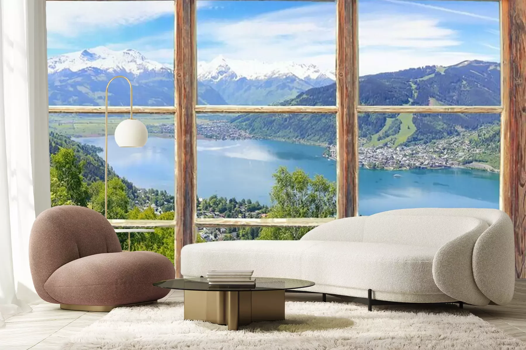 Uitzicht vanuit het raam op de bergenFotobehang