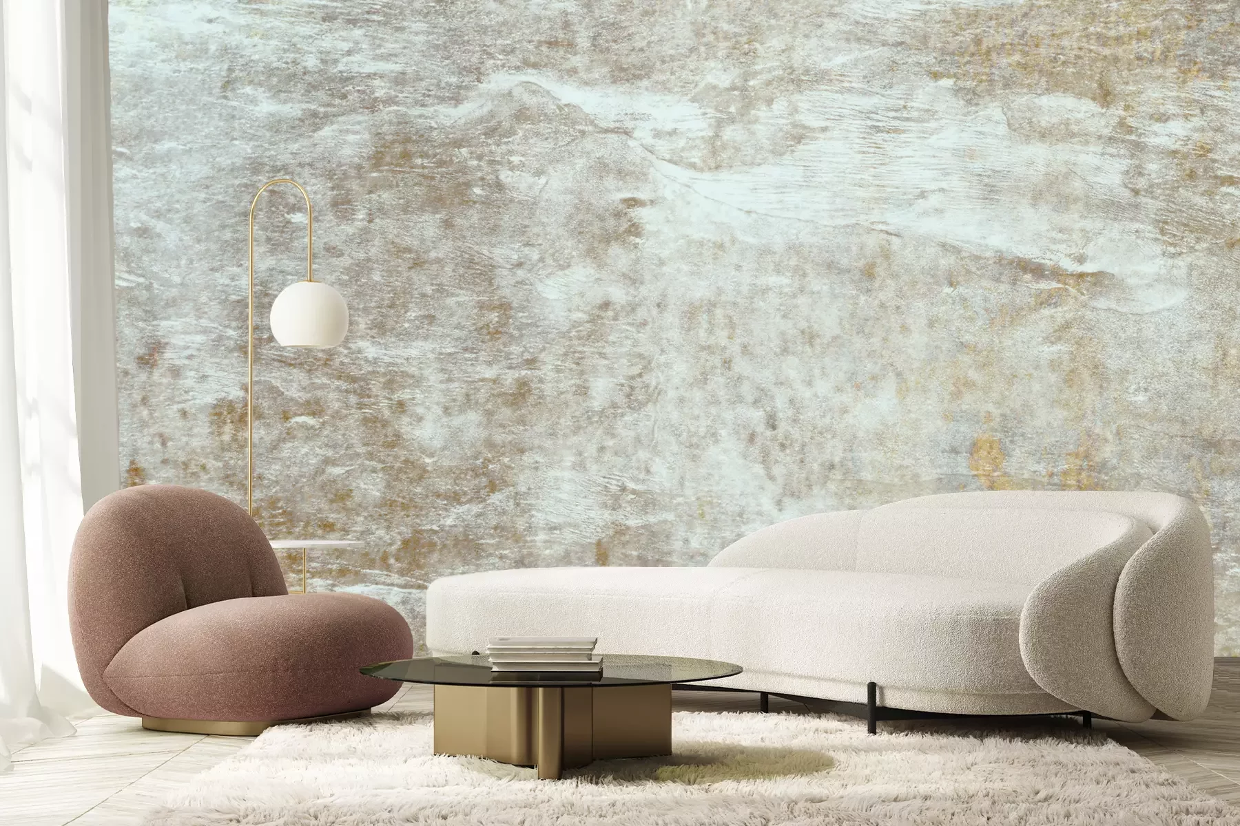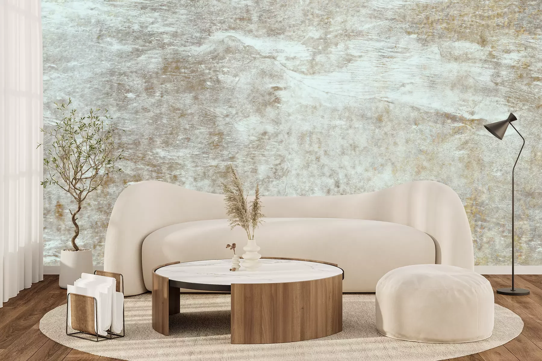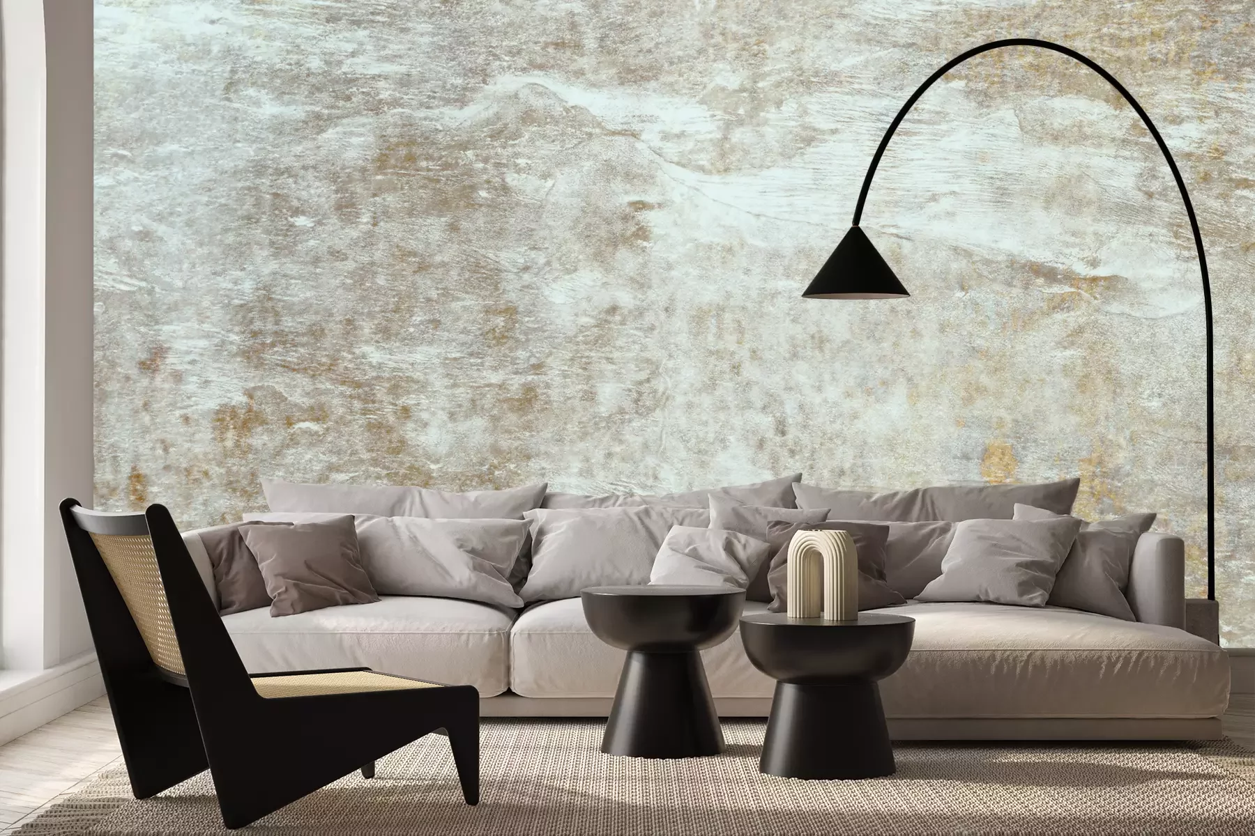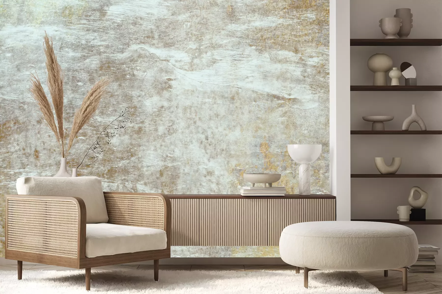 Het materiaal Premium+ is een gestructureerd vinyl op vlies met een gewicht van 255 g/m², dat kleine oneffenheden in de muur effectief camoufleert. De subtiele structuur van fijn zand geeft het oppervlak een exclusieve uitstraling, terwijl de halfmatte afwerking de diepte van de kleuren benadrukt. Het materiaal is dampdoorlatend, waardoor het ook in de keuken en badkamer kan worden gebruikt. De maximale breedte van één baan bedraagt 100 cm – bij grotere afmetingen wordt het fotobehang in meerdere gelijke banen verdeeld. De lijm wordt direct op de muur aangebracht en het behang wordt rand-aan-rand geplakt, wat zorgt voor een esthetisch resultaat zonder zichtbare naden. Het oppervlak kan gemakkelijk worden schoongemaakt door het voorzichtig af te nemen met een vochtige doek.