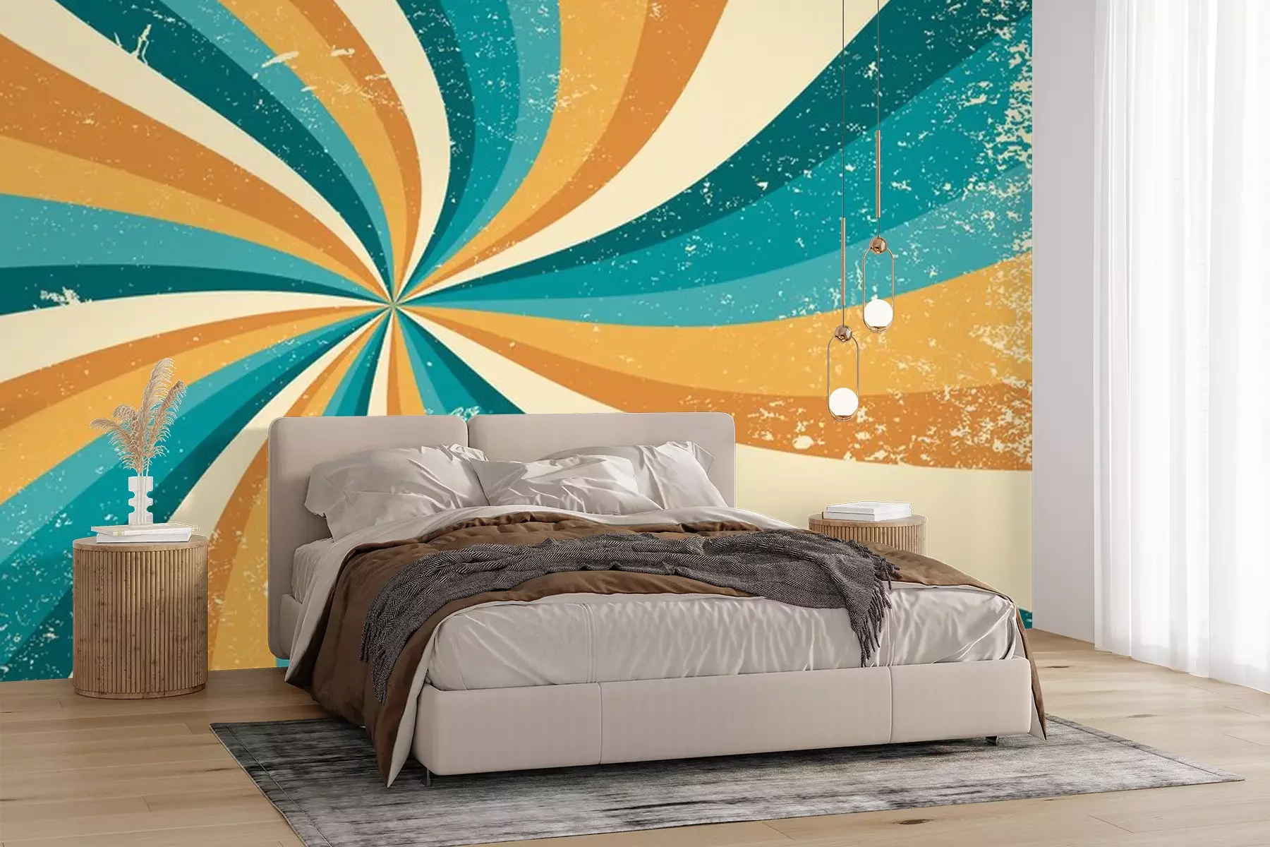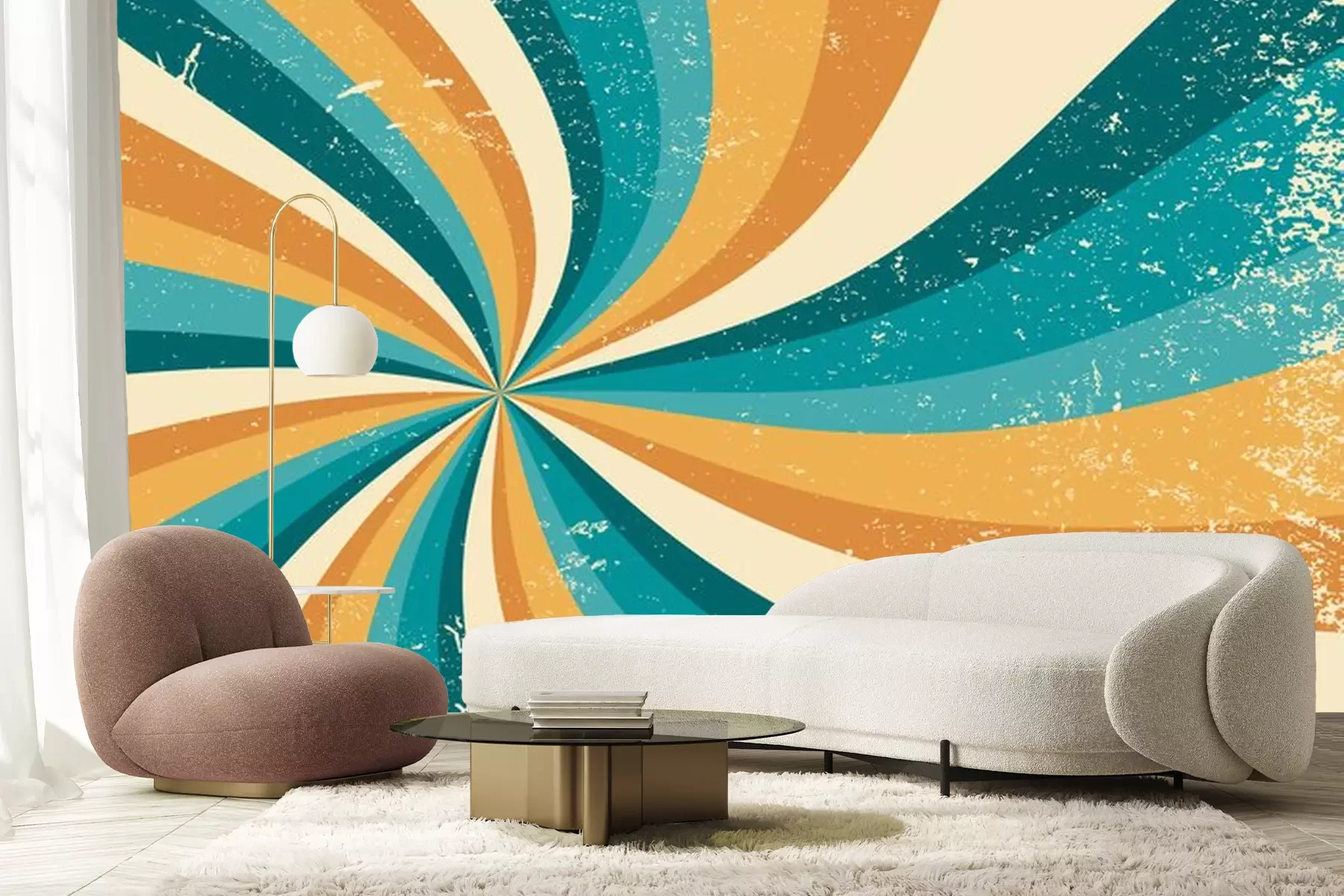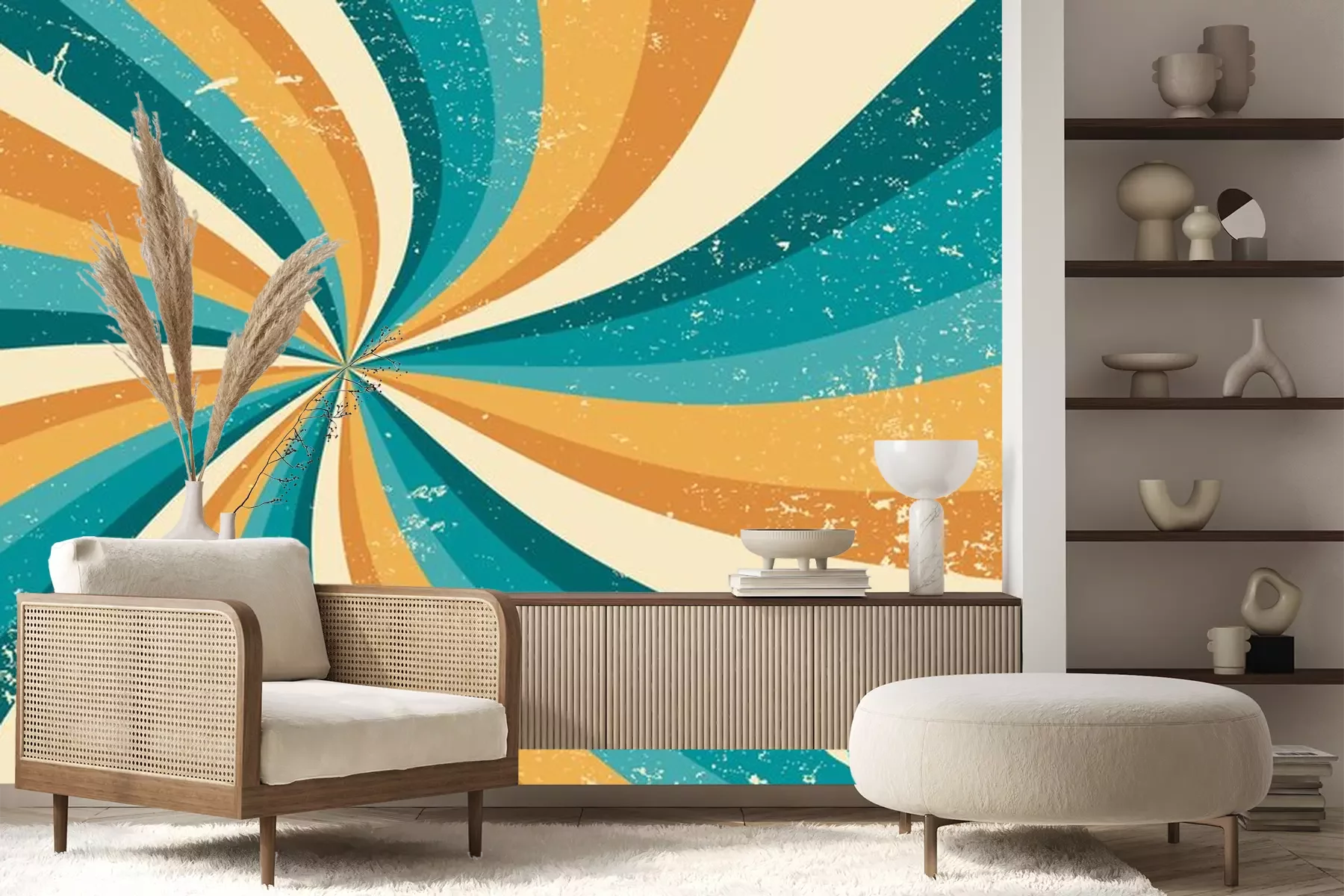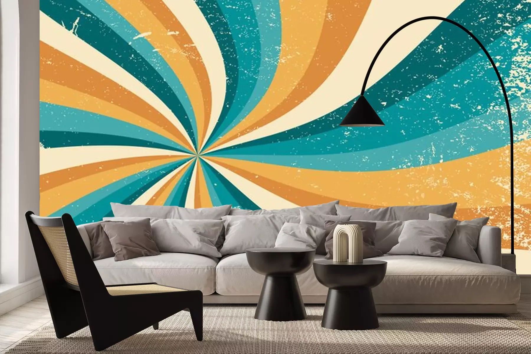 Fotobehang retro starburst sunburst background pattern and grunge textured vintage color palette of orange yellow and blue green in spiral or swirled radial striped vector design